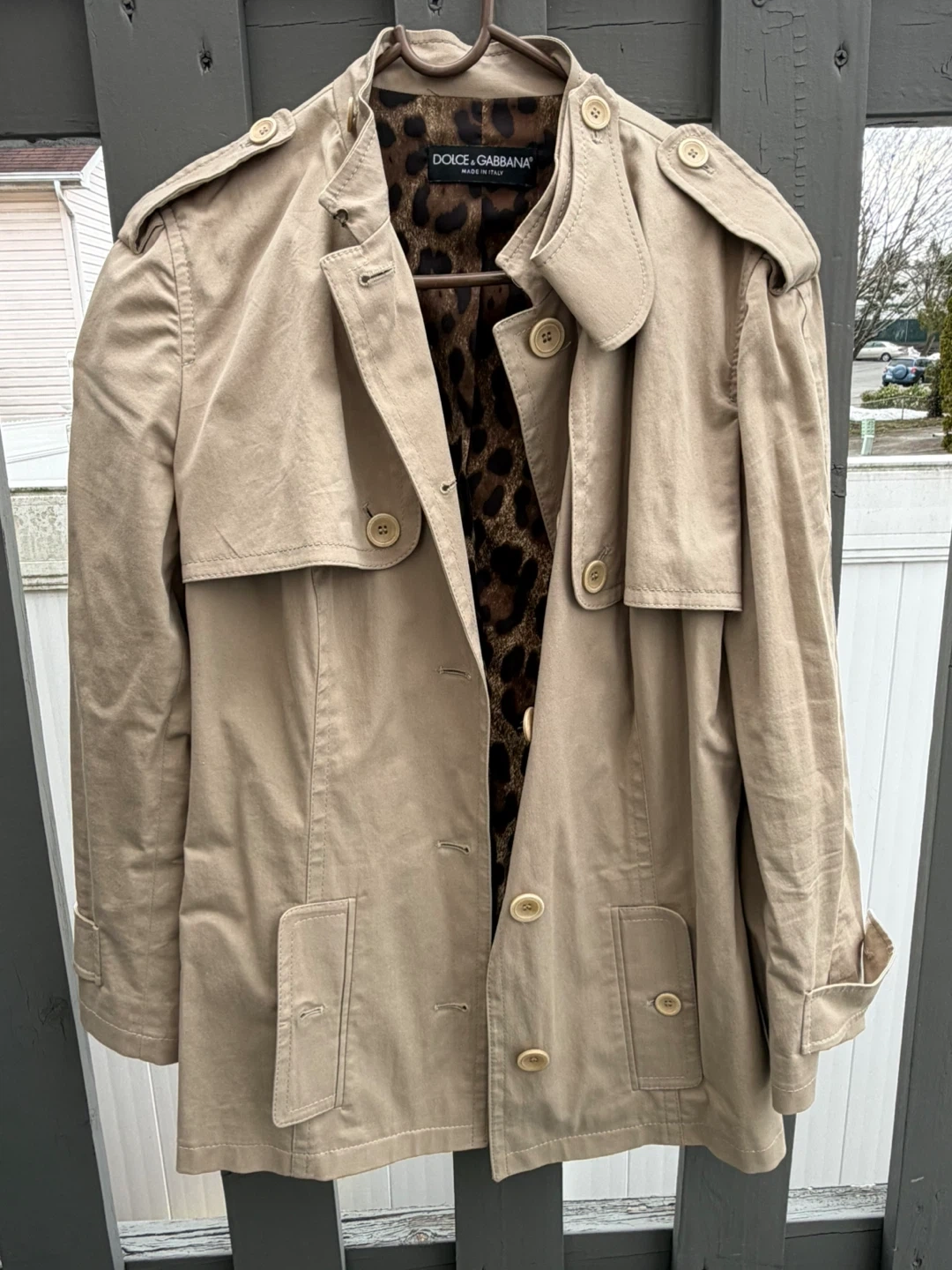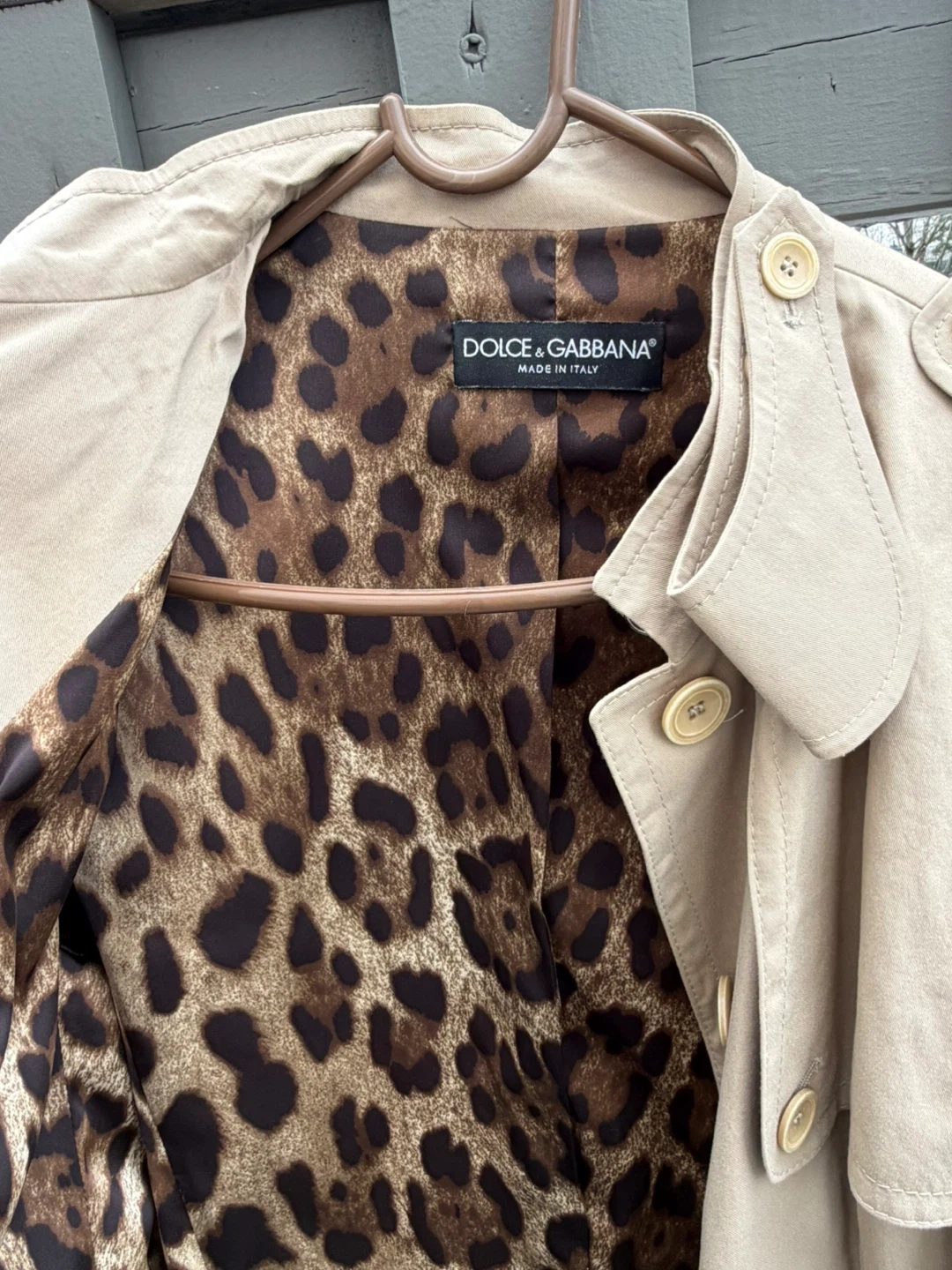 Classic tan trench coat by Dolce & Gabbana. Fully lined with a bold leopard print. Size 46. Made in Italy. Barely worn, otherwise kept in storage. Ready for its next vintage lover owner! Meet available for any borough.