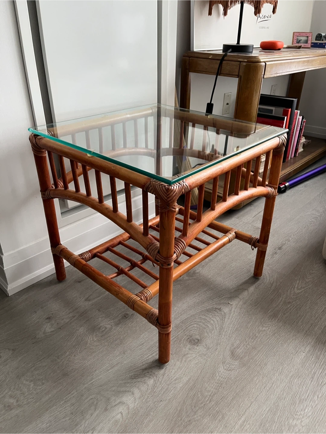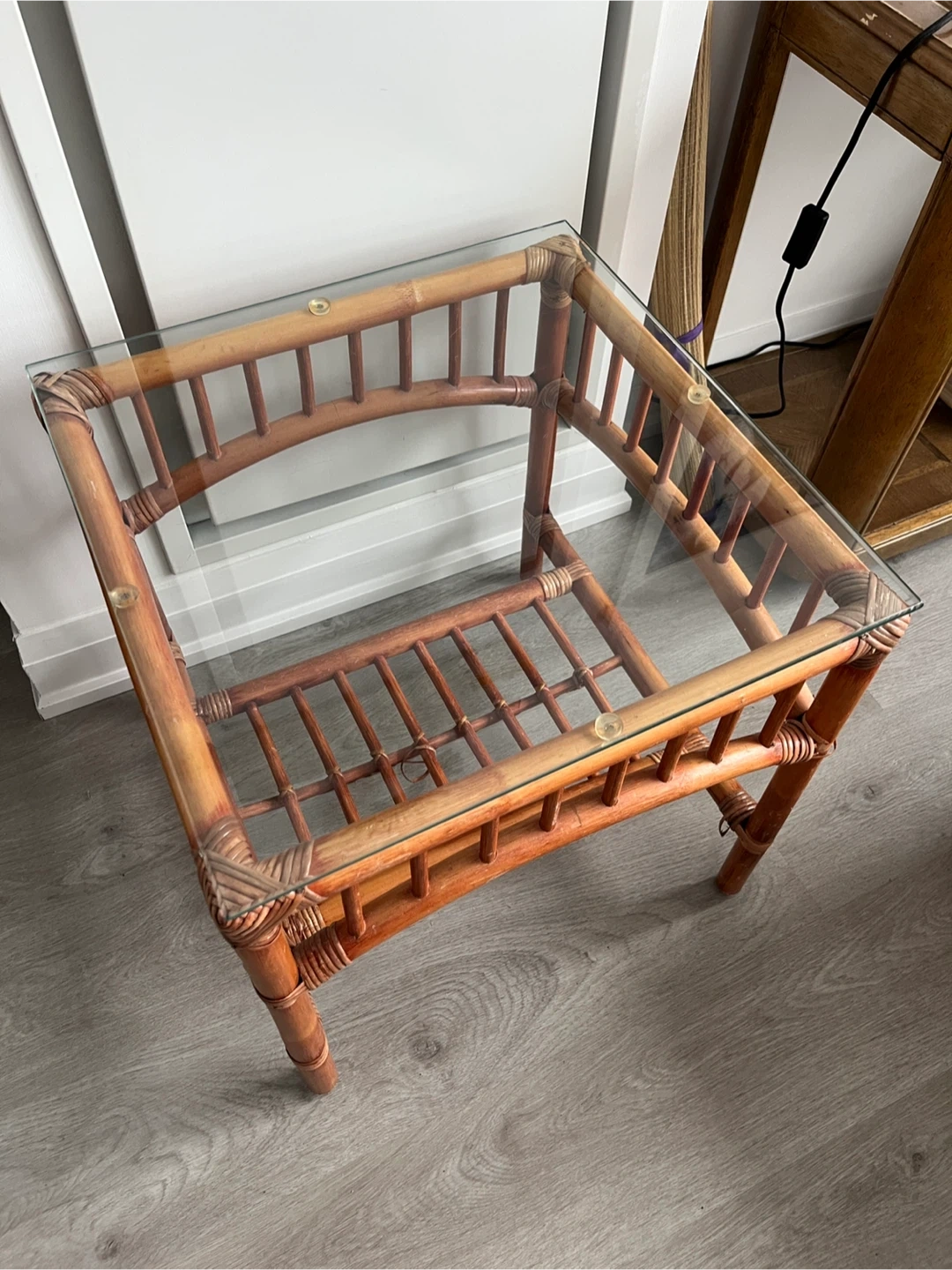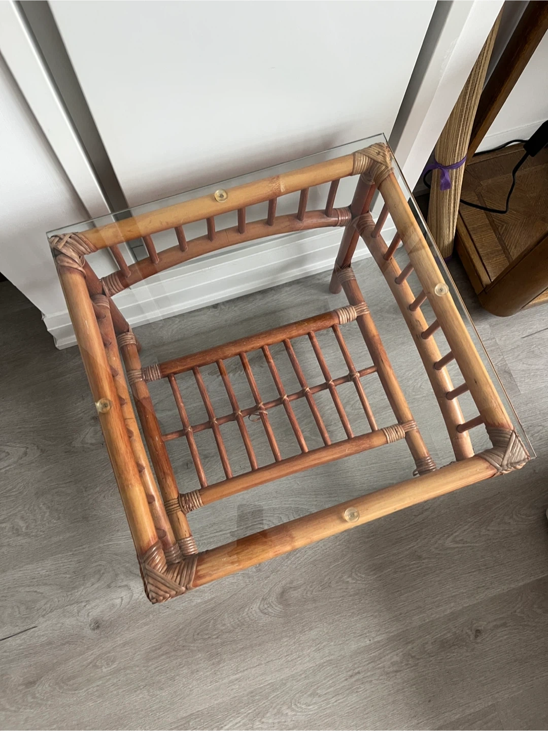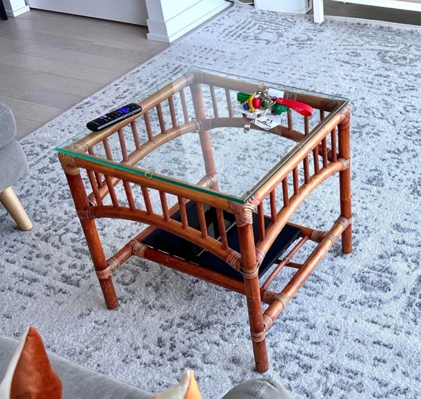 Charming and unique coffee table with a natural rattan frame and a clear glass top. It features a lower shelf for extra storage. This piece adds a touch of relaxed elegance to any room! Very minor wear and tear.