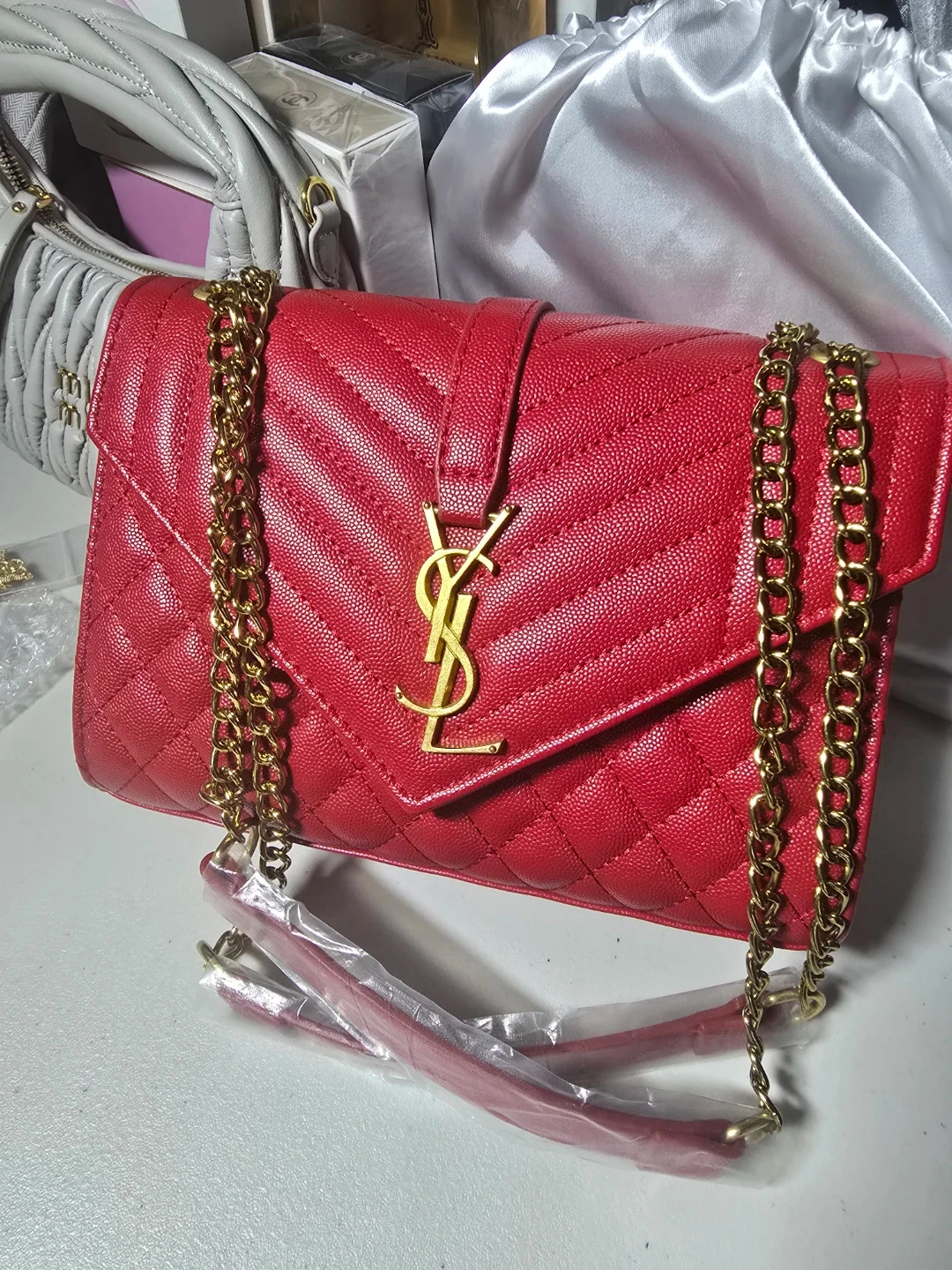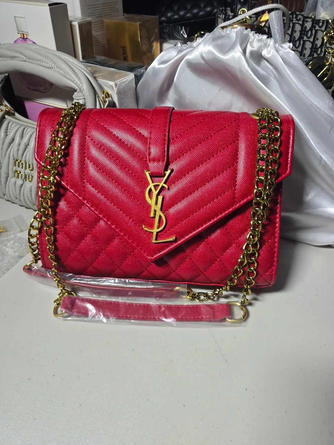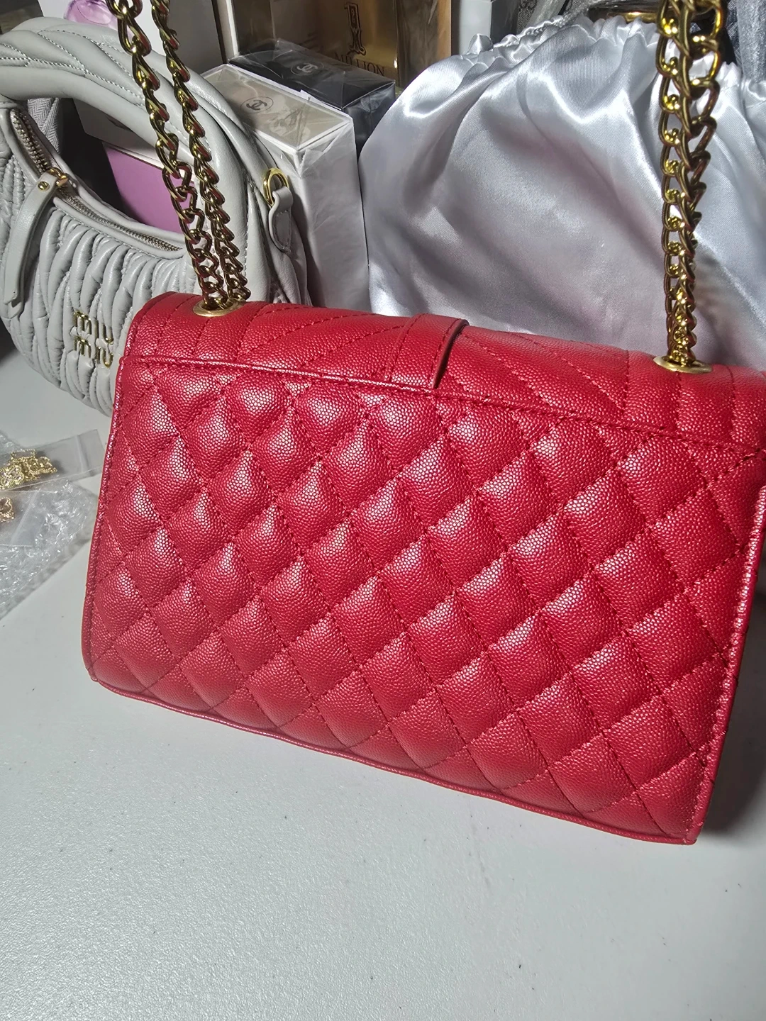 This is a red quilted shoulder bag with gold chain accents. It features a chevron pattern and a prominent gold logo closure. The bag includes a detachable shoulder strap.