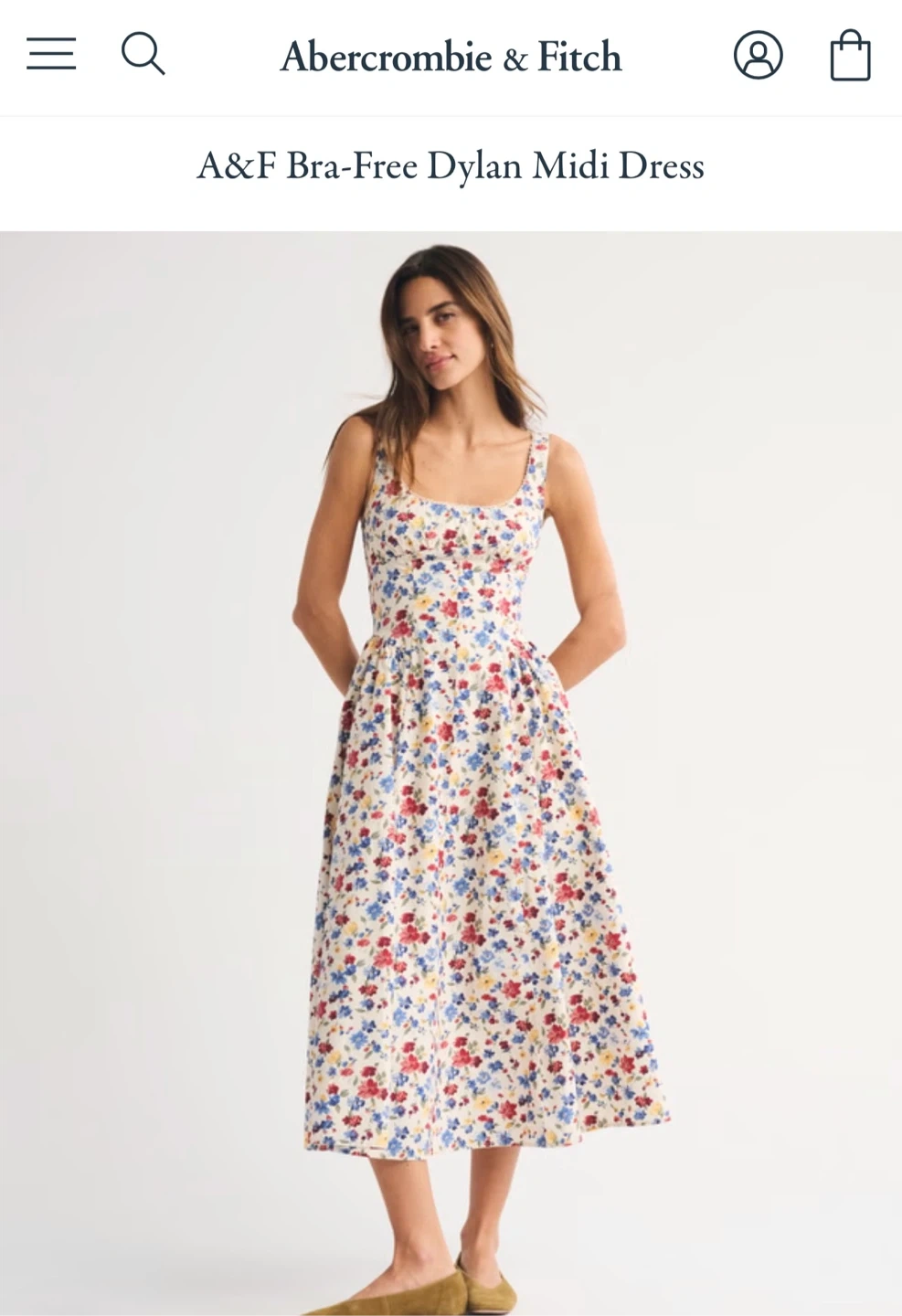 This is an Abercrombie & Fitch Bra-Free Dylan Midi Dress. It features a colourful floral print. It's a midi length dress.