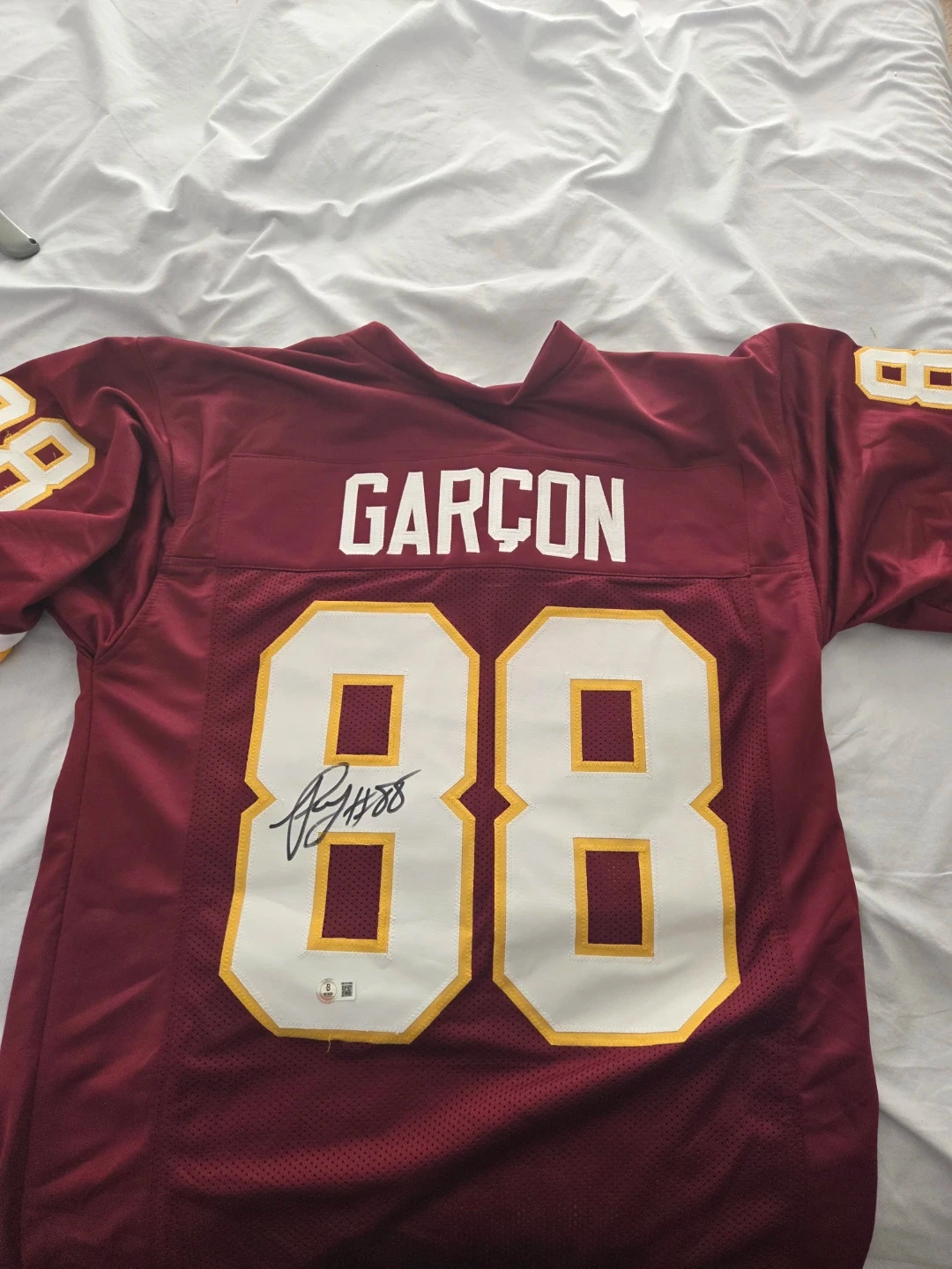 This is a Washington Football Team jersey featuring "GARCON" and the number "88" on the back. It's signed by the player. The jersey is maroon with gold and white trim. It is also Beckett witness certified.