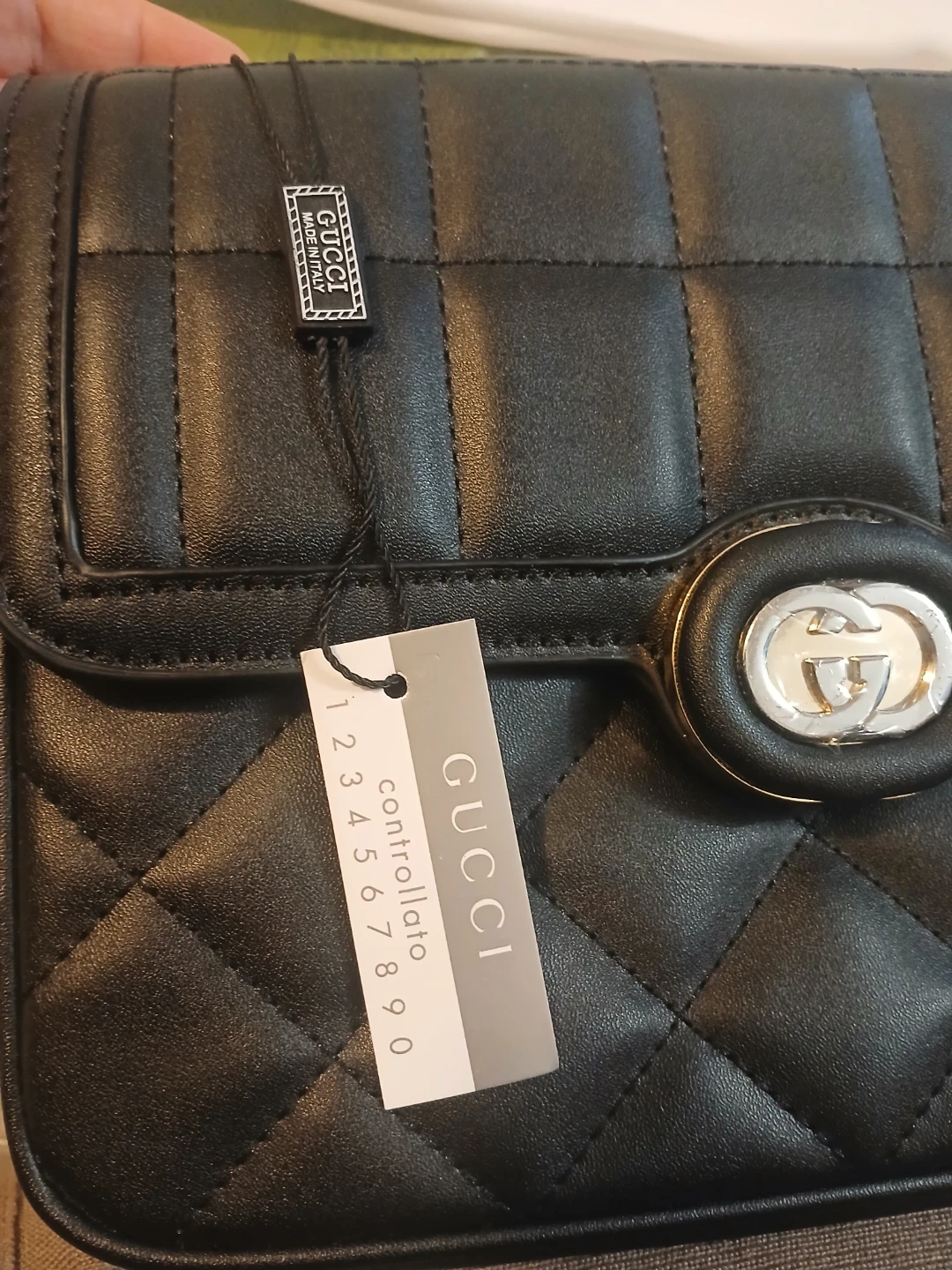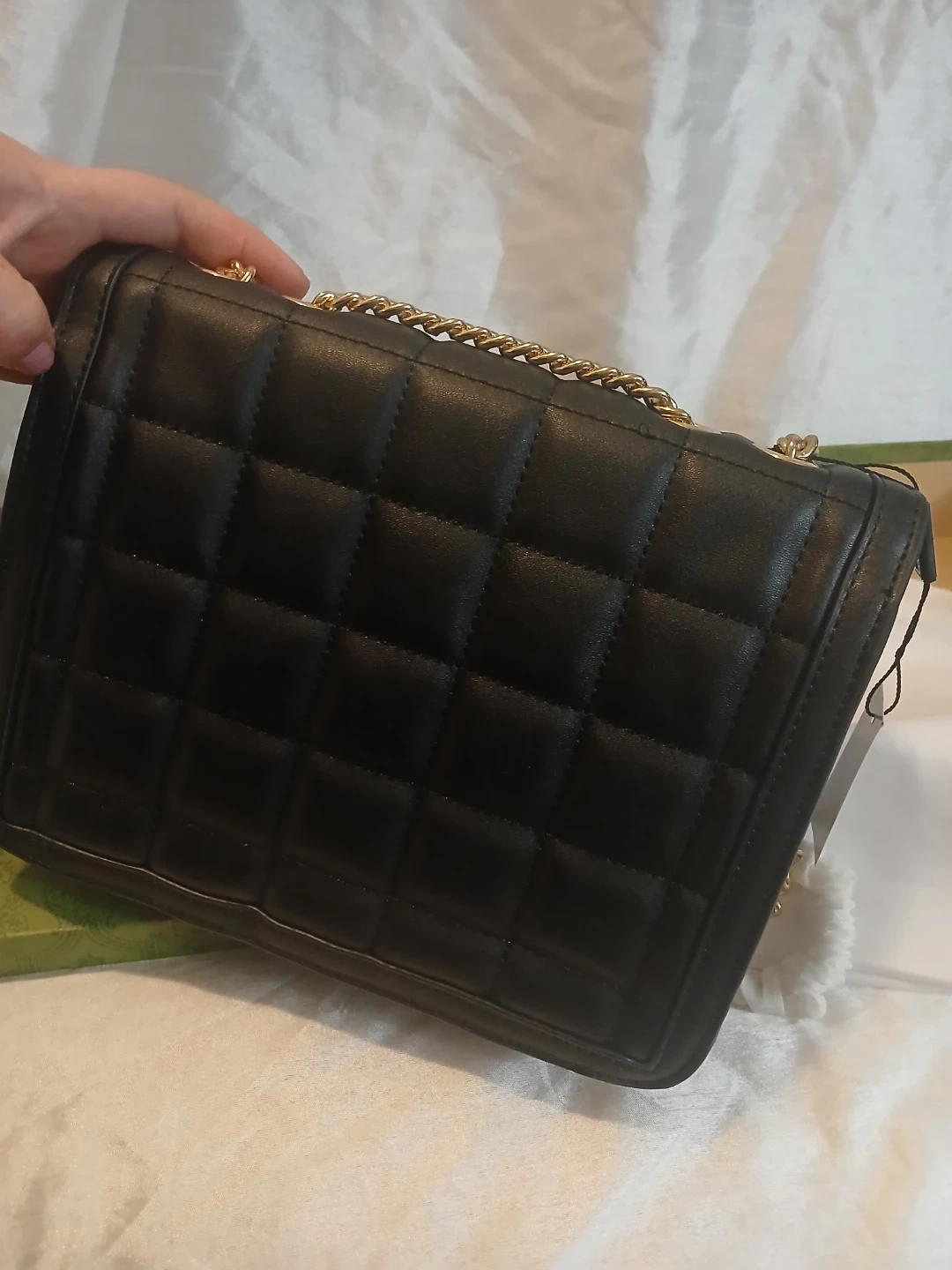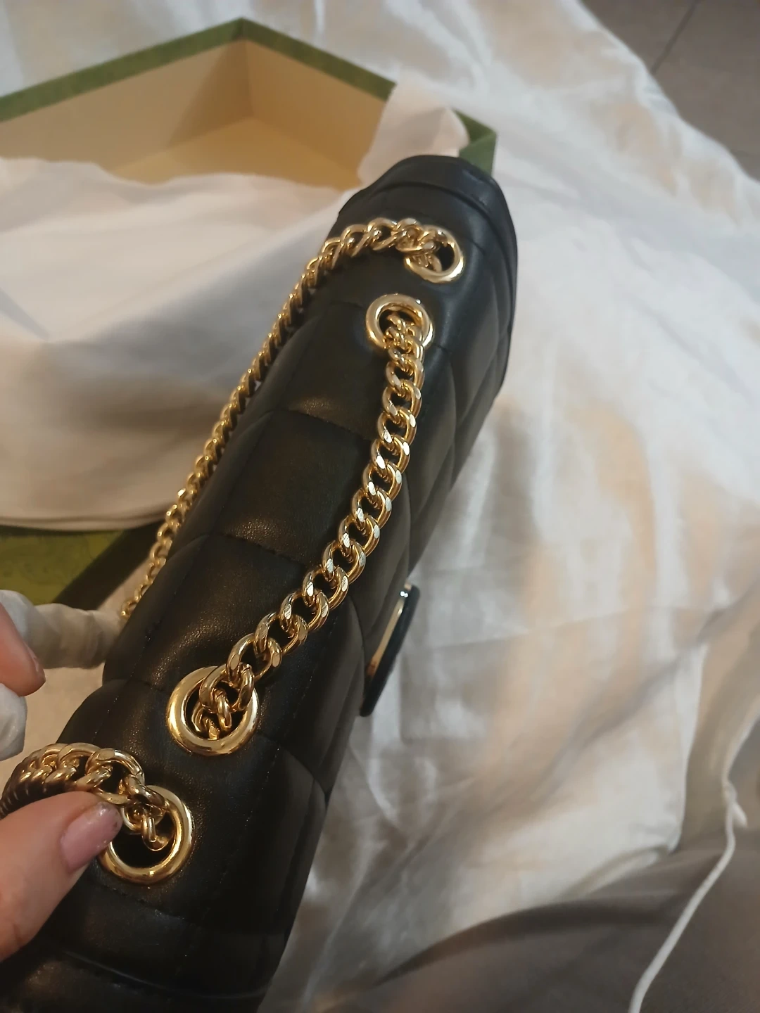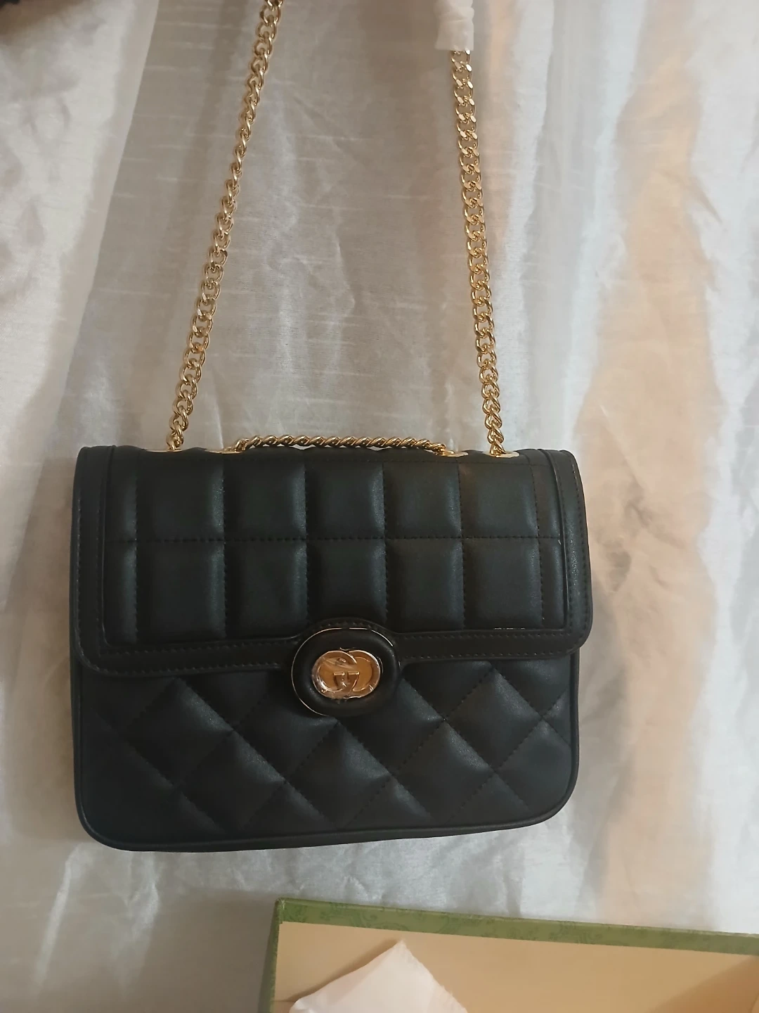 This is a black quilted leather shoulder bag from Gucci. It features a gold chain strap and a distinctive GG logo closure. Made in Italy. Comes with original box.