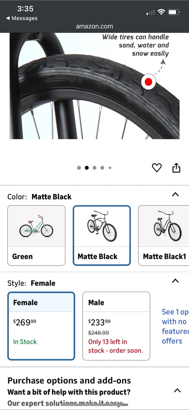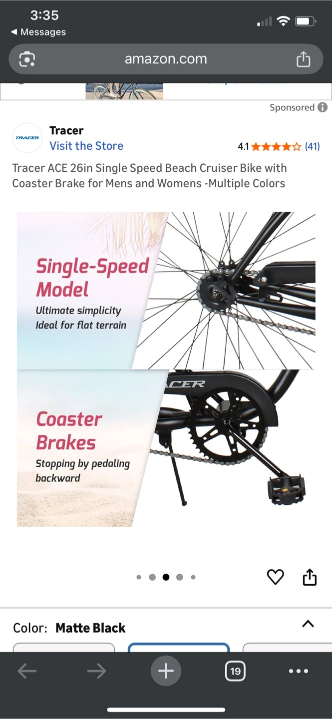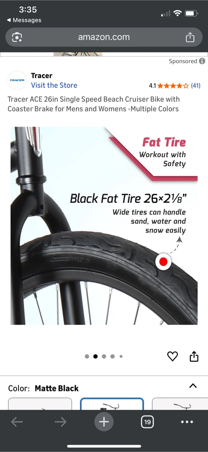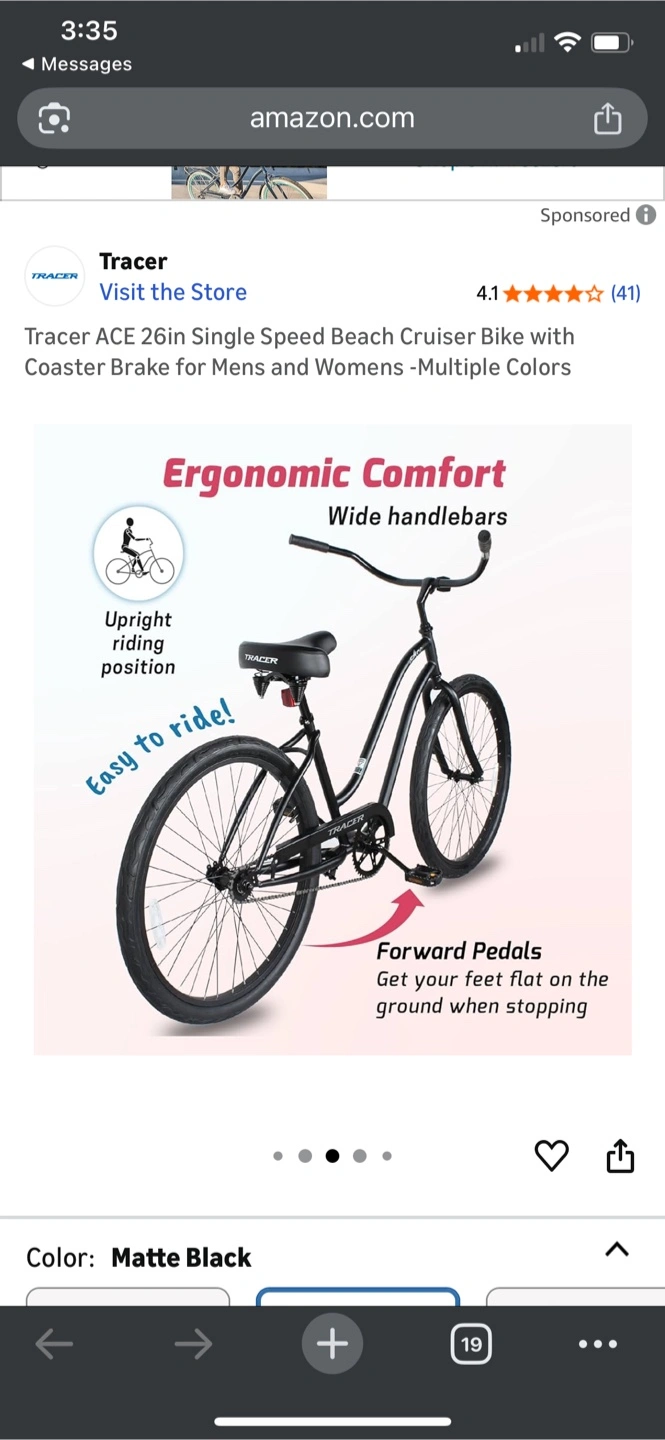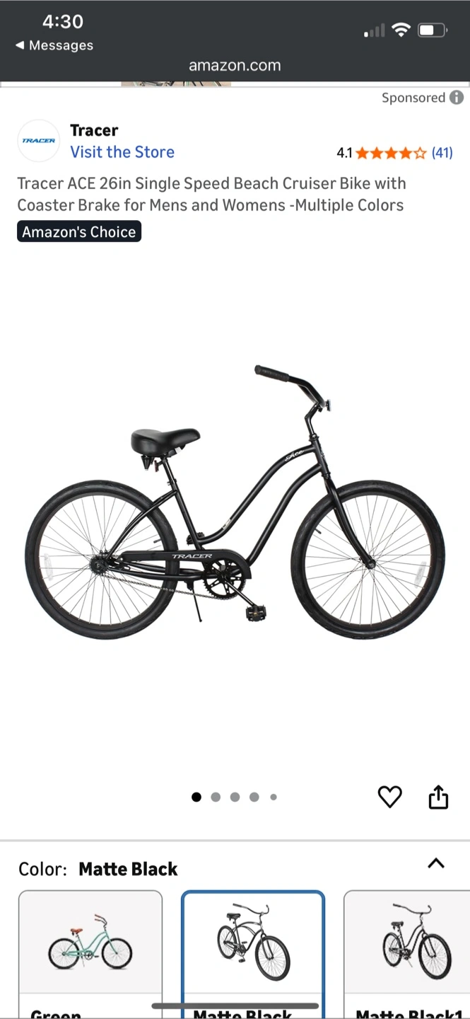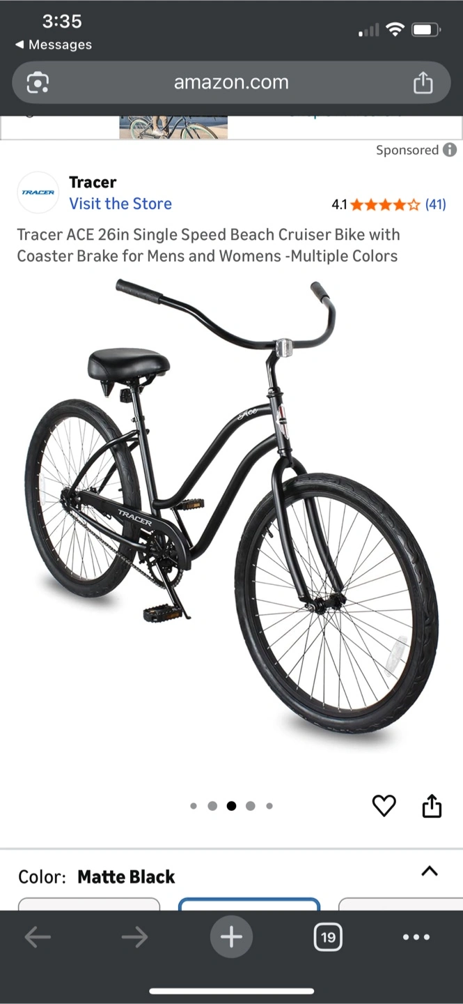 Selling a Tracer ACE 26-inch single-speed beach cruiser bike in matte black. This bike features coaster brakes for easy stopping and an ergonomic design for comfortable riding. The fat tires are great for handling sand, water, and snow. It's a single-speed model, making it simple and ideal for flat terrain. Almost brand new, used twice, features comfortable seat and leg breaks. Selling because of a move. Originally 270.