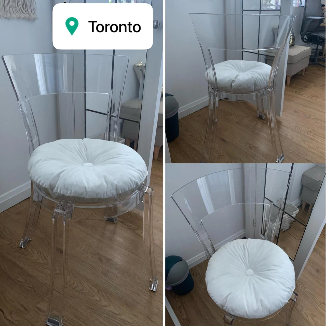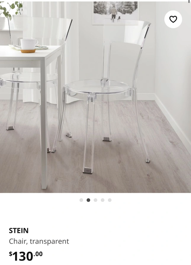 MOVING SALE selling some furniture like-new Transparent Chair STEIN from IKEA Color: Transparent Condition: Like-new (1 1/2 months old) Regular Price: 130 CAD at IKEA Pickup location: near Davenport Rd and Bathurst St. Product details: Comfortable to sit on thanks to the bowl-shaped seat and rounded shape of the backrest. Lightweight, easy to lift and move. Can be stacked to save space when stored. No assembly required. check my listings for other items on sale. thanks for visiting.