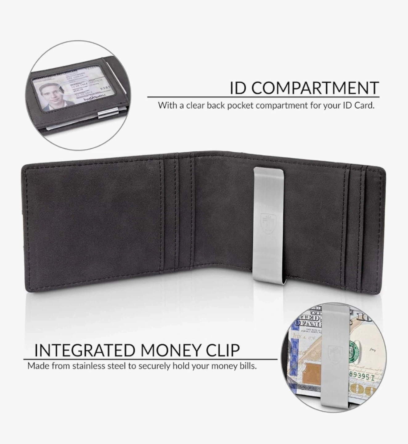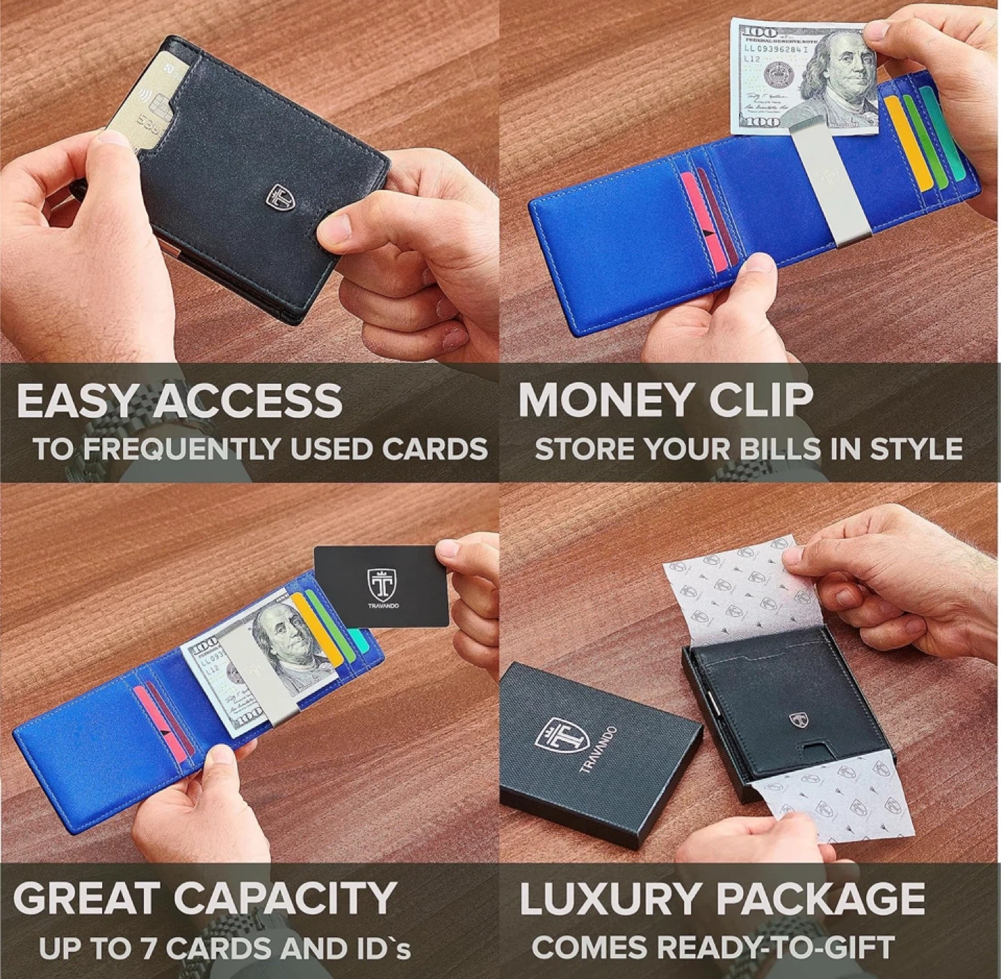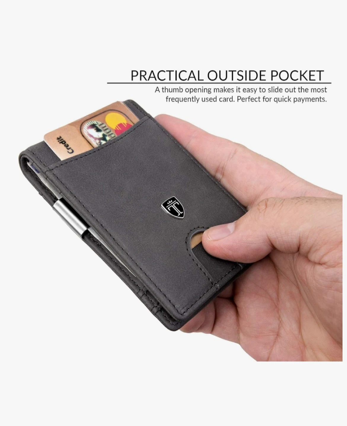 10Selling a sleek Travando wallet in black! It features a super slim design and an integrated money clip made from stainless steel. It can hold up to 7 cards and IDs with easy access to frequently used cards. It also has a practical outside pocket and an ID compartment