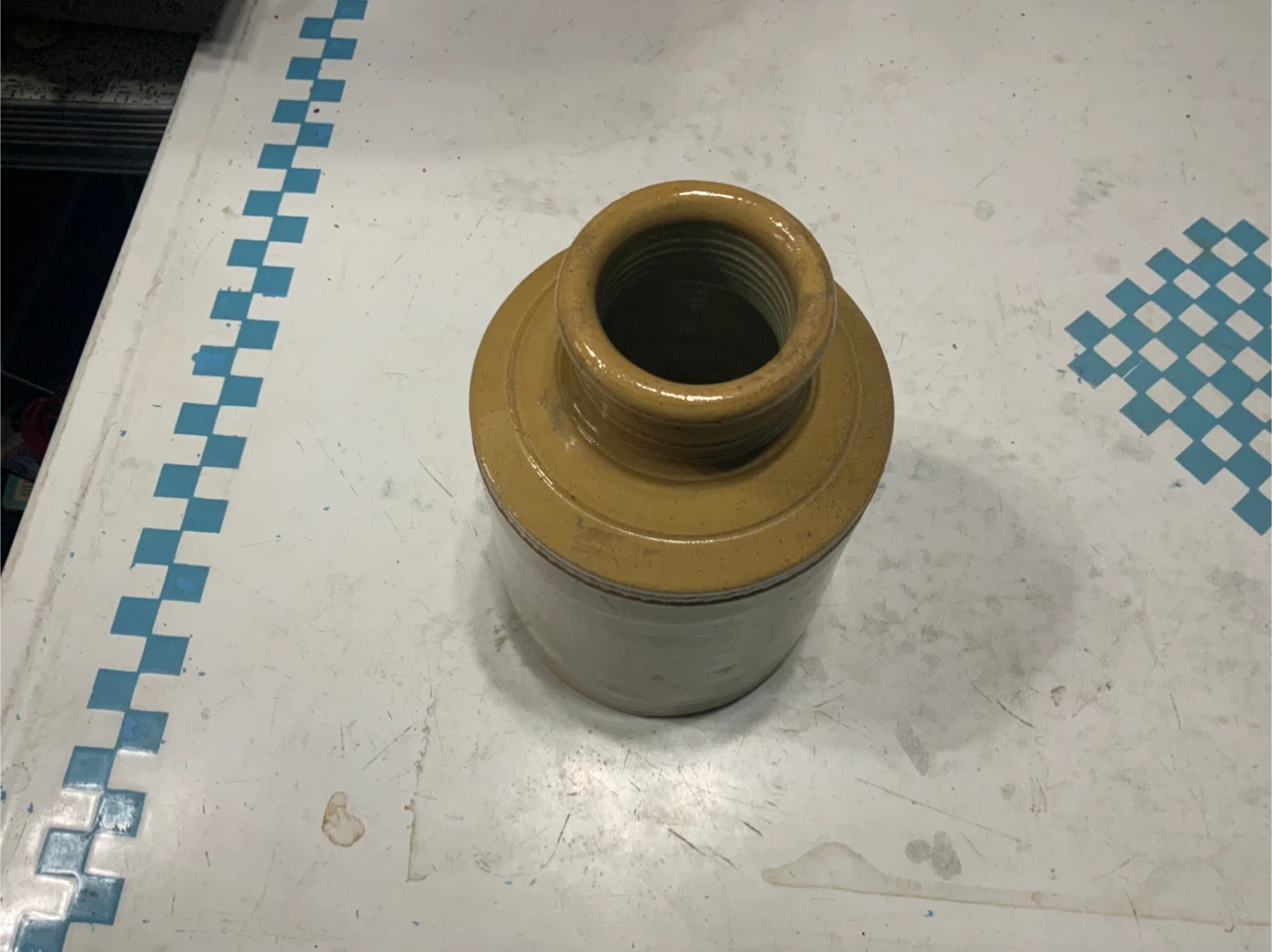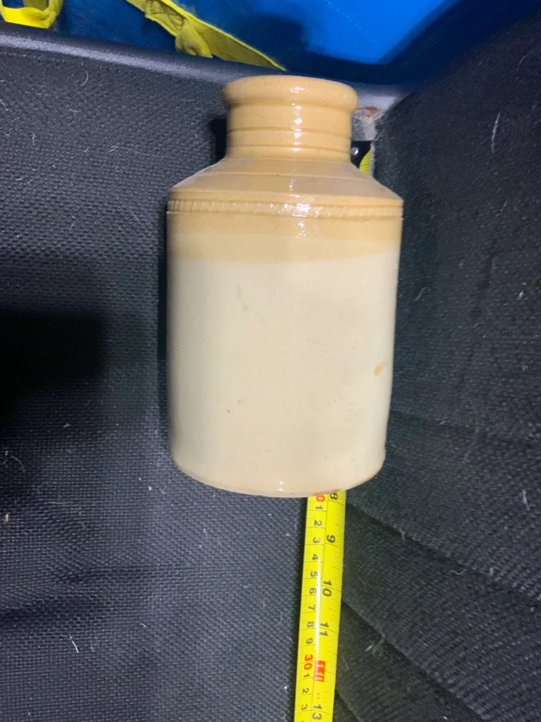 This is a vintage ceramic jar. It's a lovely beige and brown colour. The jar has a wide opening with a ribbed neck. It's useful for storing dry goods or as a decorative piece.