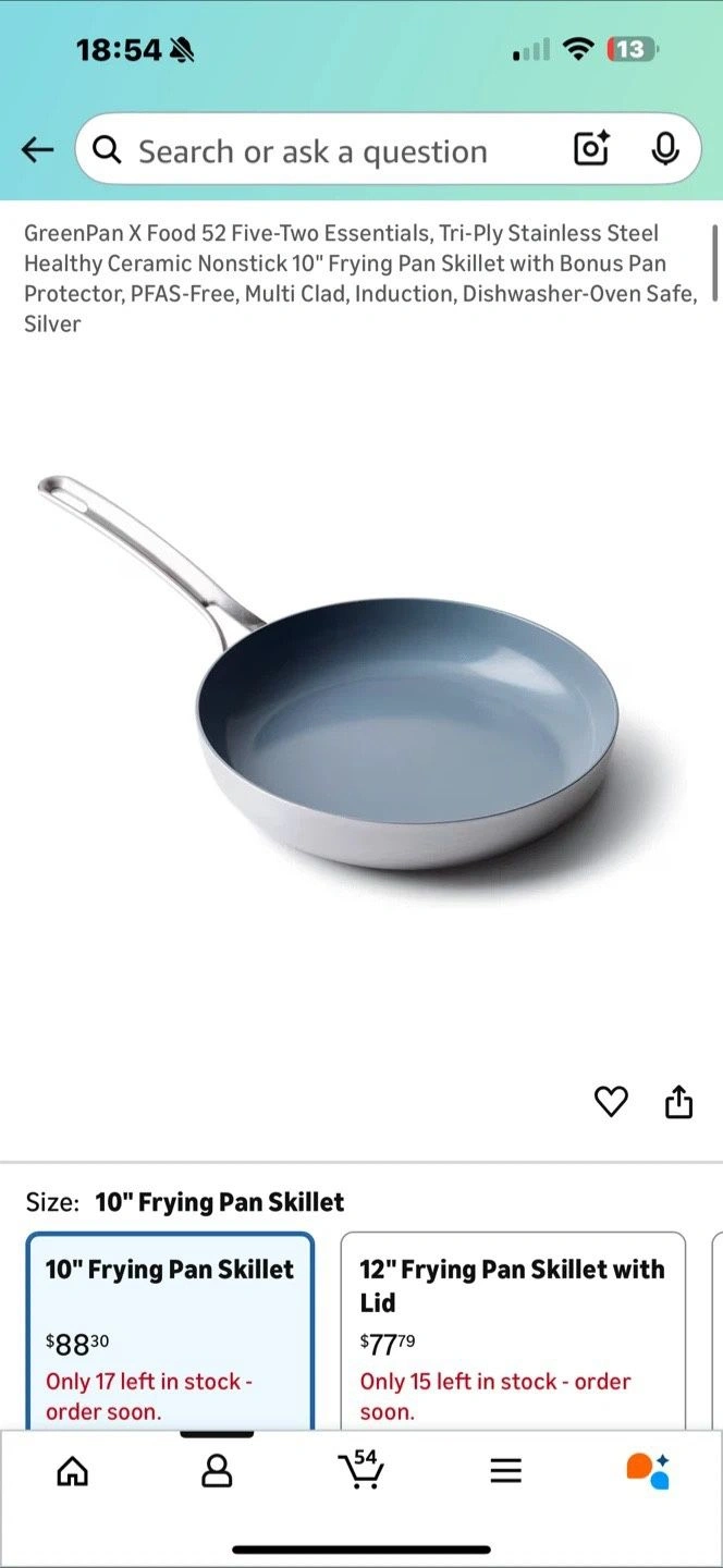 18GreenPan X Food 52 Five-Two Essentials, Tri-Ply Stainless Steel Healthy Ceramic Nonstick 10" Frying Pan Skillet with Bonus Pan Protector, PFAS-Free, Multi Clad, Induction, Dishwasher-Oven Safe, Silver Retail - $88 before tax