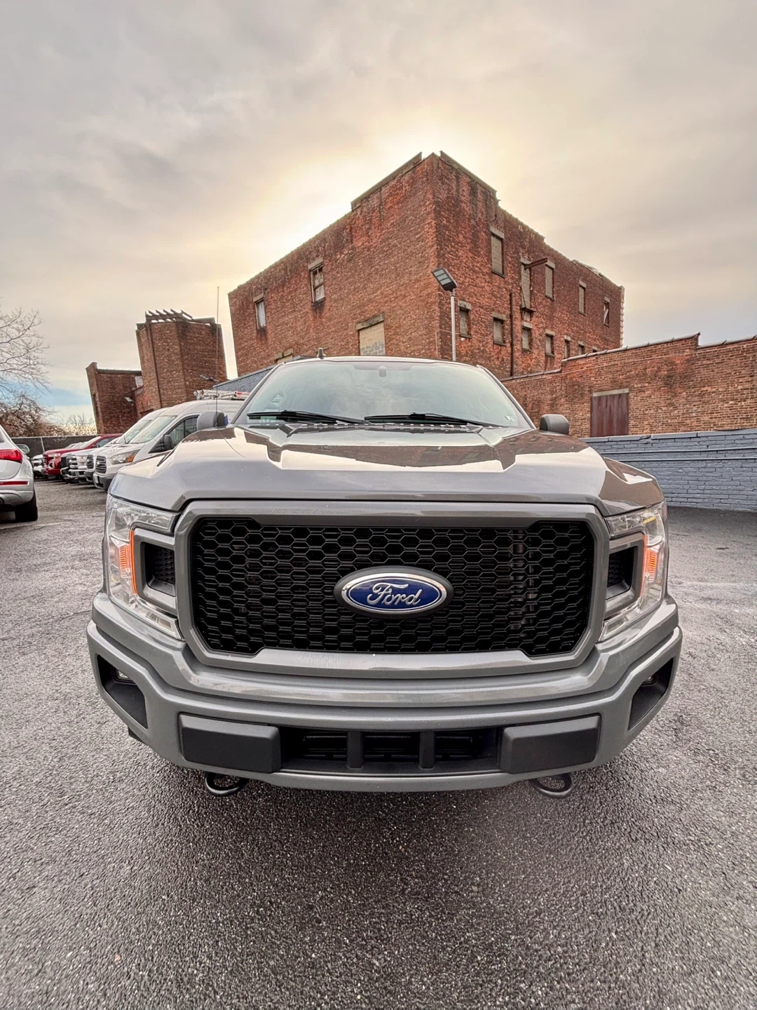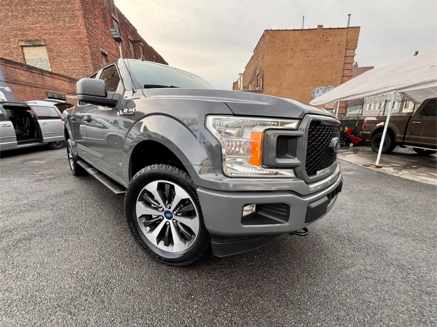 Gray Ford F-150 STX 4x4 pickup truck. Features a black grille and alloy wheels. This truck offers robust performance and utility.