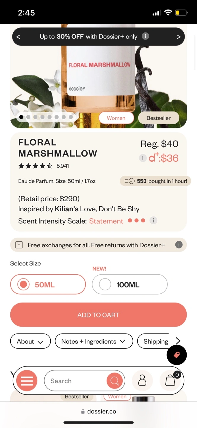 Floral Marshmallow Dossier. 50ml bottle. Inspired by Killian's Love, Don't Be Shy. New, never sprayed. Comes in original box. Retails for $40 plus tax (what I bought it for)