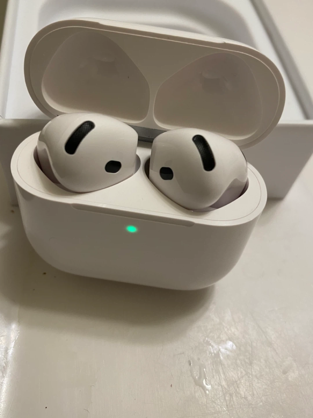 These are Apple AirPods 4 with active noise cancellation. They come with a charging case and a USB-C cable. Wireless headphones with charging case.
