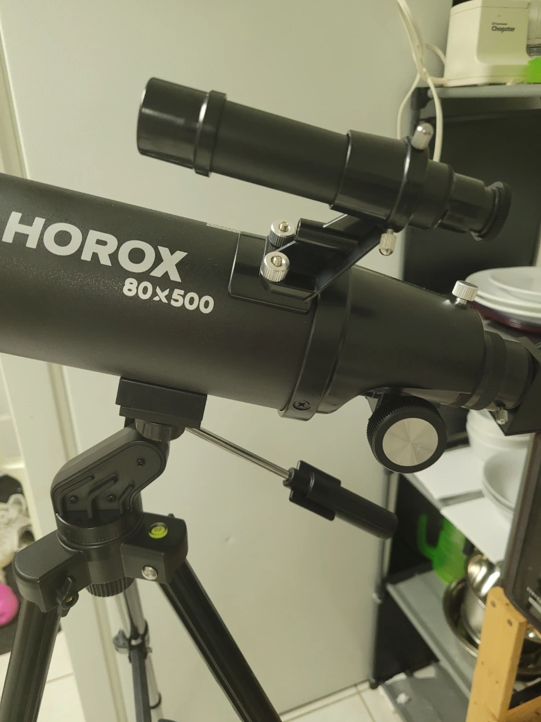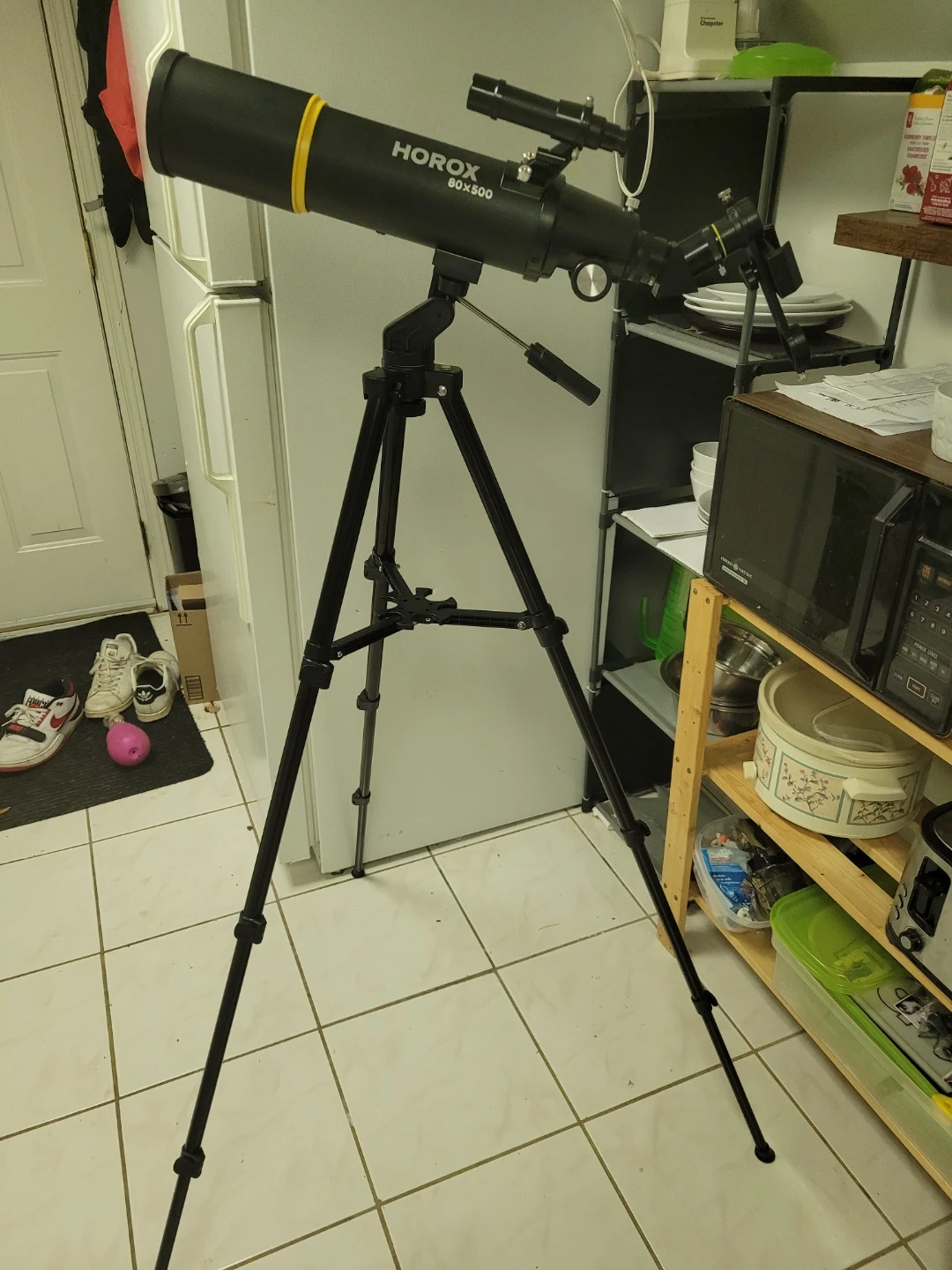 HOROX 80x500mm telescope. It includes a tripod for stable viewing. This telescope is great for observing distant objects. Includes backpack..