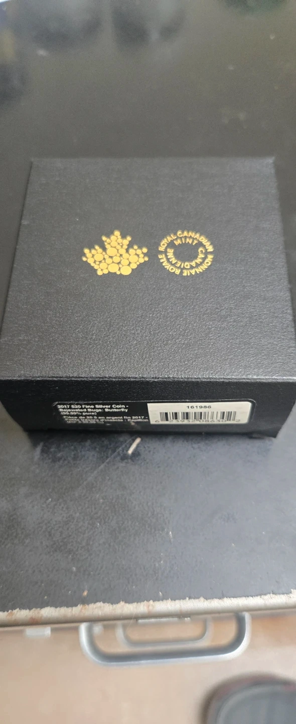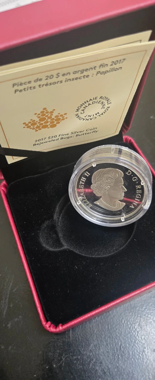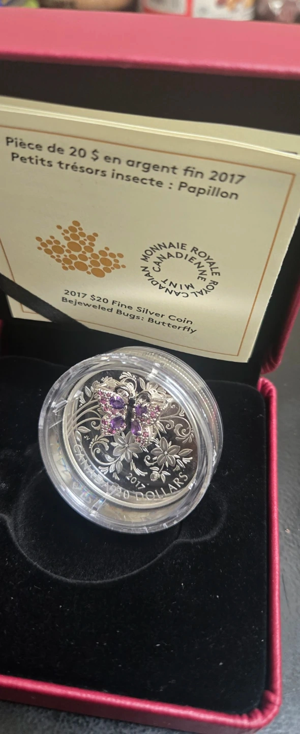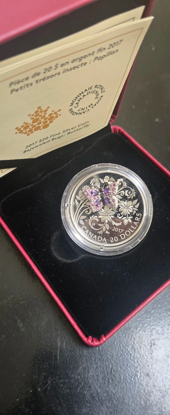 This is a 2017 $20 Fine Silver Coin from the Royal Canadian Mint, part of the Bejeweled Bugs series. It features a butterfly design with colourful gemstones. Includes original box and documentation.