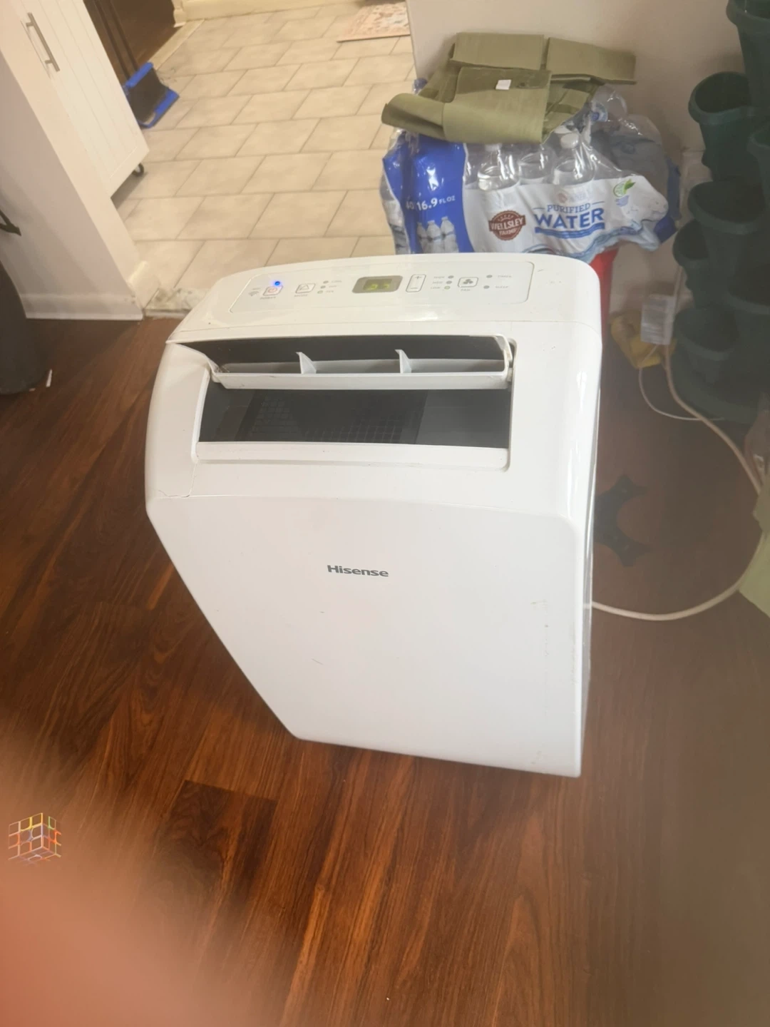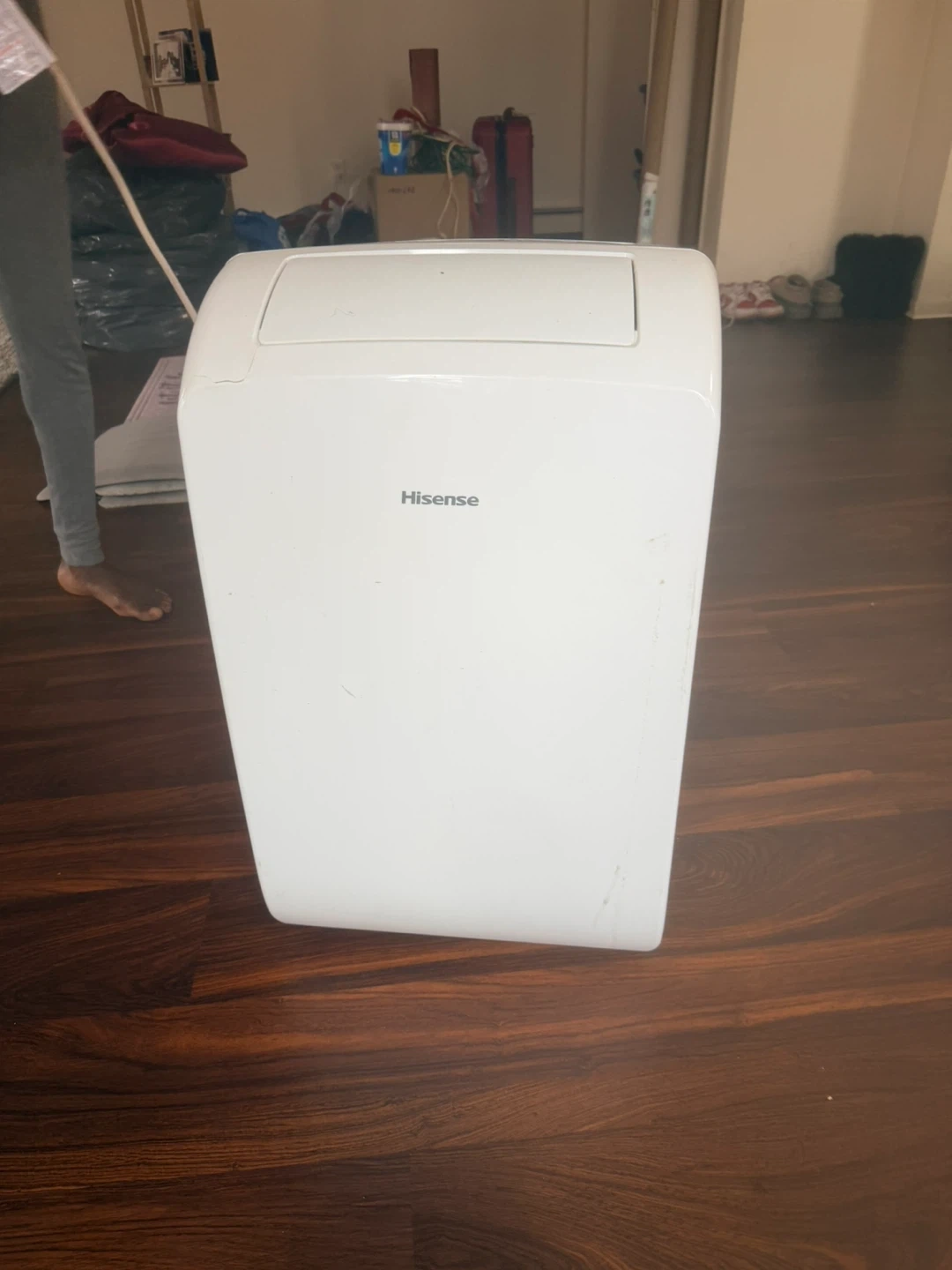 This is a white Hisense portable air conditioner. It's a useful appliance for cooling down a room. This unit is designed for portable use.