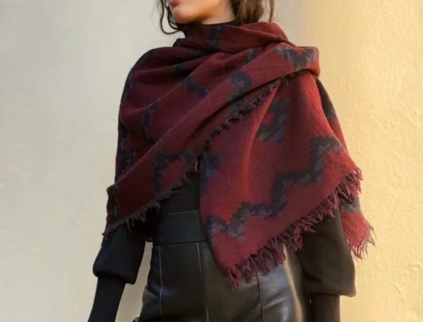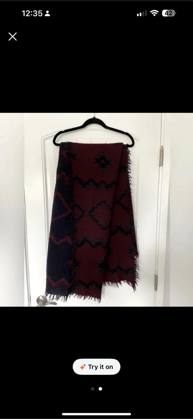 This is an Aritzia Wilfred blanket scarf. It features a maroon and navy pattern with fringe detailing. It's a large woven throw blanket that's perfect for keeping cozy.