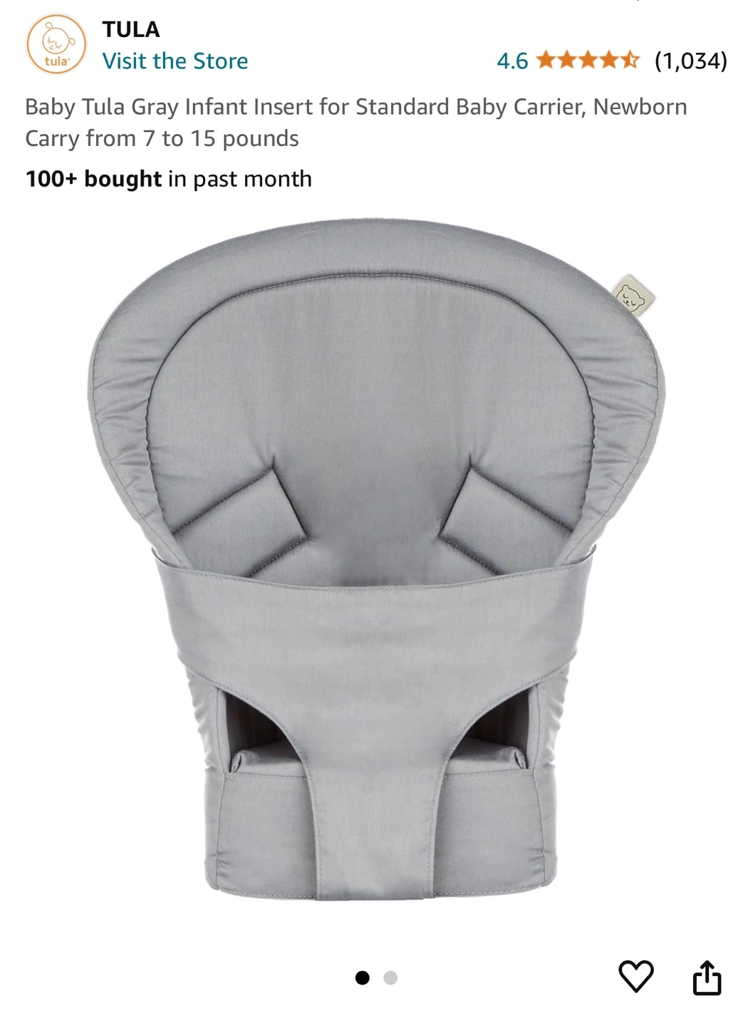 Gray infant insert for standard baby carrier. Carry from 7 to 15 pounds.