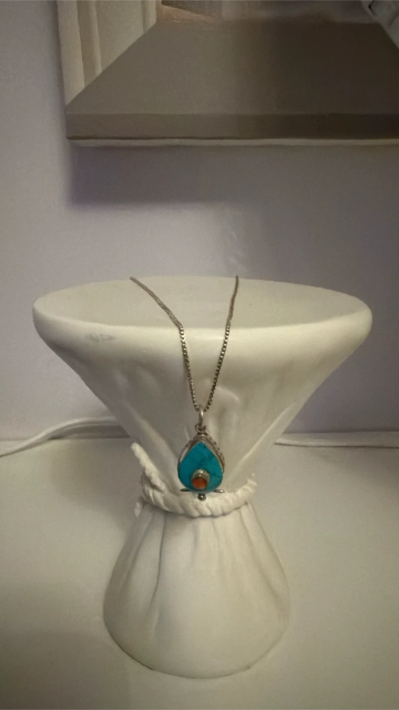 This is a lovely silver teardrop pendant necklace! It features a turquoise stone with a coral accent.