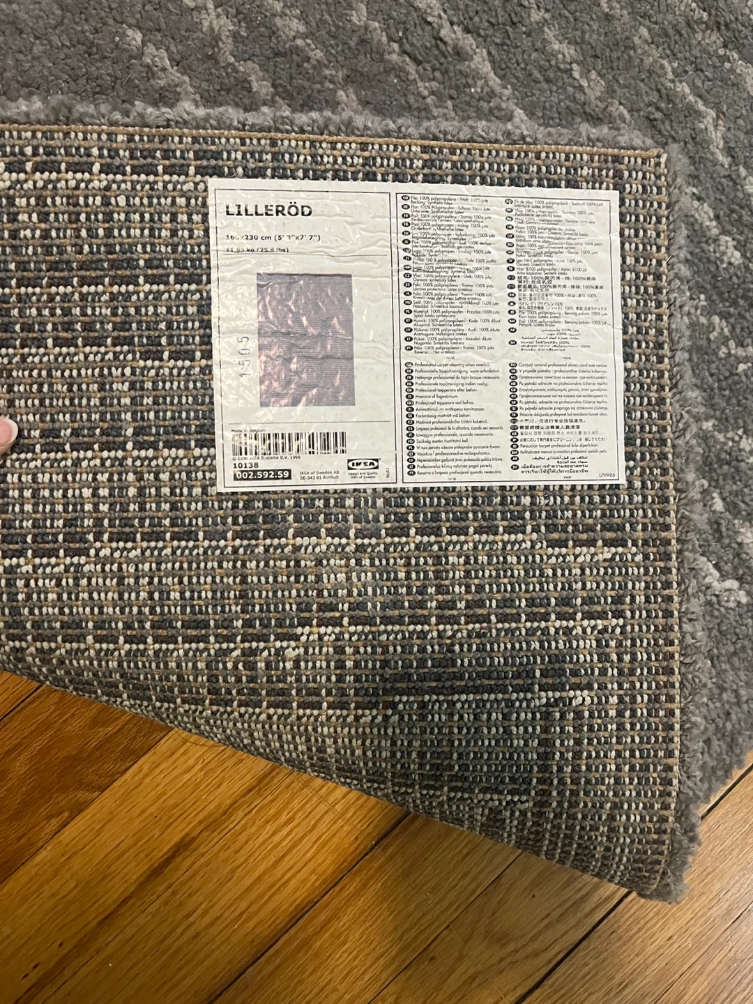 This is an IKEA LILLERÖD rug in gray. It measures 130 cm by 230 cm (5' 1" x 7' 7"). The rug is made of 100% polypropylene.