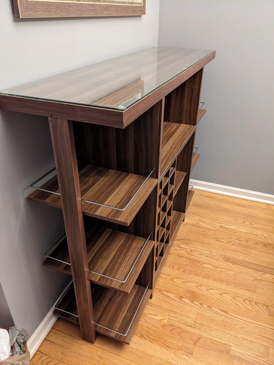 Bar cabinet with a wood frame and a glass top. Metal railings around the shelves. Cabinet for wine bottles.