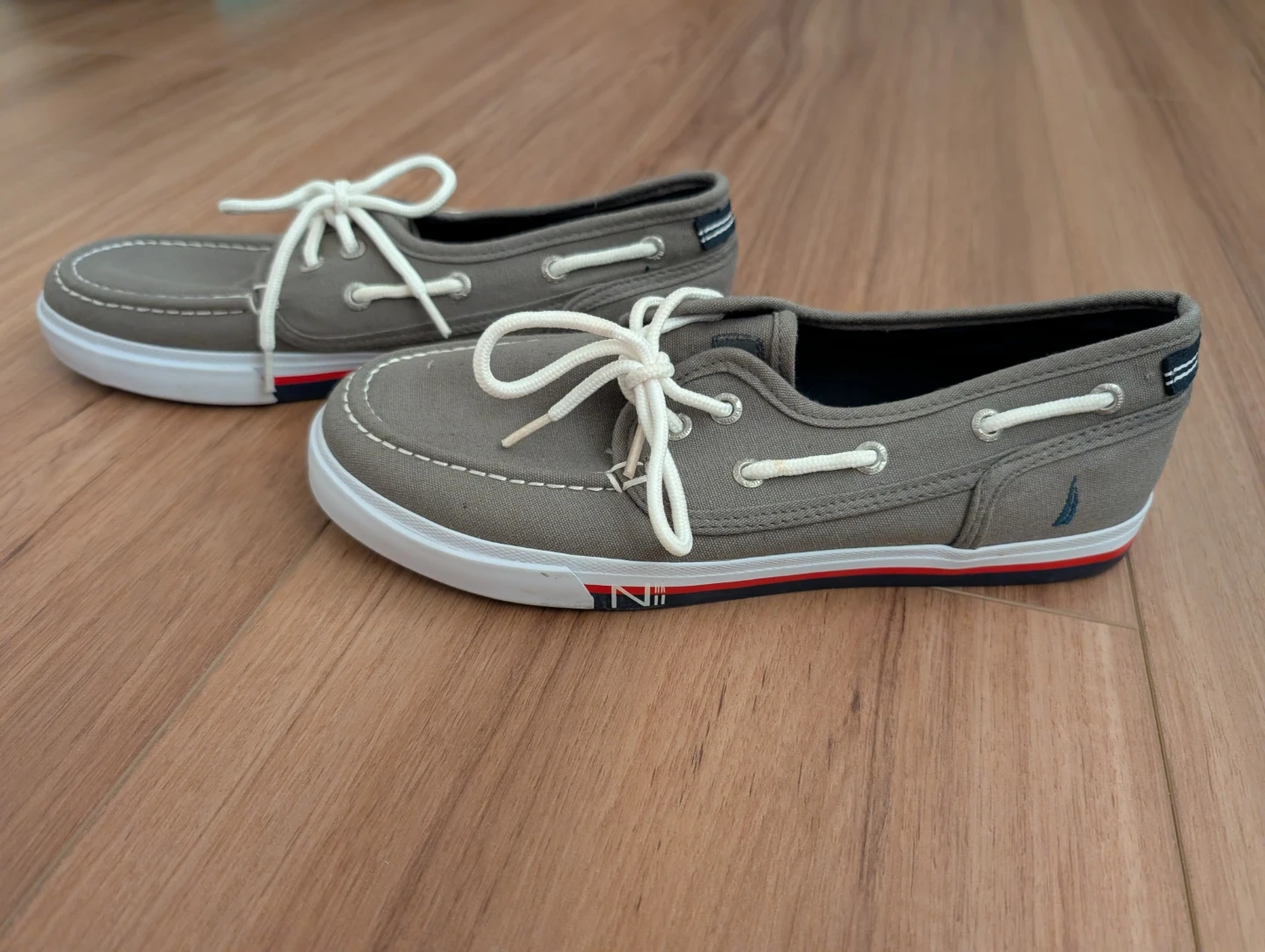 Nautica boat shoes in a grey canvas material. Features white laces and a red and blue striped accent along the sole. They're stylish and comfortable footwear.