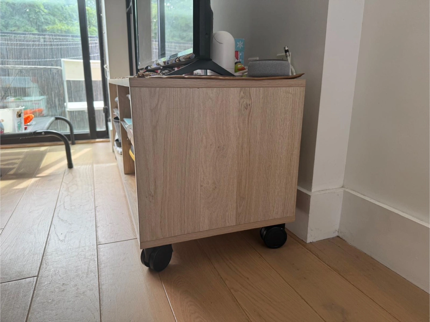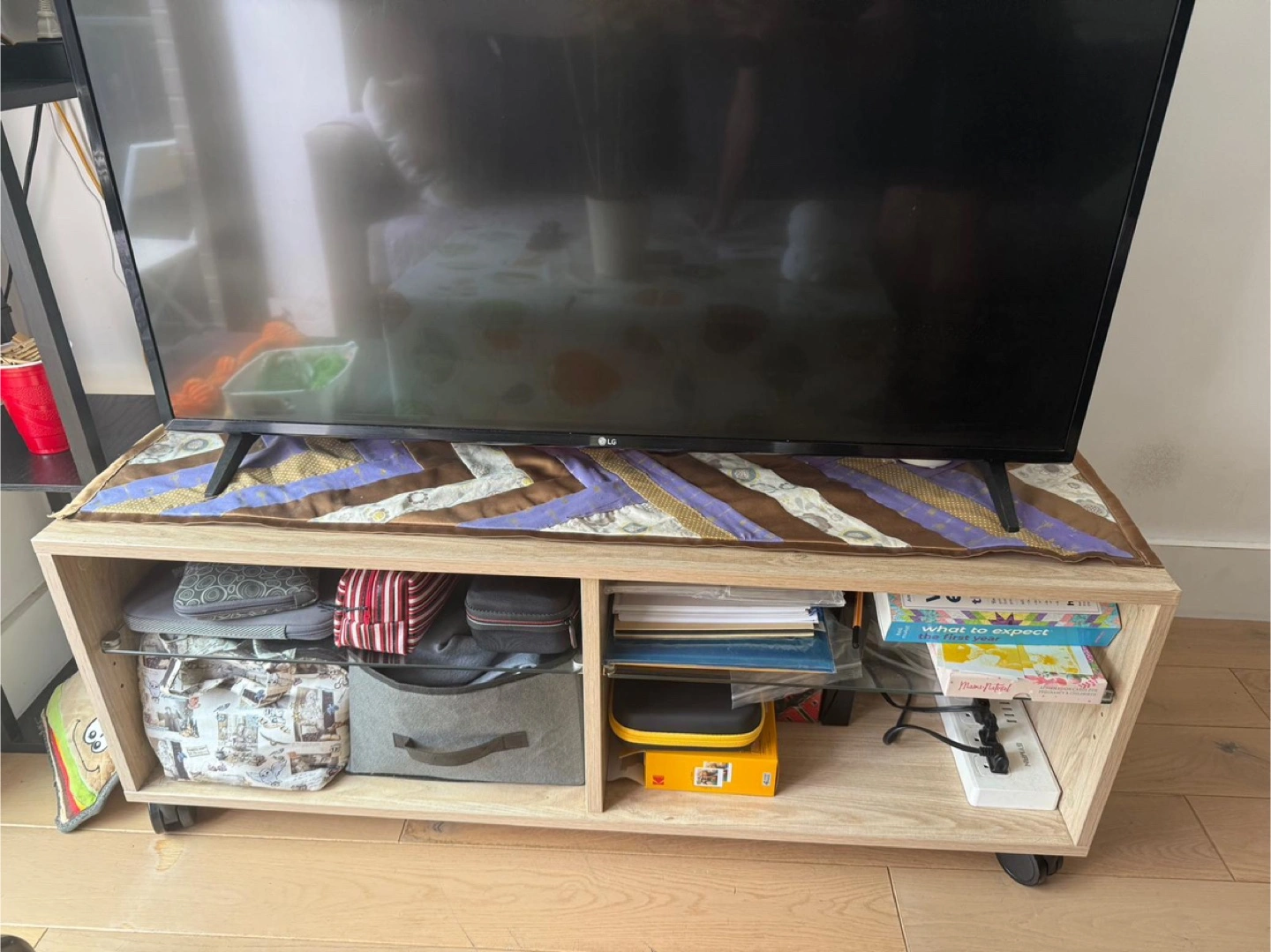 Selling a TV table/console in good condition. β Open storage design with 4 compartments separated by glass panels β perfect for electronics, decor, or media β Convenient wheels for easy moving and cleaning β Sturdy and stylish, fits most living rooms π Dimensions: Large 43β | Width 15β | Height 36β (42β with wheels) π Pickup in Bushwick! Message me before itβs gone! π₯