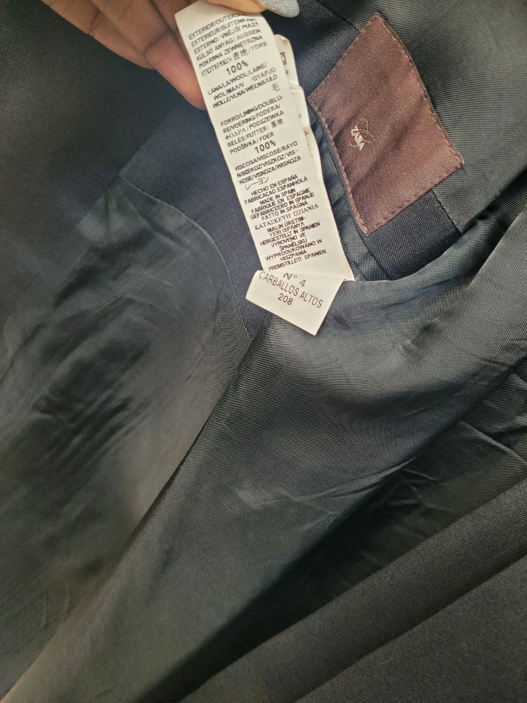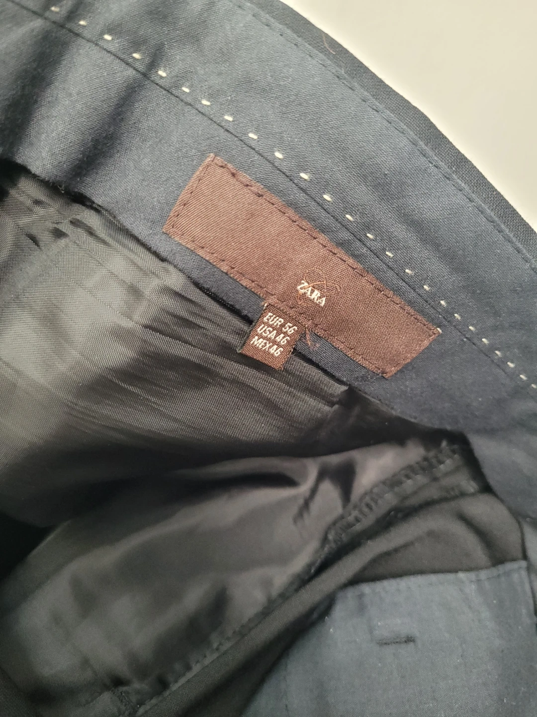 This is a black suit set from Zara, including a jacket and pants. The exterior and lining appear to be made of 100% synthetic materials. It's a classic choice for formal occasions.