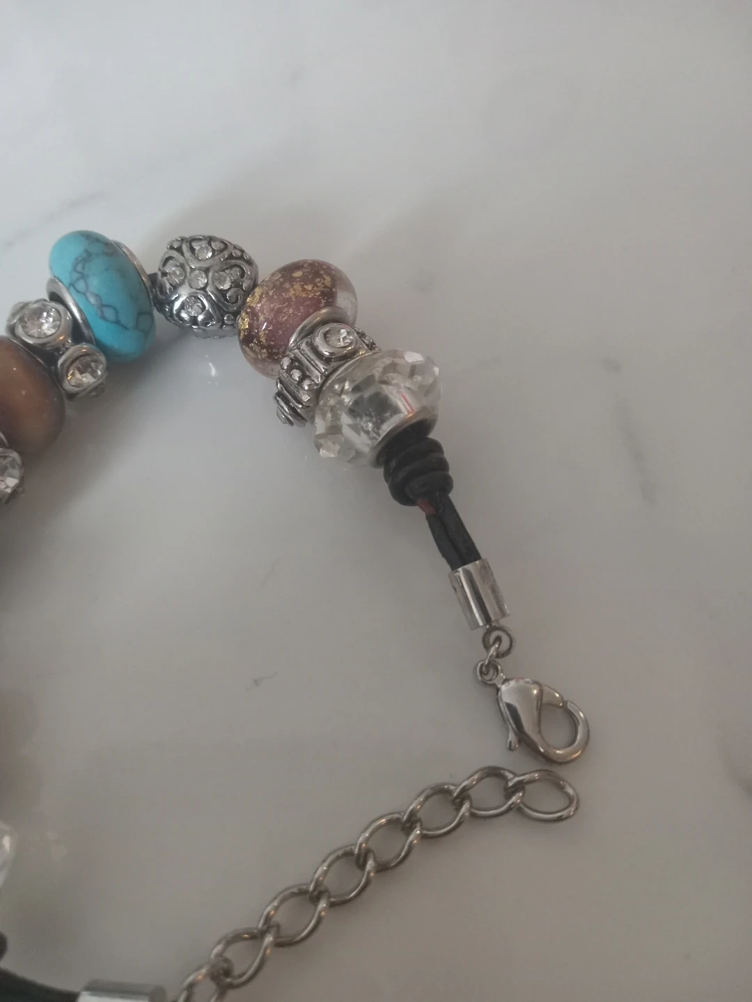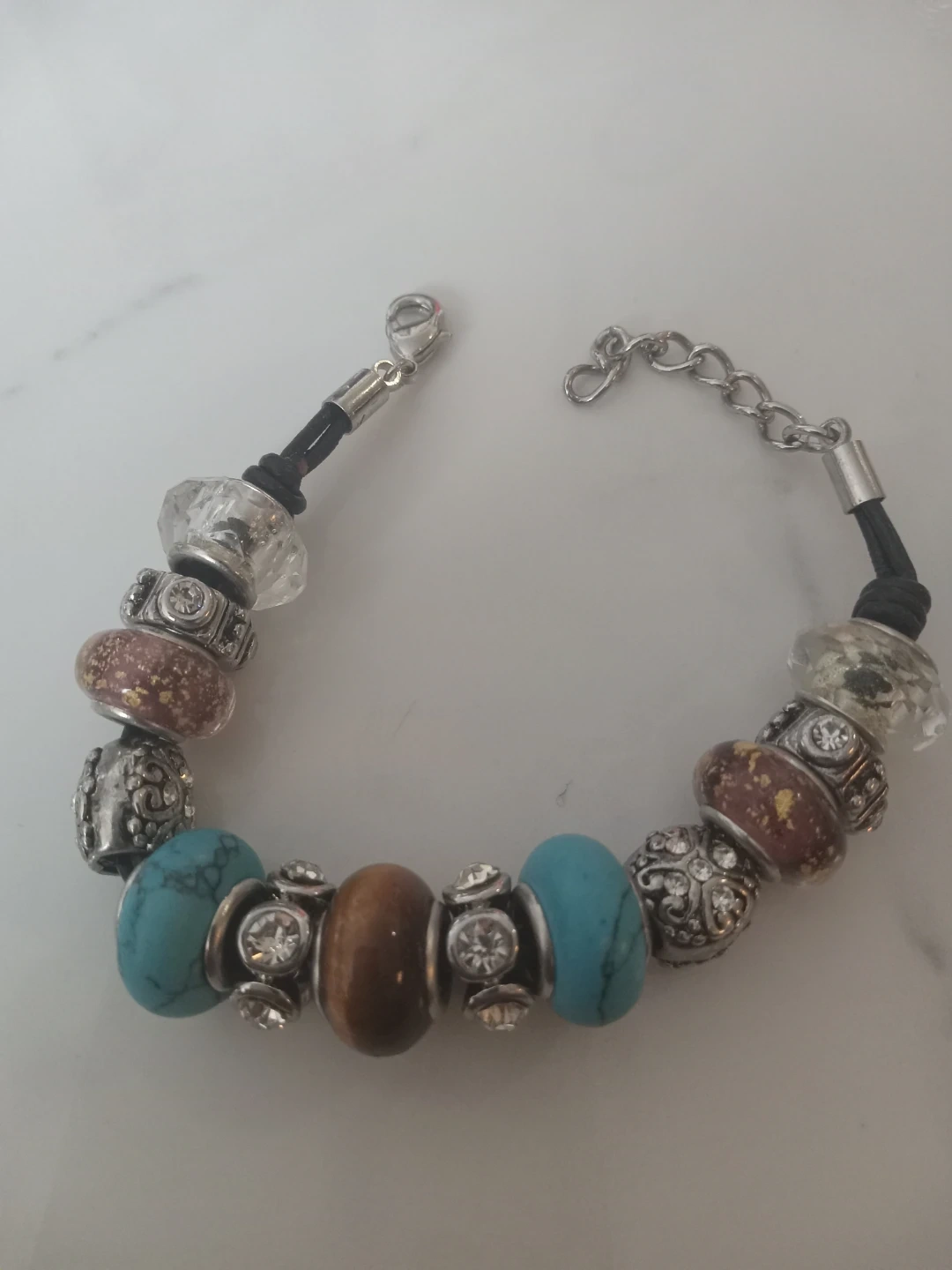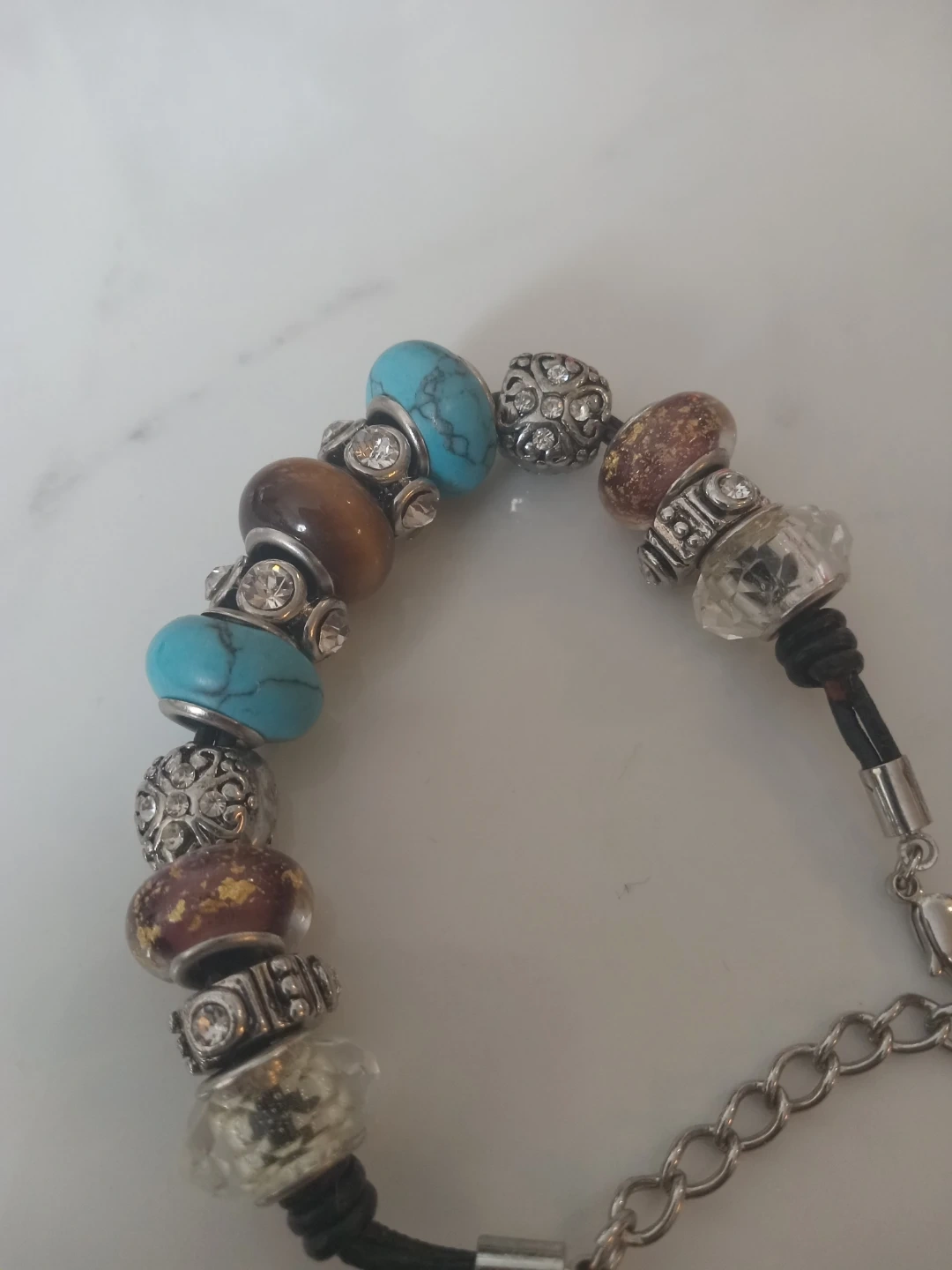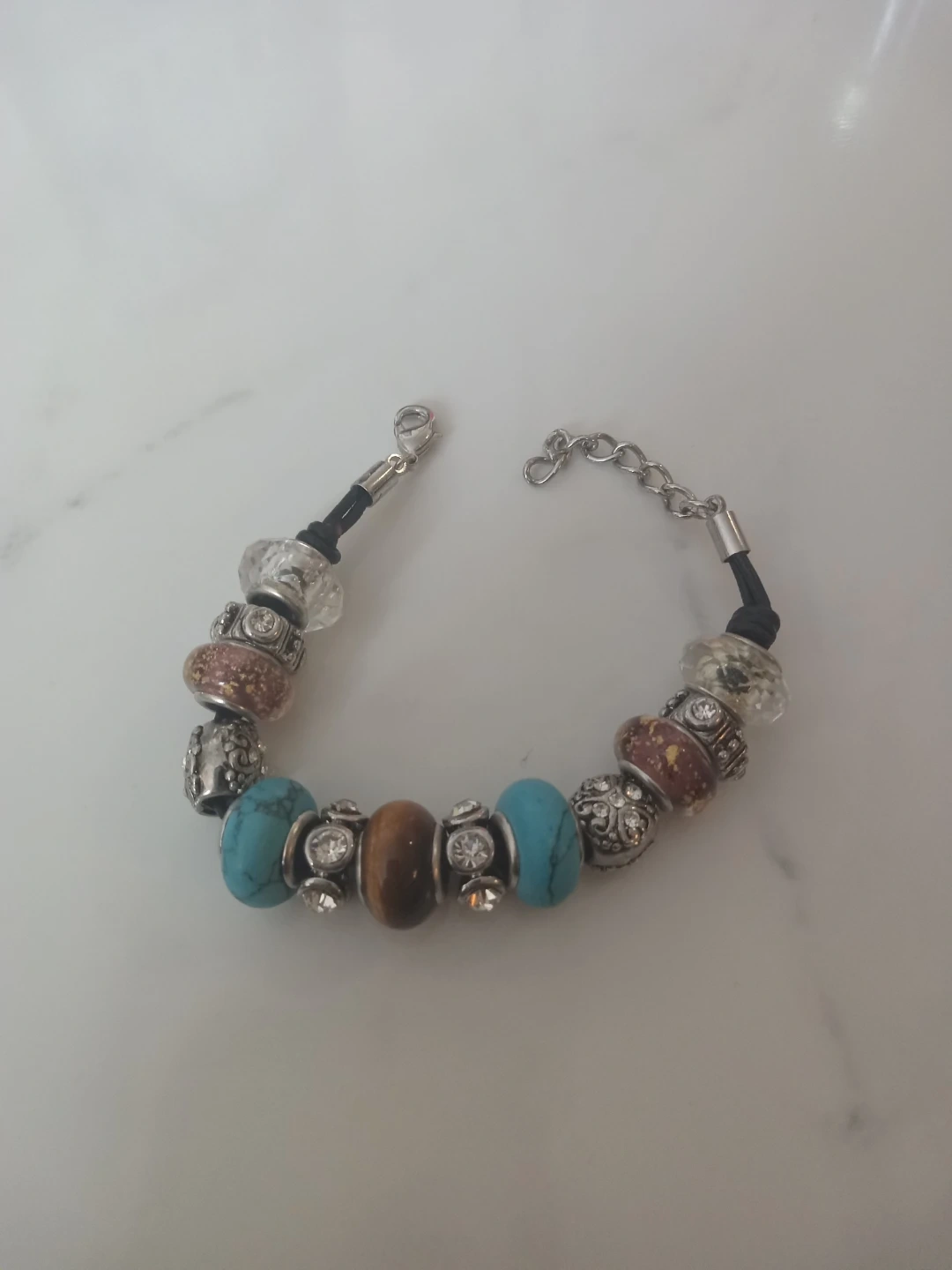 This charm bracelet features a mix of colourful beads including turquoise, tiger eye, and sparkly accents. It has a silver-tone chain with a lobster clasp for secure closure. The bracelet's unique design makes it a nice accessory for any outfit.