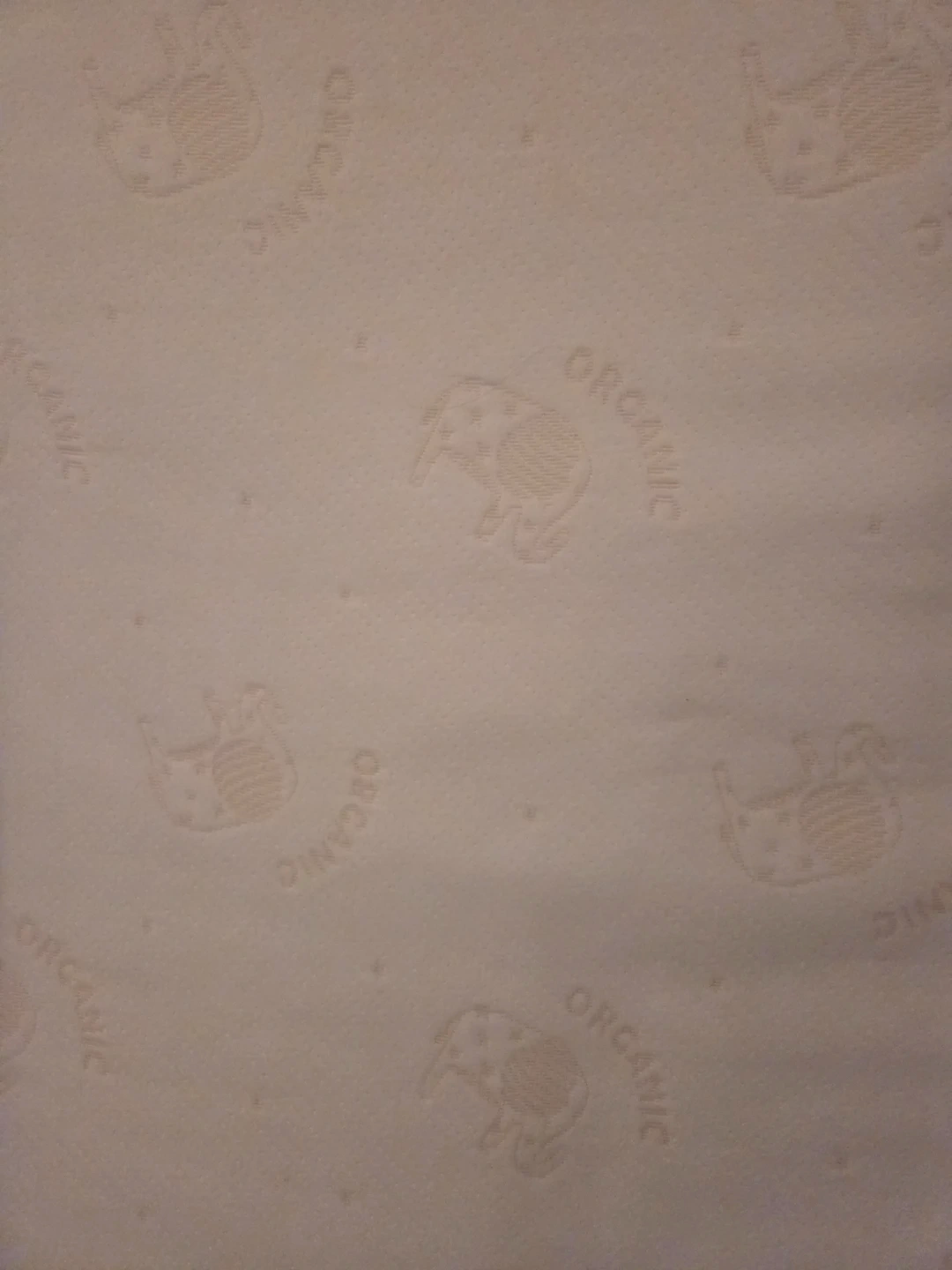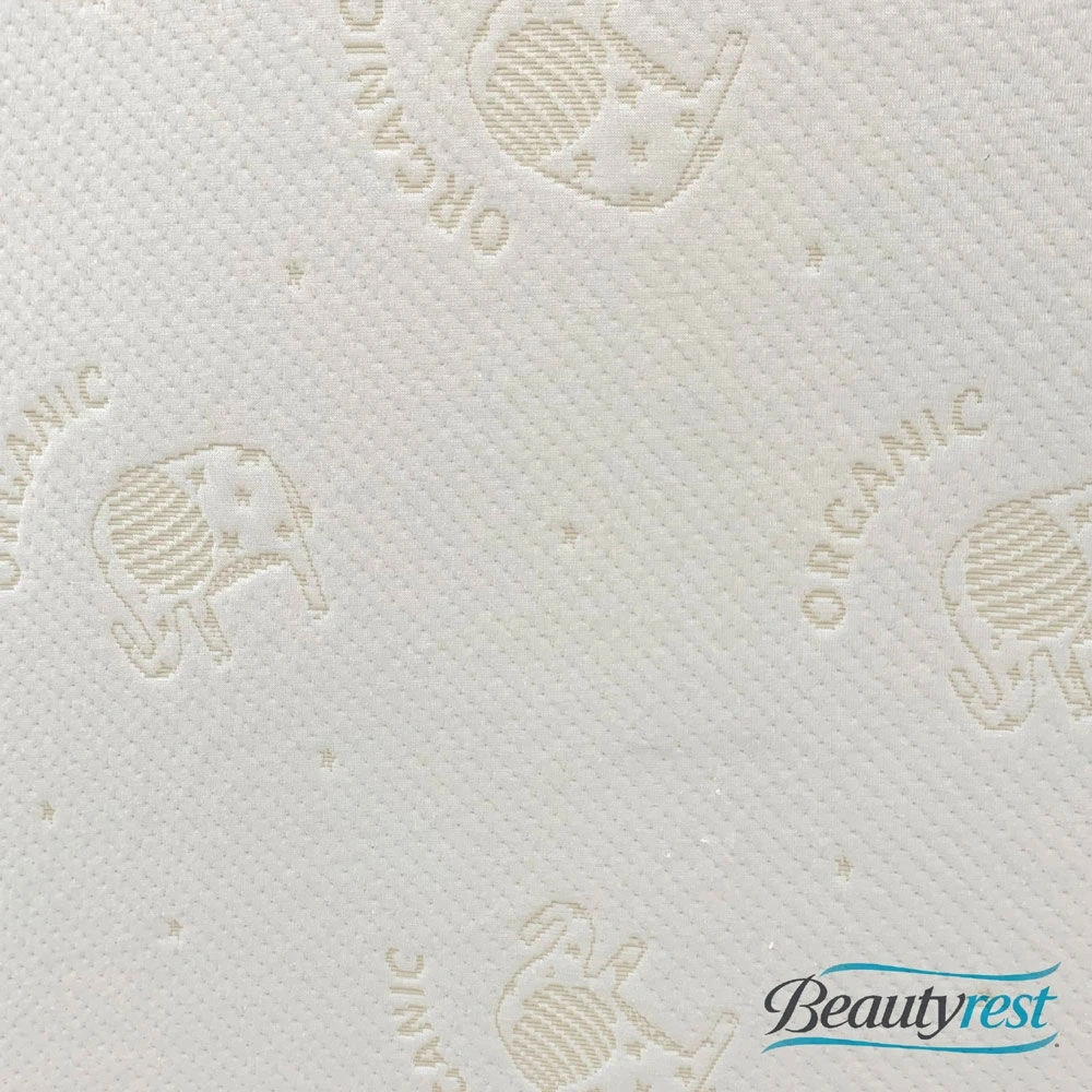 Simmons crib mattress is designed with an organic cover. It features a pattern of elephants.