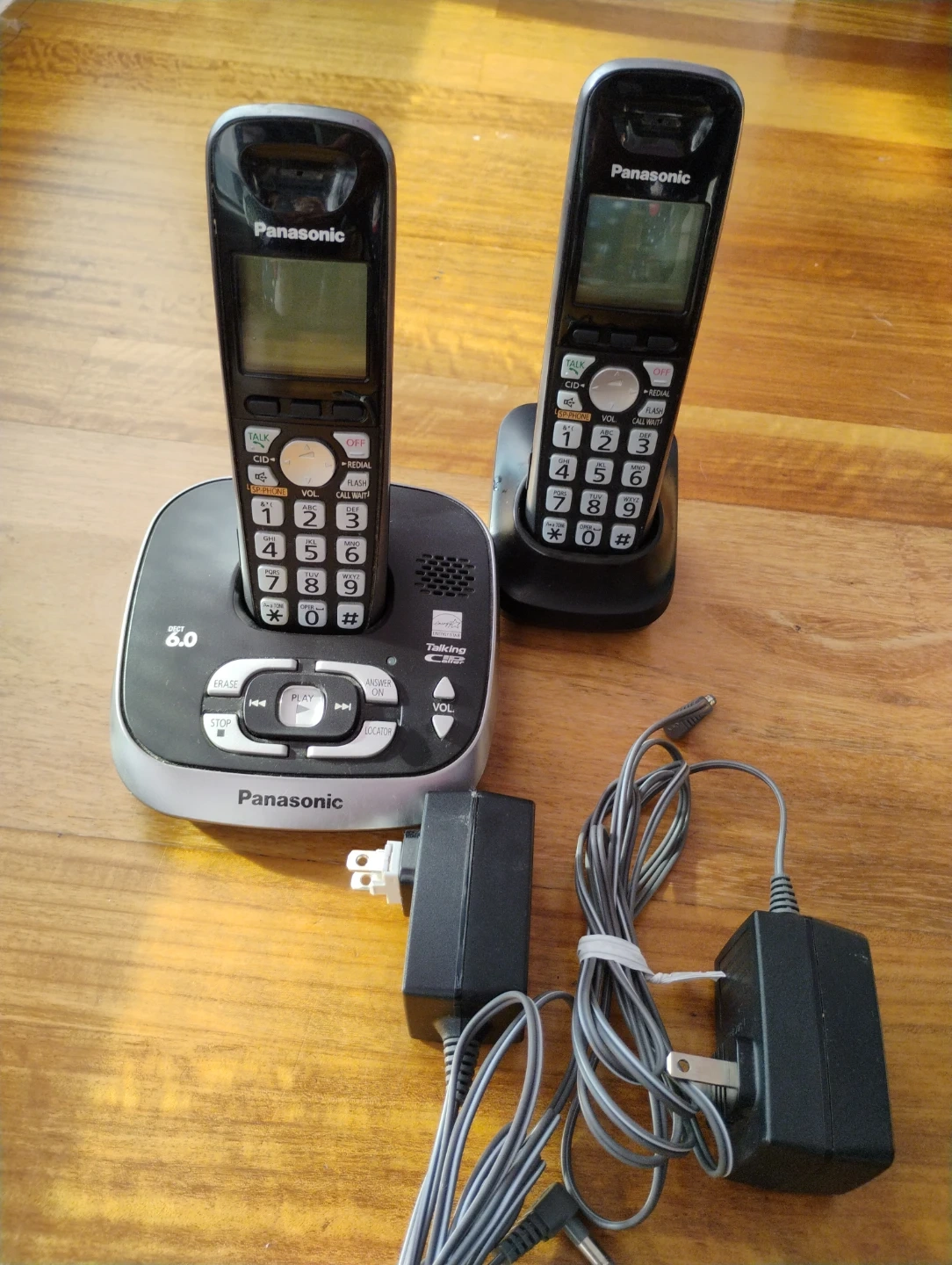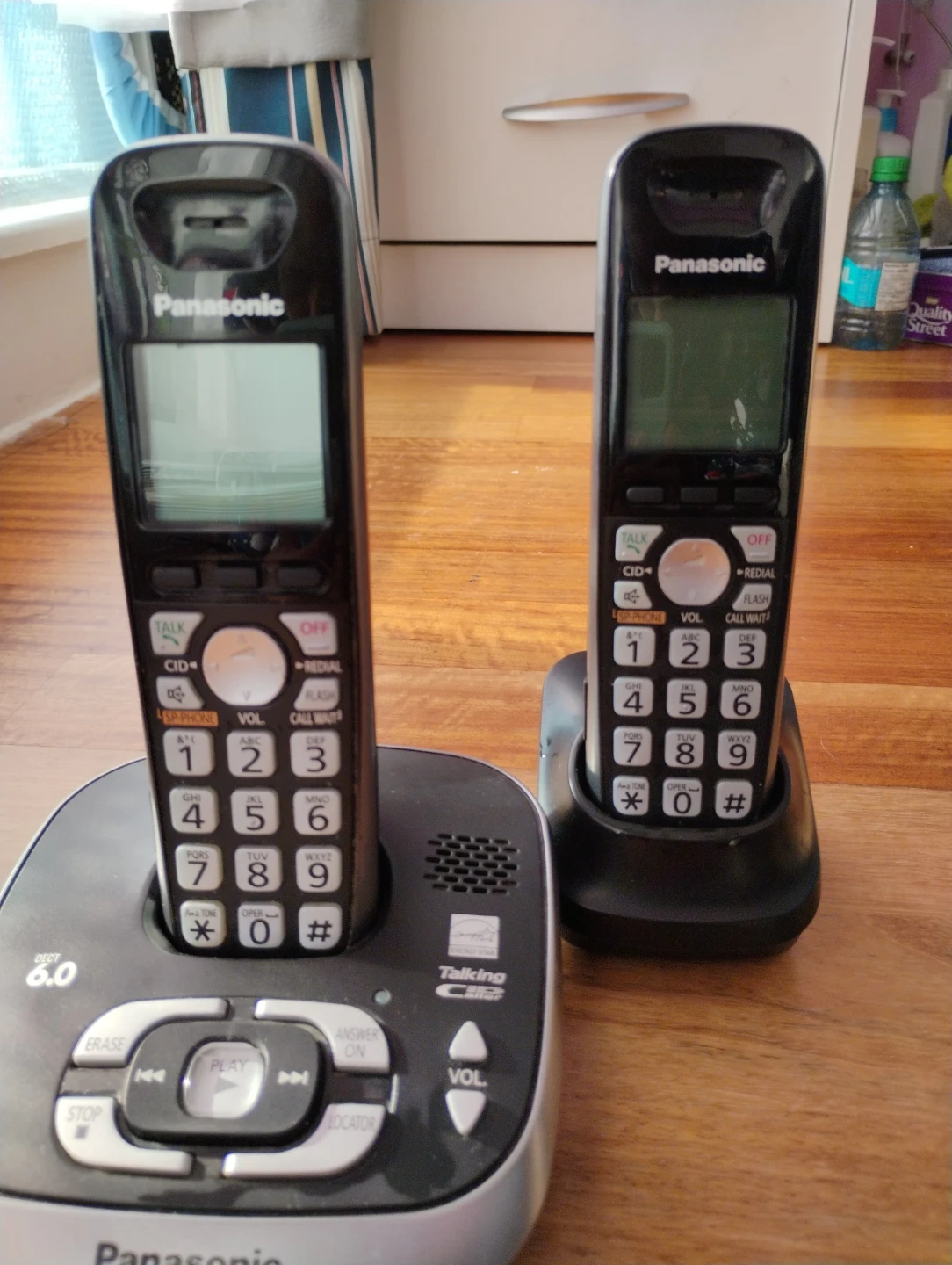 Selling a Panasonic DECT 6.0 cordless phone set. It includes two handsets and a base station. Perfect for home or office use!