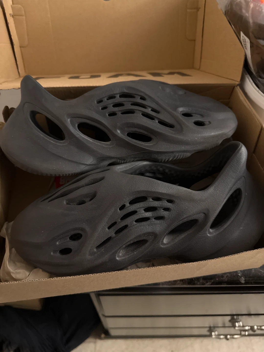 These Adidas Yeezy Foam Runners are made from a unique EVA foam compound. They feature an avant-garde design with sculpted lines and large cutouts for breathability. This footwear is known for its comfortable, lightweight feel.