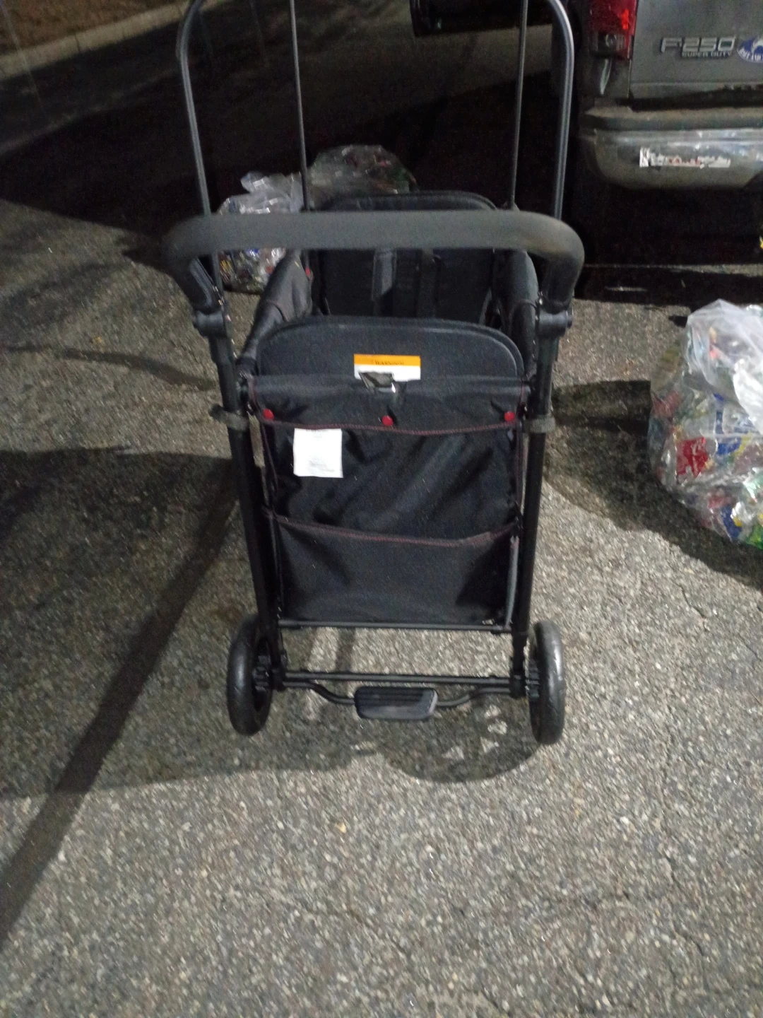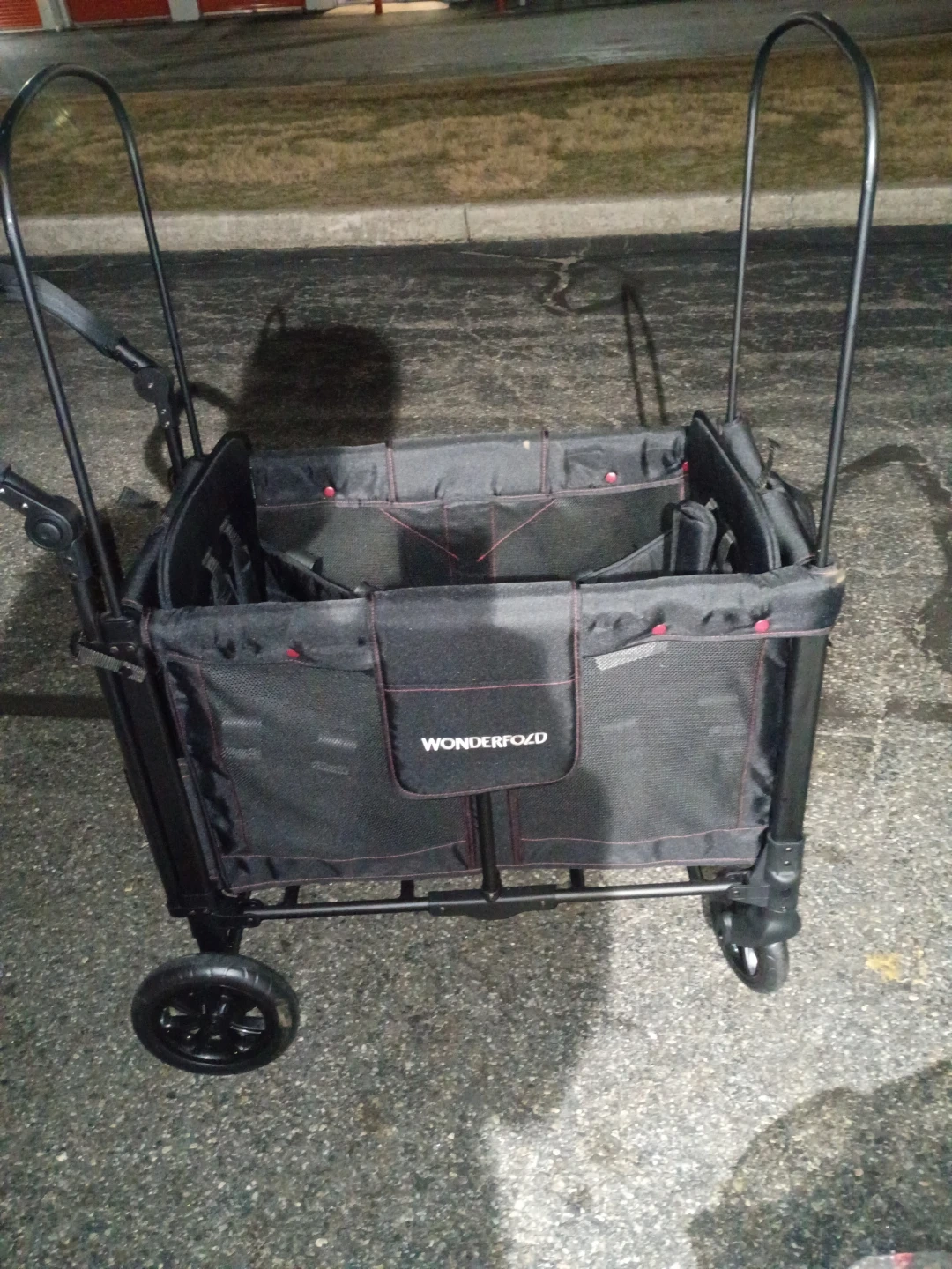 This is a black WonderFold wagon. It's a utility wagon designed for transporting children or goods. Features multiple pockets for storage.