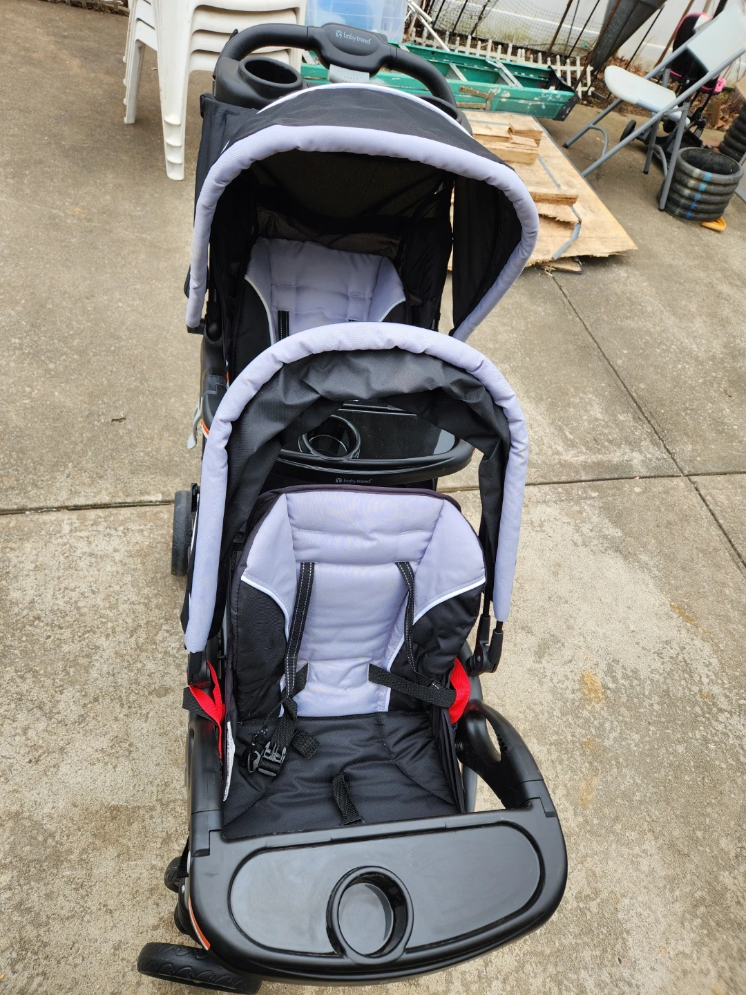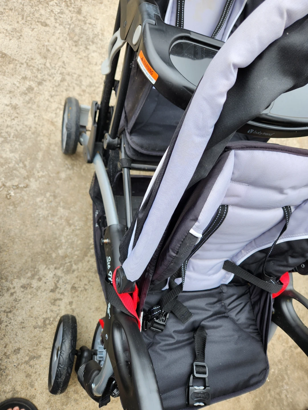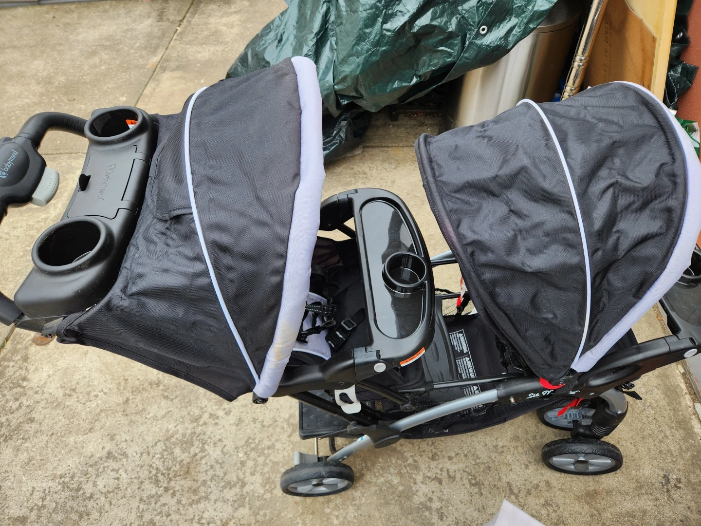 his Baby Trend Sit N' Stand double stroller is perfect for families with two young children. It features two seats, one in front of the other, allowing parents to easily maneuver through crowded spaces. Both seats have adjustable harnesses and canopies for comfort and protection. The stroller also includes a parent console with cup holders and a large storage basket underneath for all your essentials. It's designed for convenience and ease of use for parents on the go!