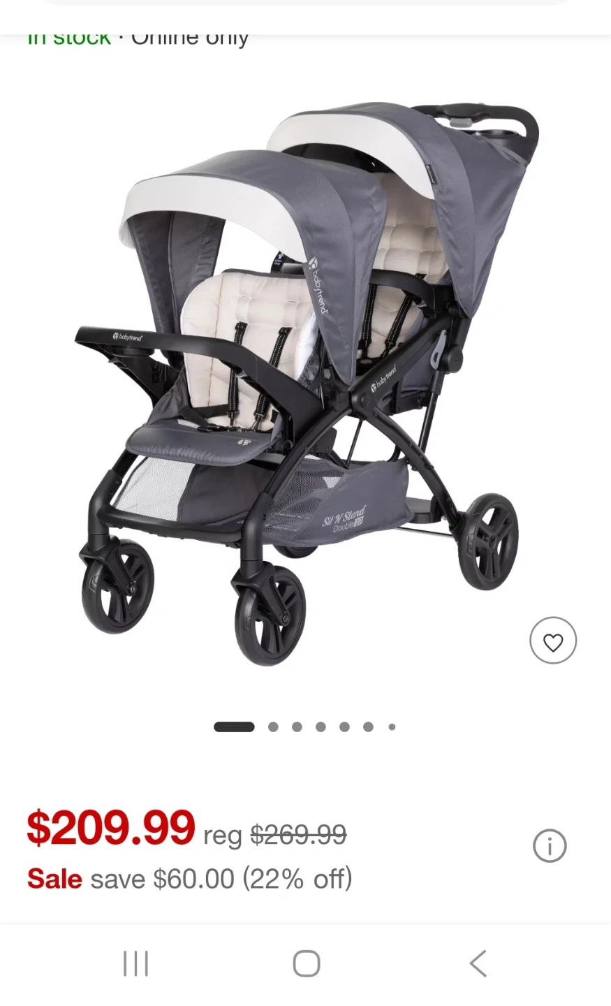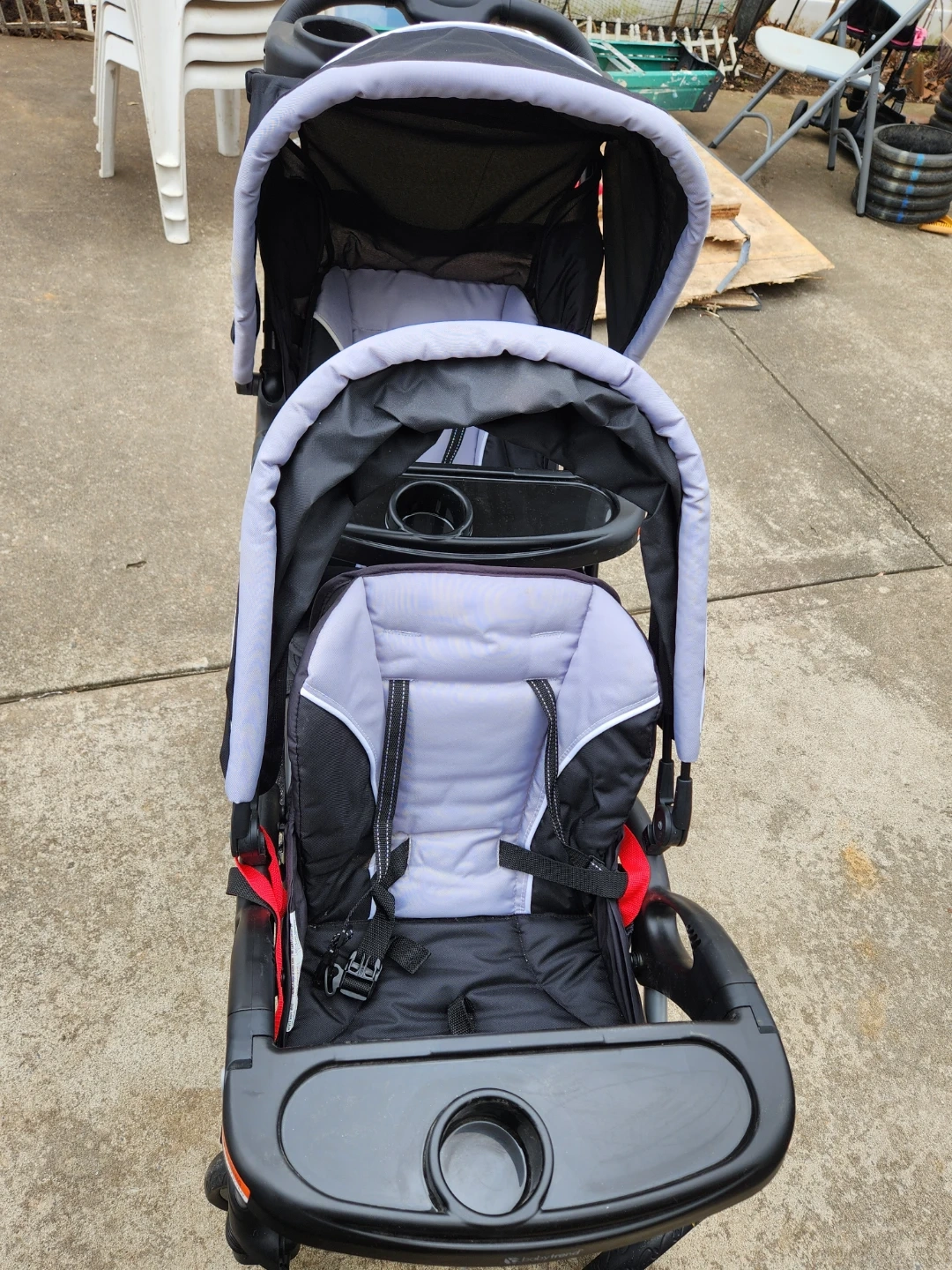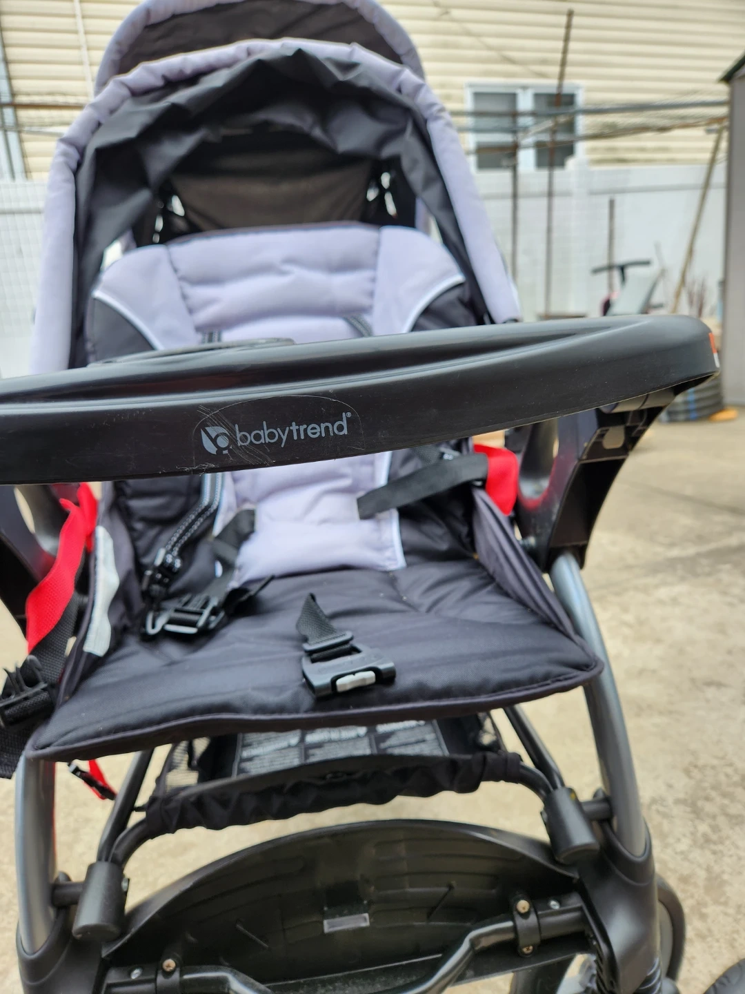 his Baby Trend Sit N' Stand double stroller is perfect for families with two young children. It features two seats, one in front of the other, allowing parents to easily maneuver through crowded spaces. Both seats have adjustable harnesses and canopies for comfort and protection. The stroller also includes a parent console with cup holders and a large storage basket underneath for all your essentials. It's designed for convenience and ease of use for parents on the go!