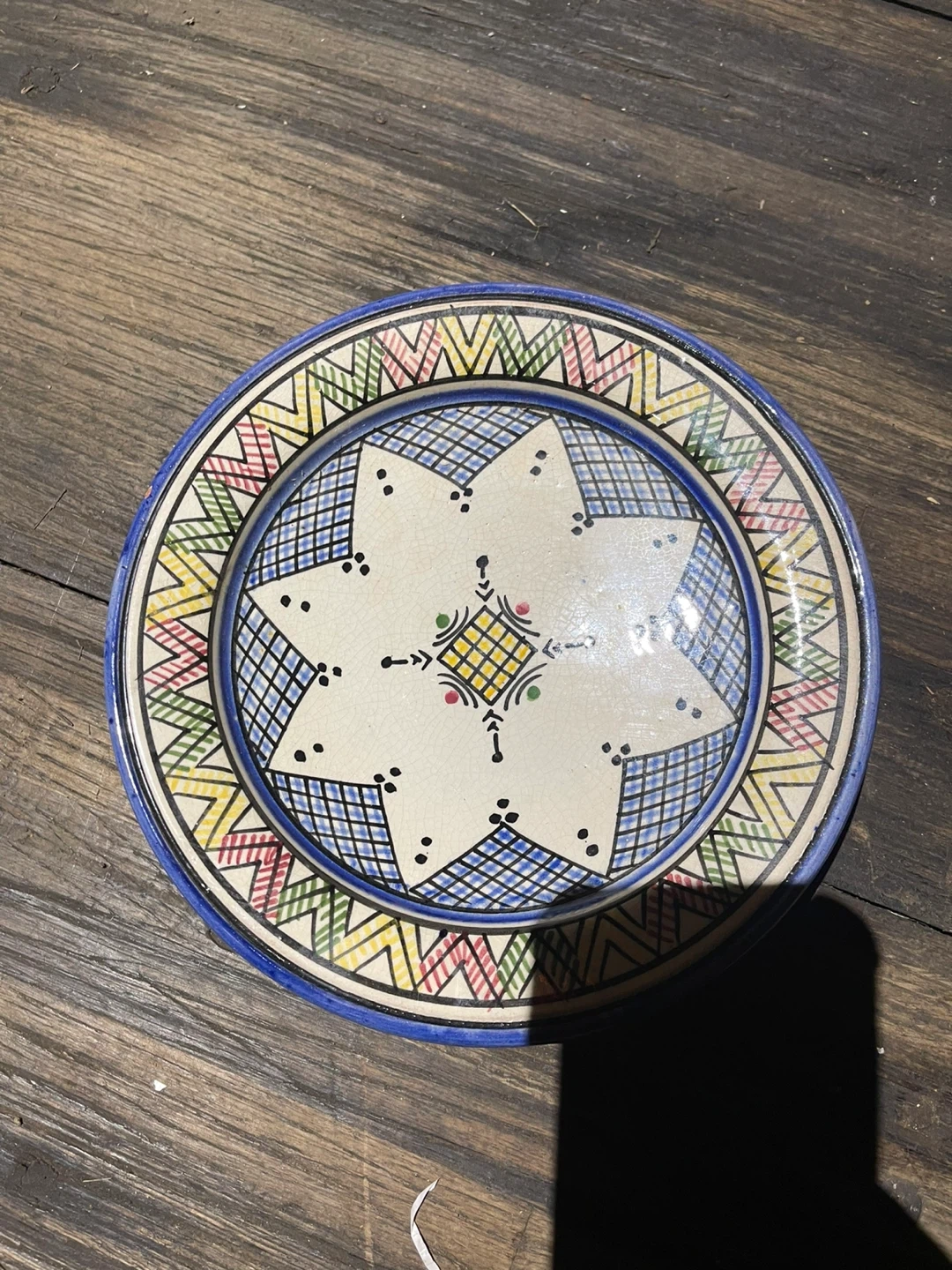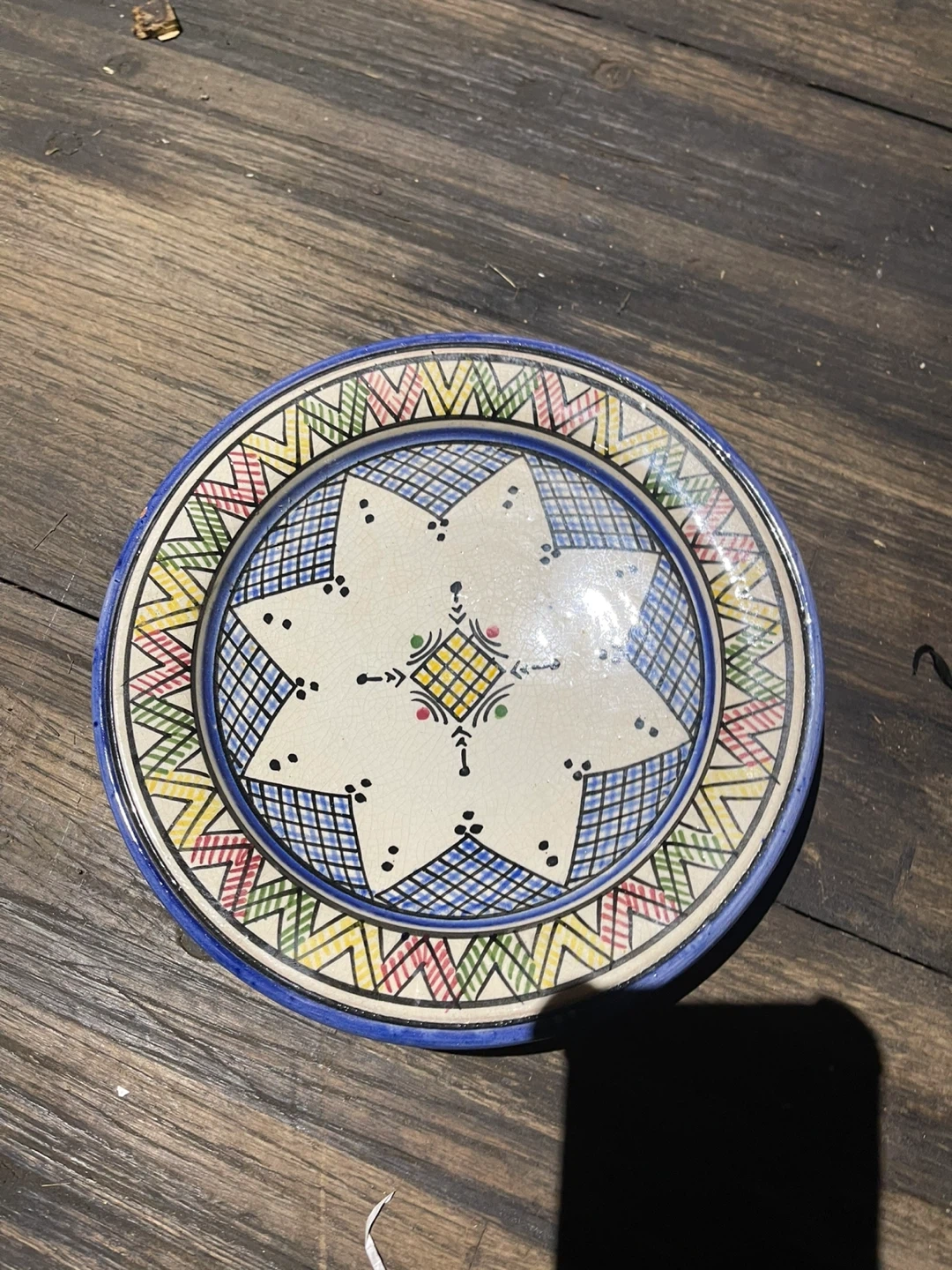 Hand-painted ceramic decorative plate with a starburst design. Features vibrant geometric patterns and a blue rim. This piece is suitable for display or as a unique accent for your home decor. Adds a touch of color and artistry to any space!