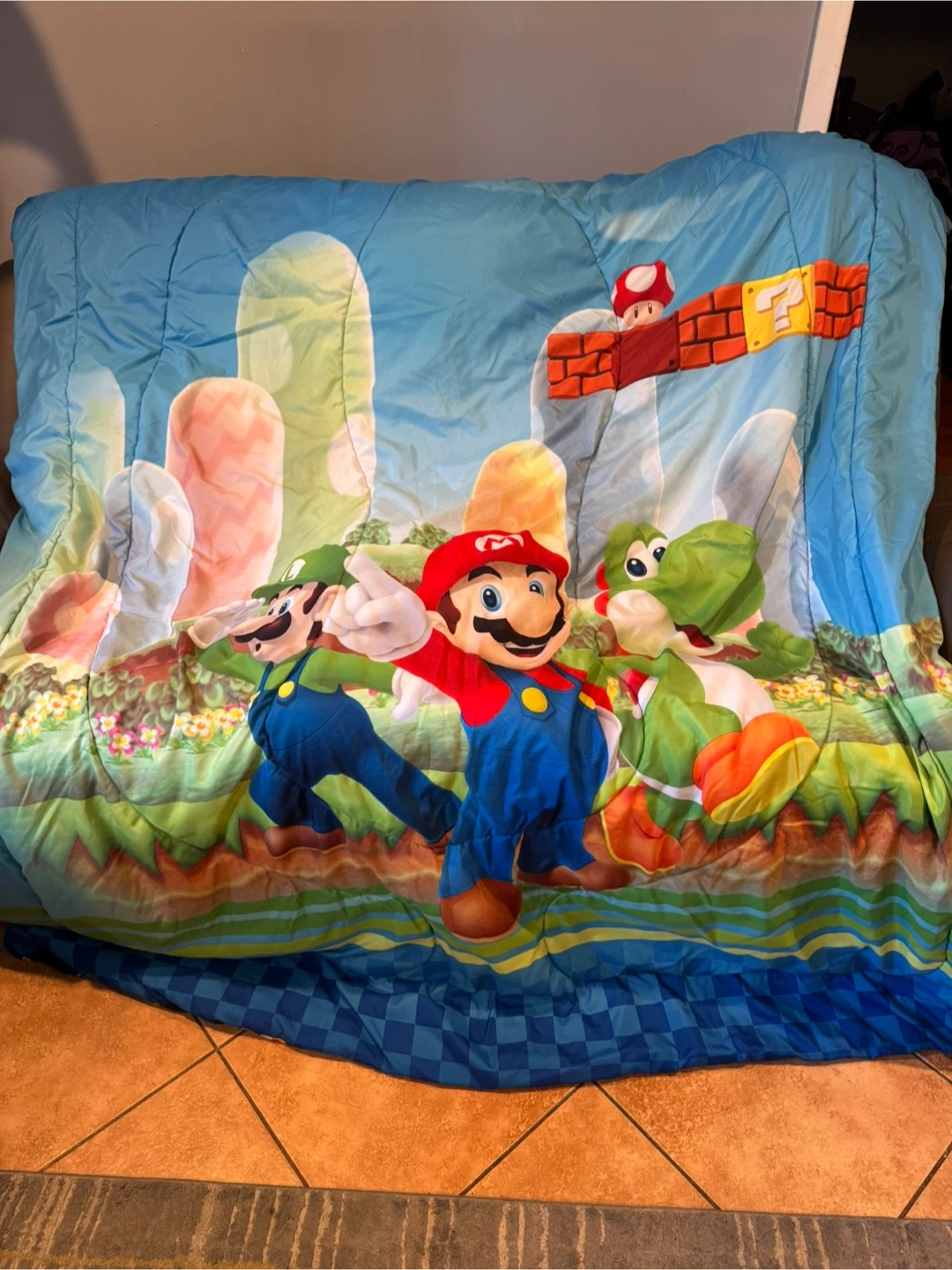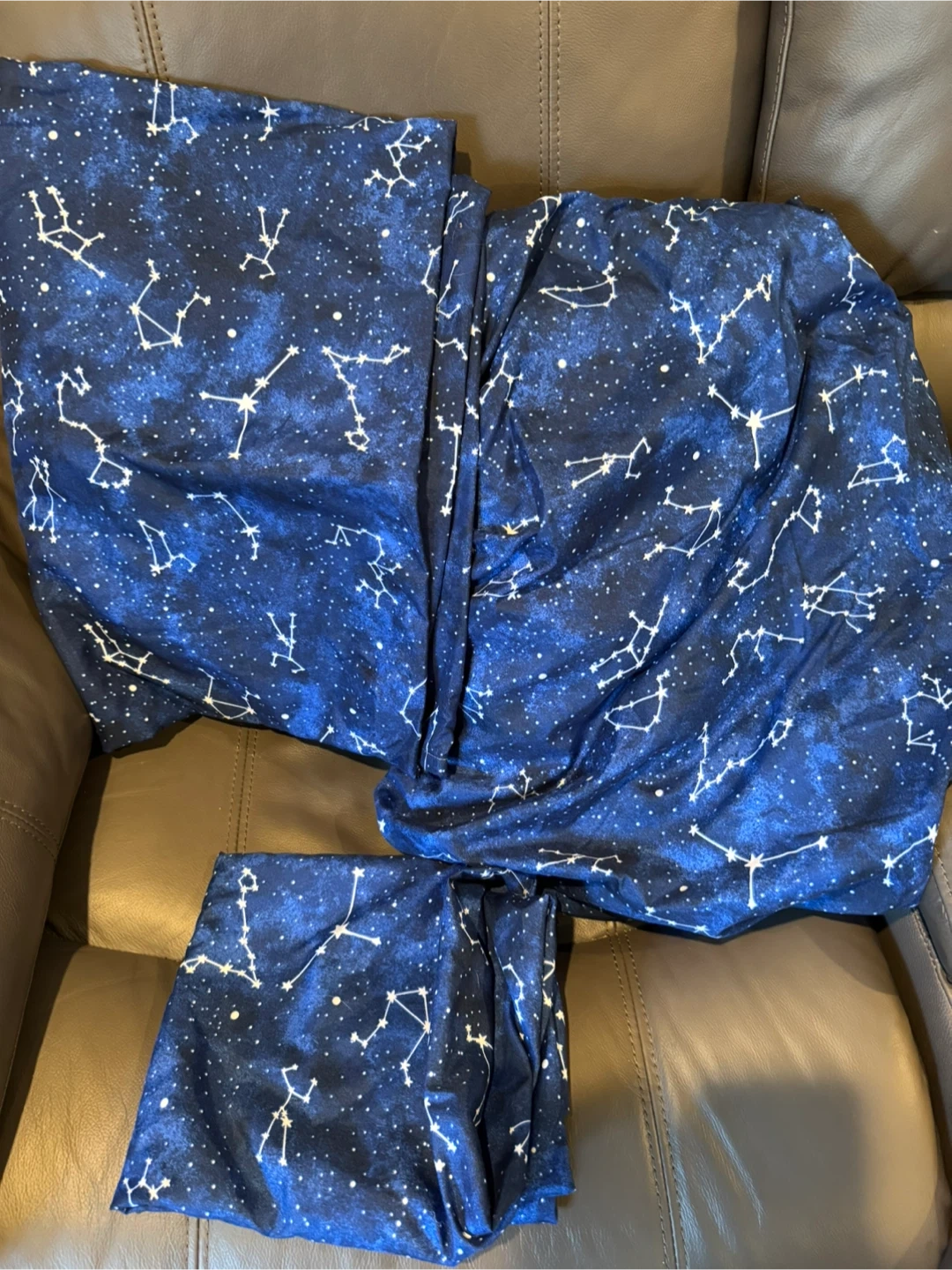 Twin size reversible comforter. This comforter did not come with sheets or a pillow case so I bought sheets to use with it which I will include. 1 fitted sheet, 1 flat sheet and 1 pillowcase.