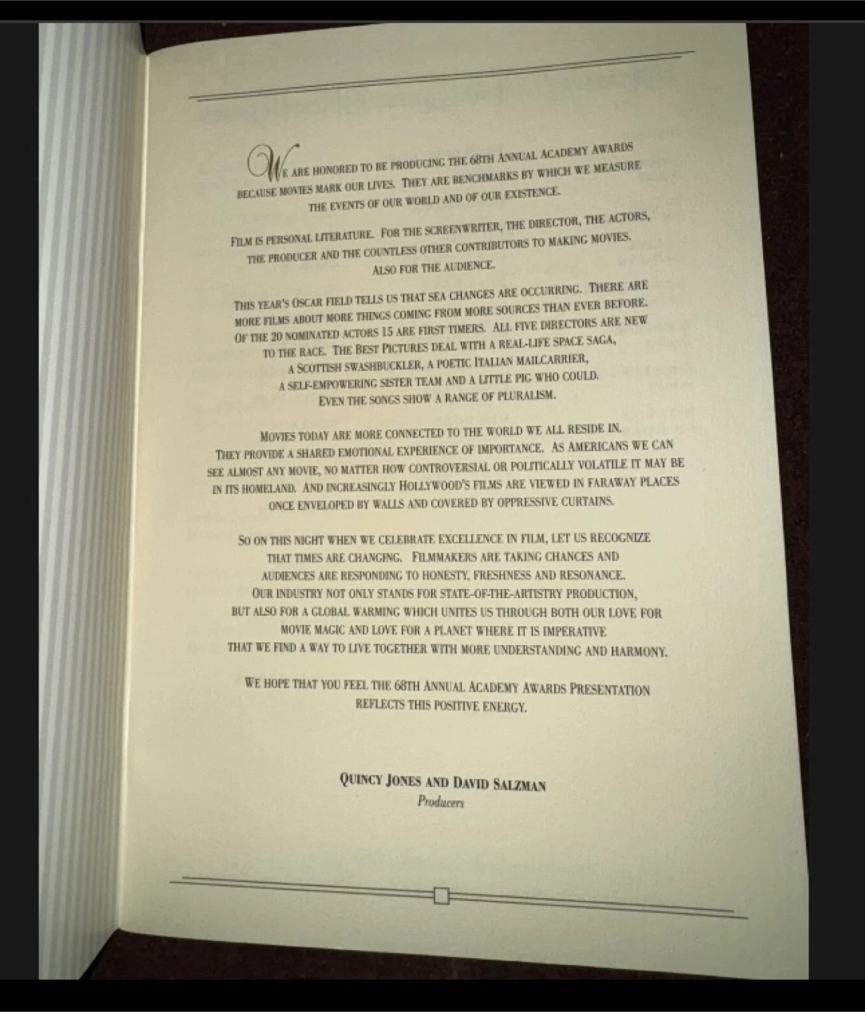 Selling a program from The 68th Annual Academy Awards. 1996 OSCARS