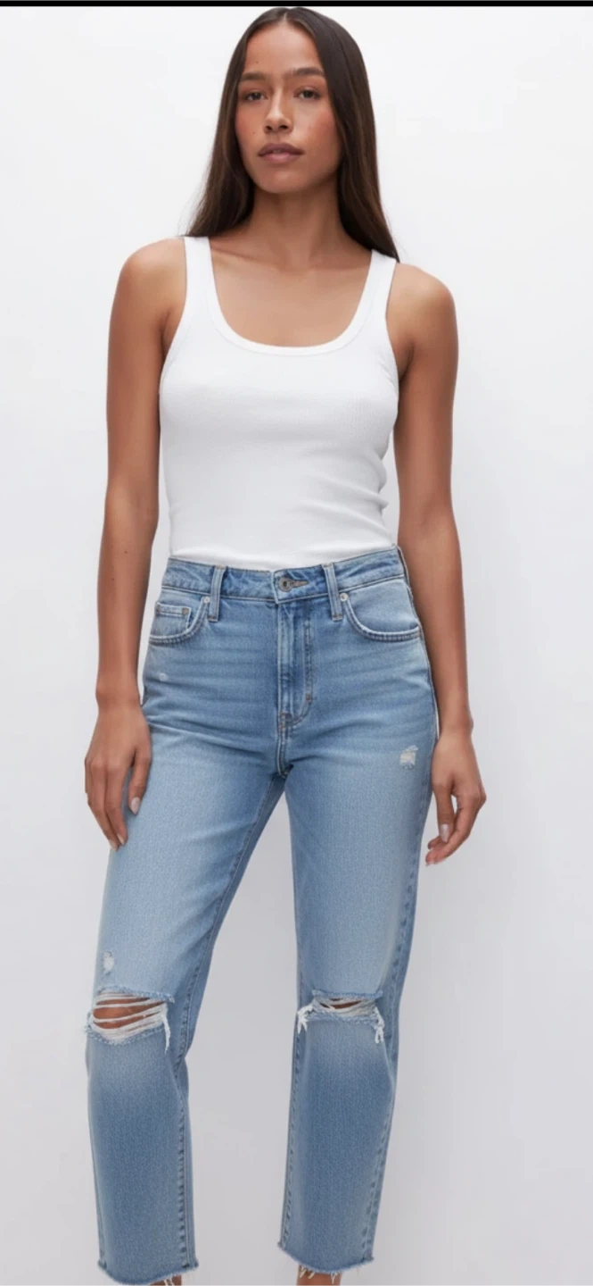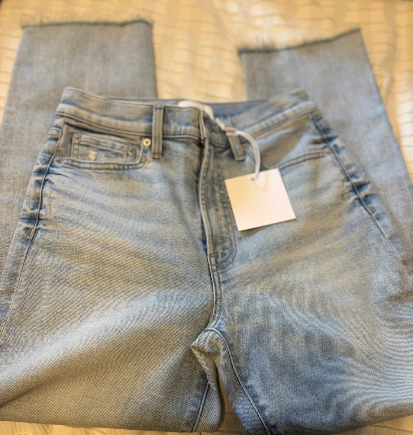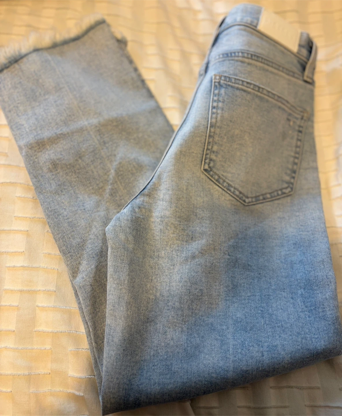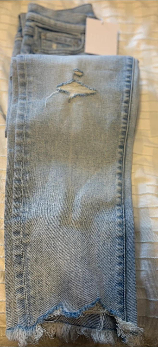 NWT Light wash denim jeans with a distressed detail on the left knee. Features a raw hem and a high rise straight leg fit. Made from a cotton blend. Waist 15 in inseam 26 in . Original price $168