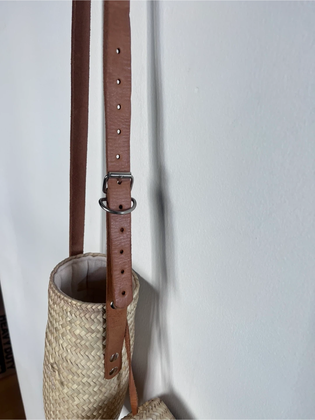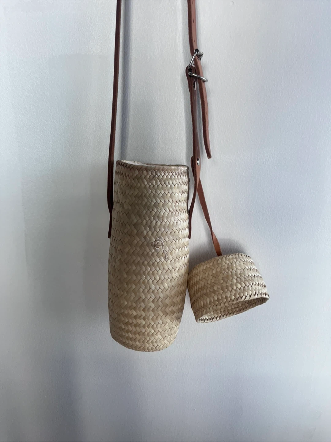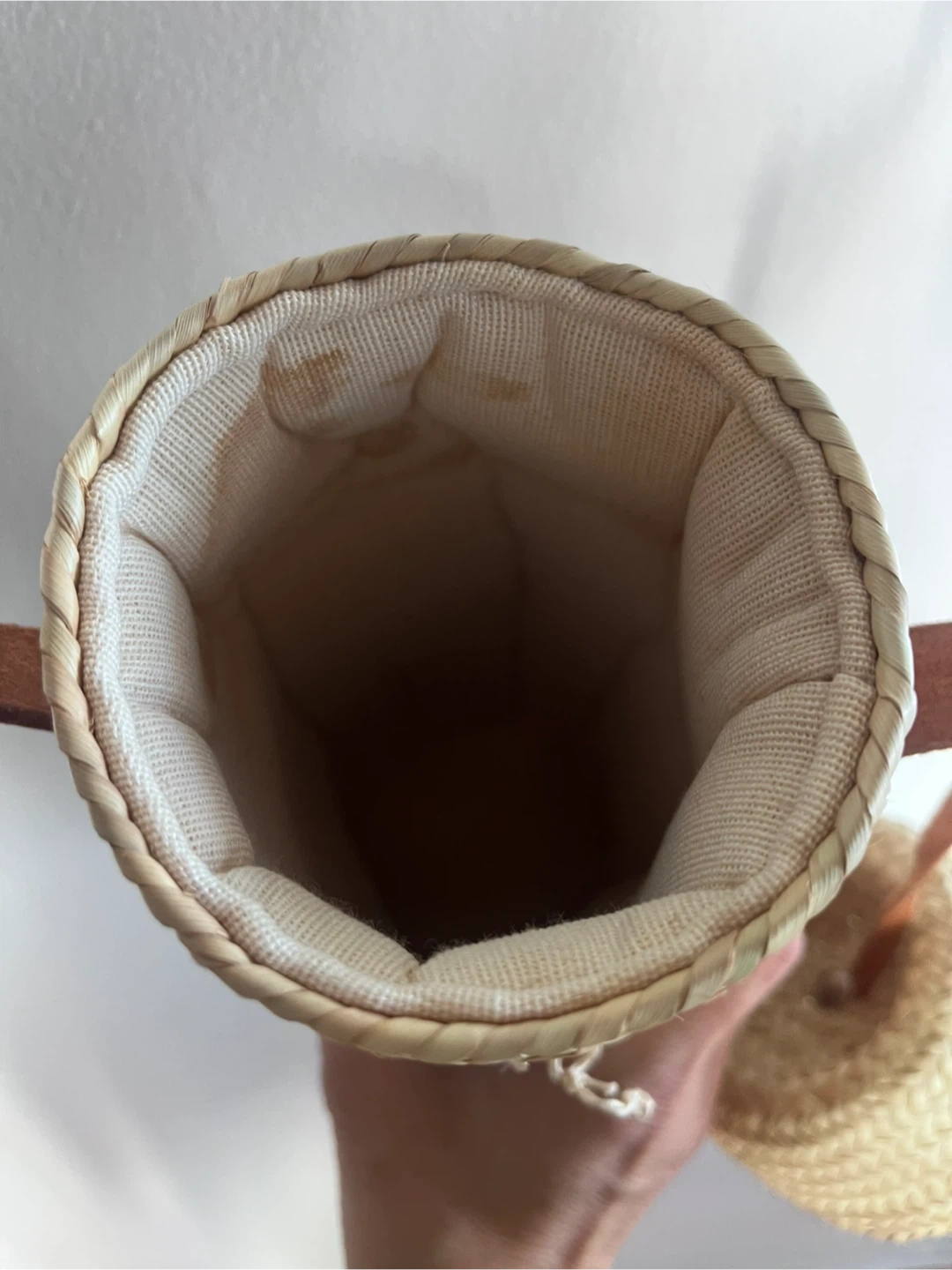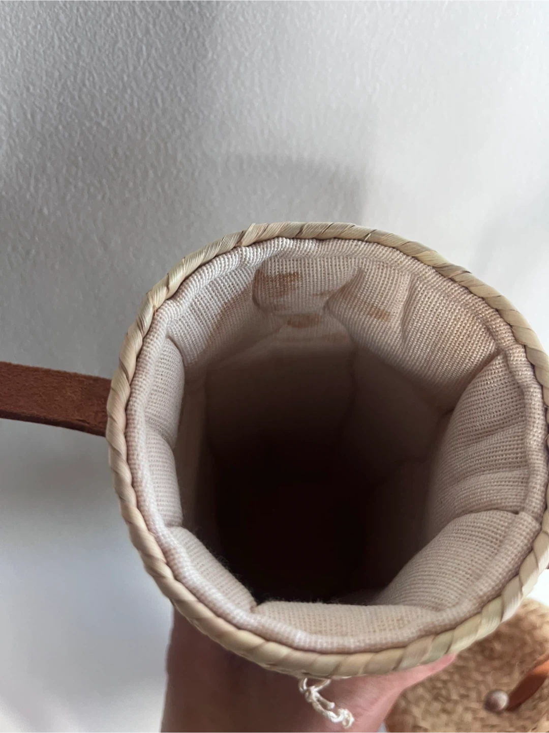 This is a cute woven water bottle holder with a strap! It is a natural color and looks to be made of wicker. It has a leather strap. Inside is thick cushion fabric. Please note there is a little water stain inside.