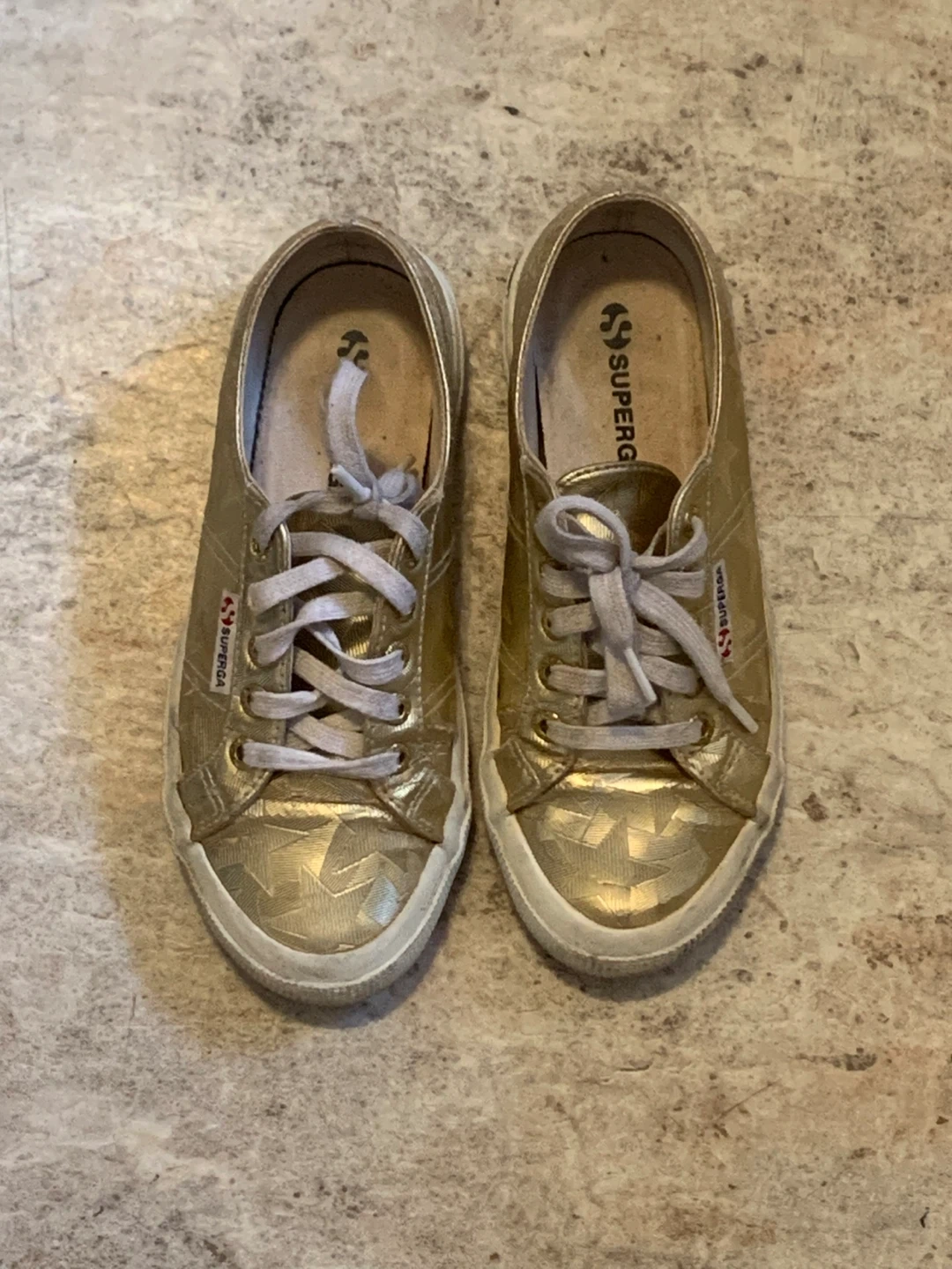 Pair of sneakers in a shiny gold colour. Lace-up style with rubber soles. Used condition. These casual kicks add a touch of sparkle to any outfit!