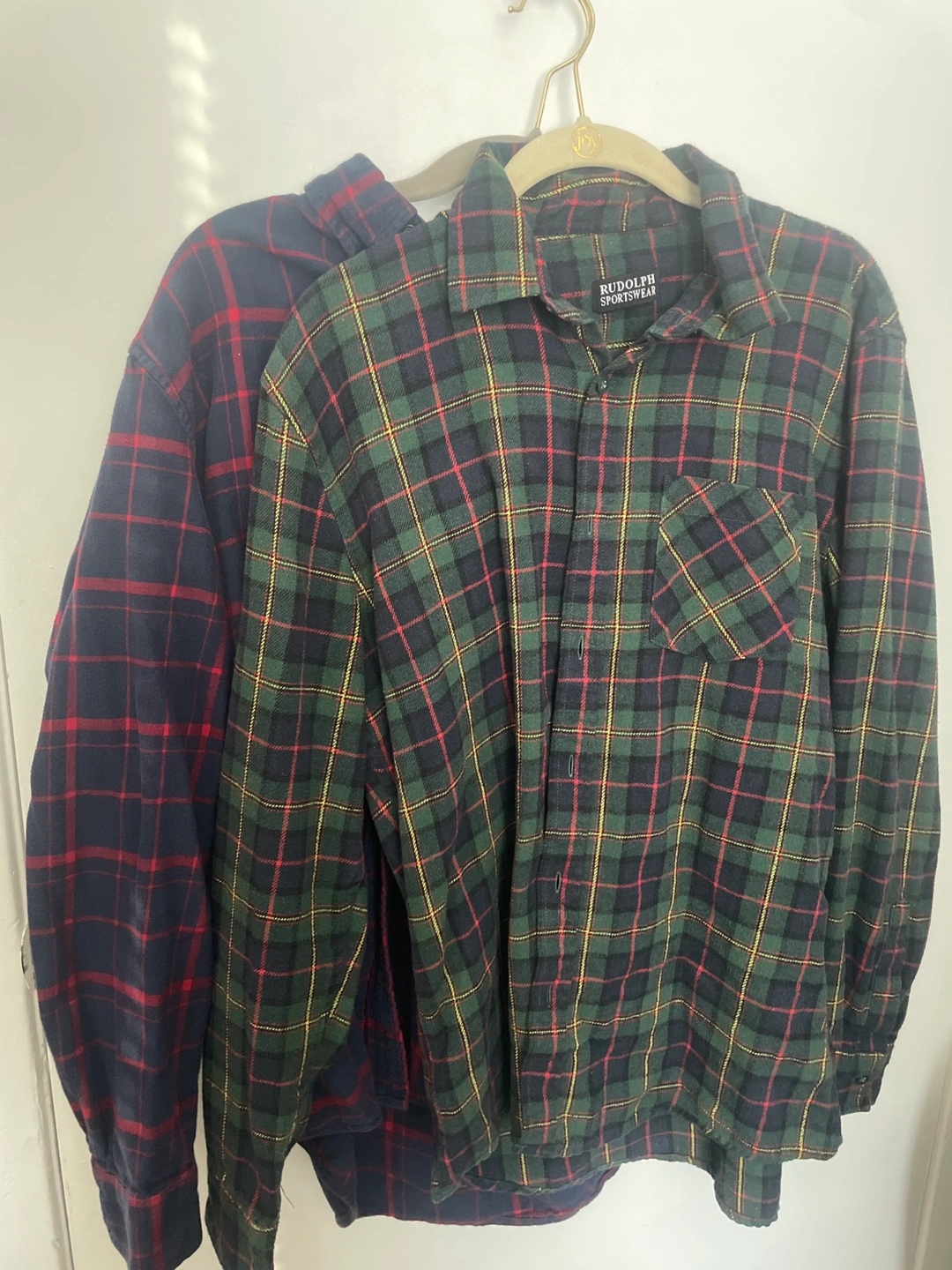 292Bundle of two long-sleeve flannel shirts. One navy and red plaid, one green and red plaid. Both button-down. Great for layering.