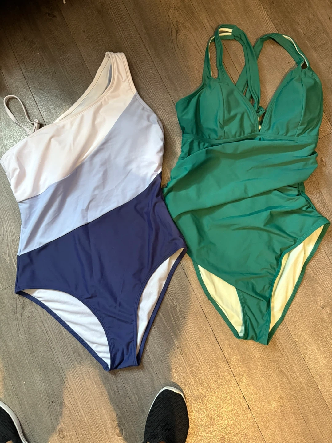 Two stylish one-piece swimsuits are up for grabs! One is a color-blocked design in white, lavender, and navy. The other is a solid green color. Both are in great condition and ready for some fun in the sun