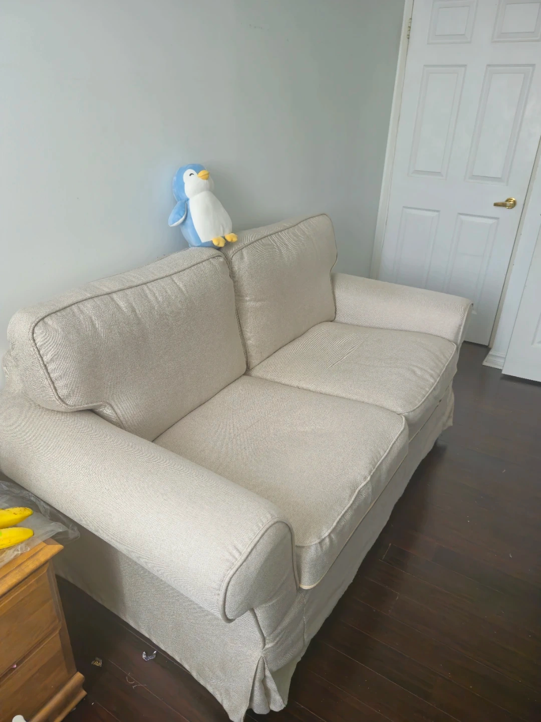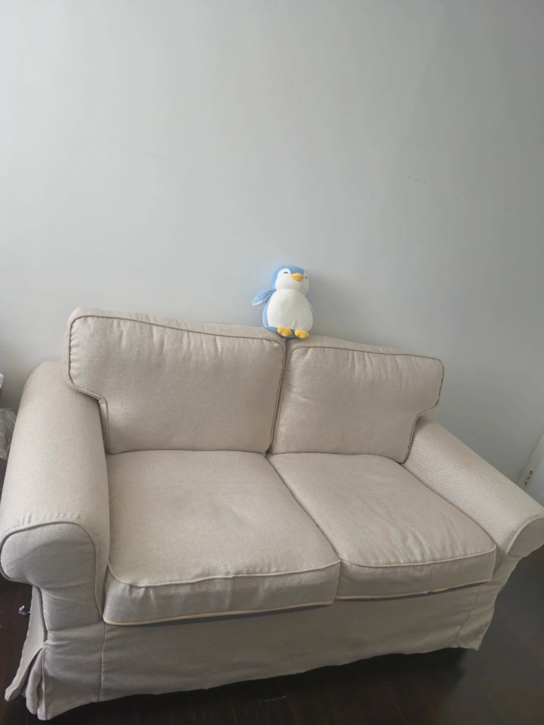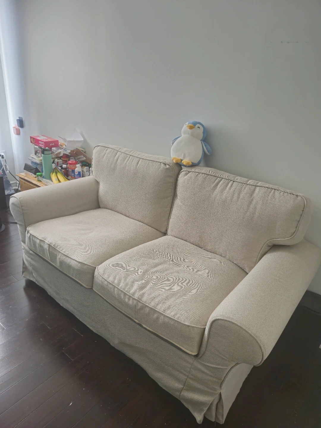 A comfortable loveseat sofa, upholstered in a light beige fabric. It's got a classic design with rolled arms. Great for a smaller living space or apartment!
