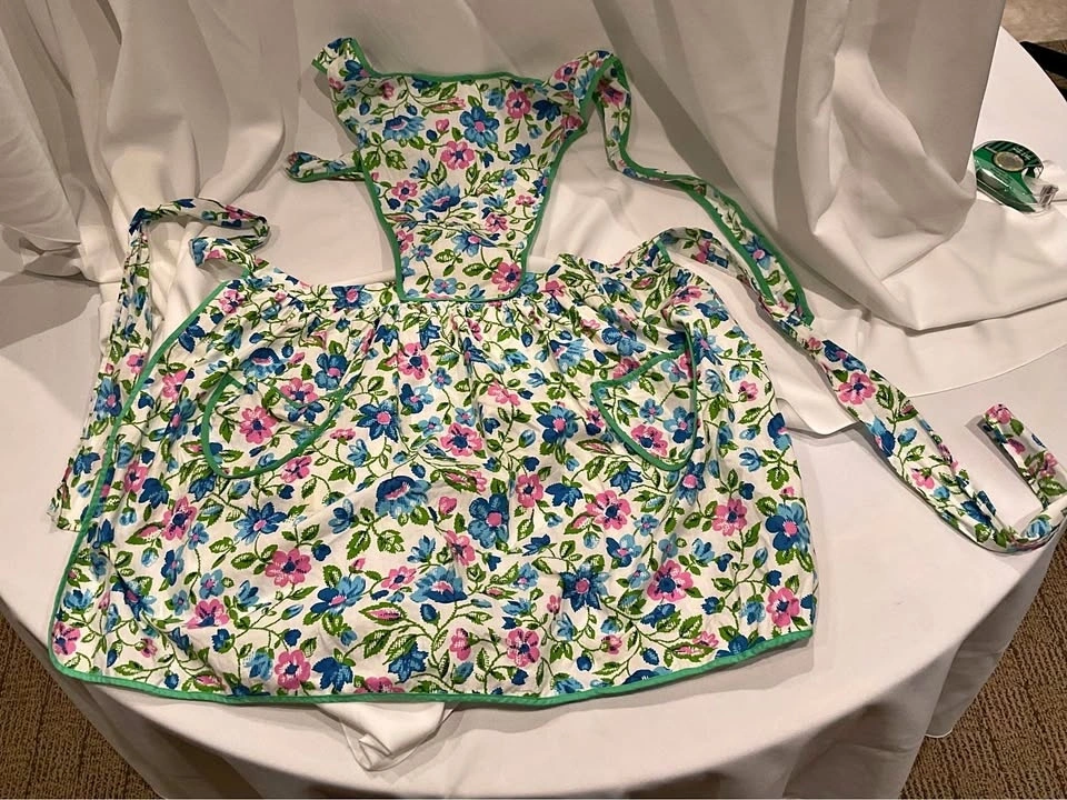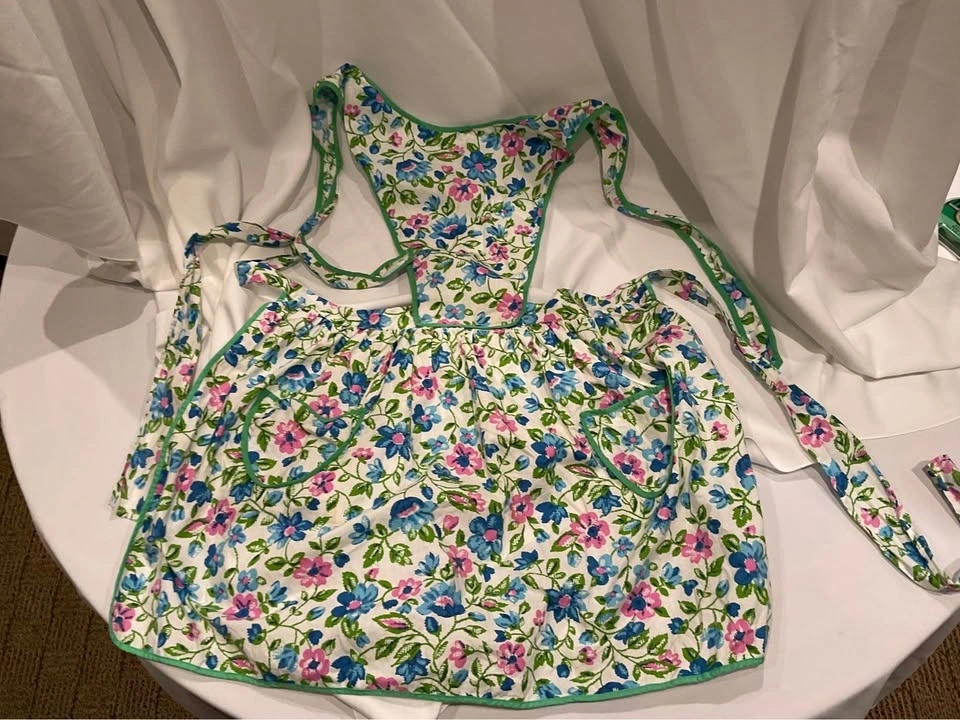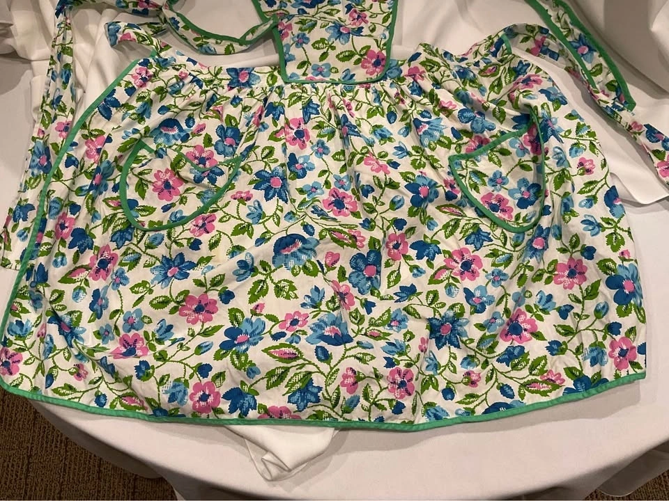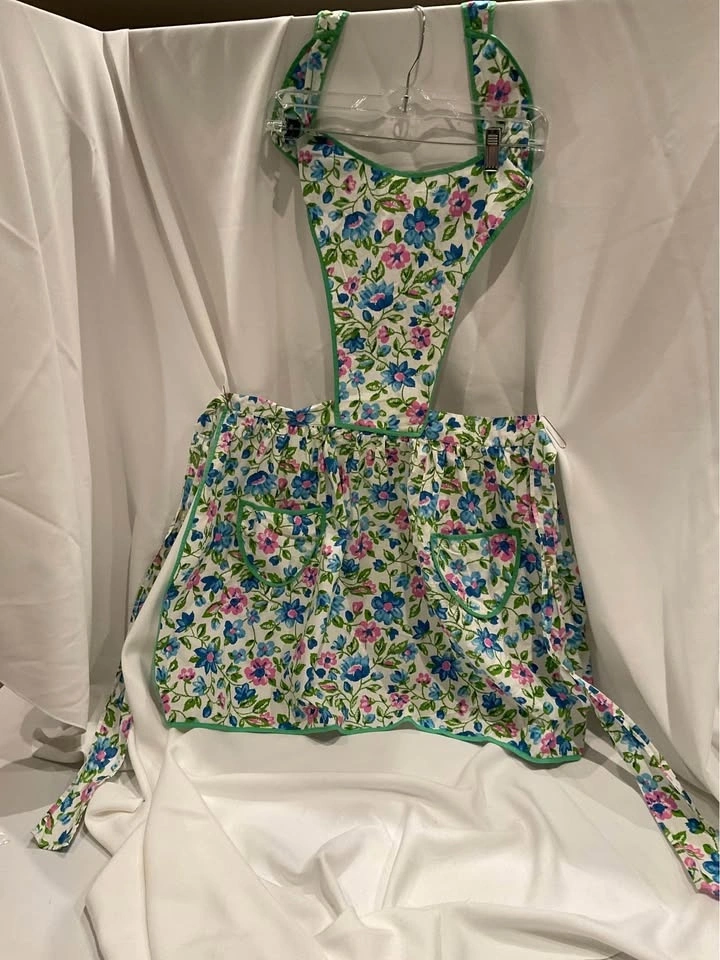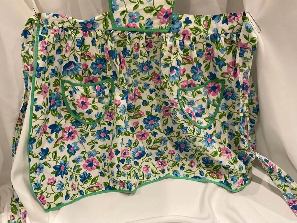 Beautiful vintage full floral apron from the 1950s. Features 2 front pockets. Good condition. Made of cotton. From a smoke and pet-free home. Located in Richmond Hill near Bathurst & King Rd.