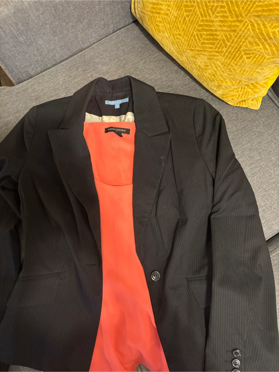 This is a Banana Republic black blazer with subtle pinstripes. It features a vibrant coral-coloured lining.