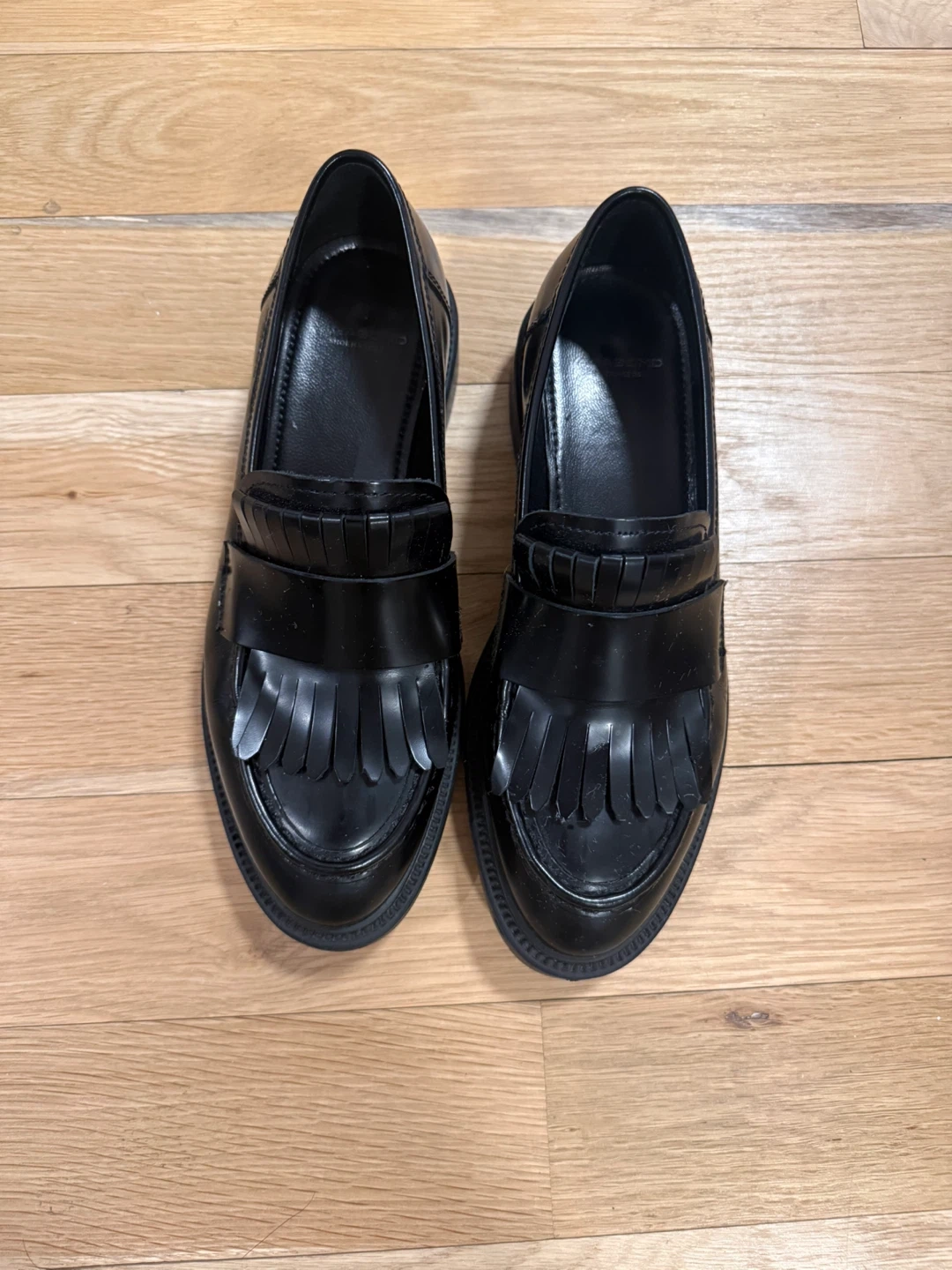 These are black leather loafers with fringe detailing. They're a classic loafer style. These shoes are made of leather.