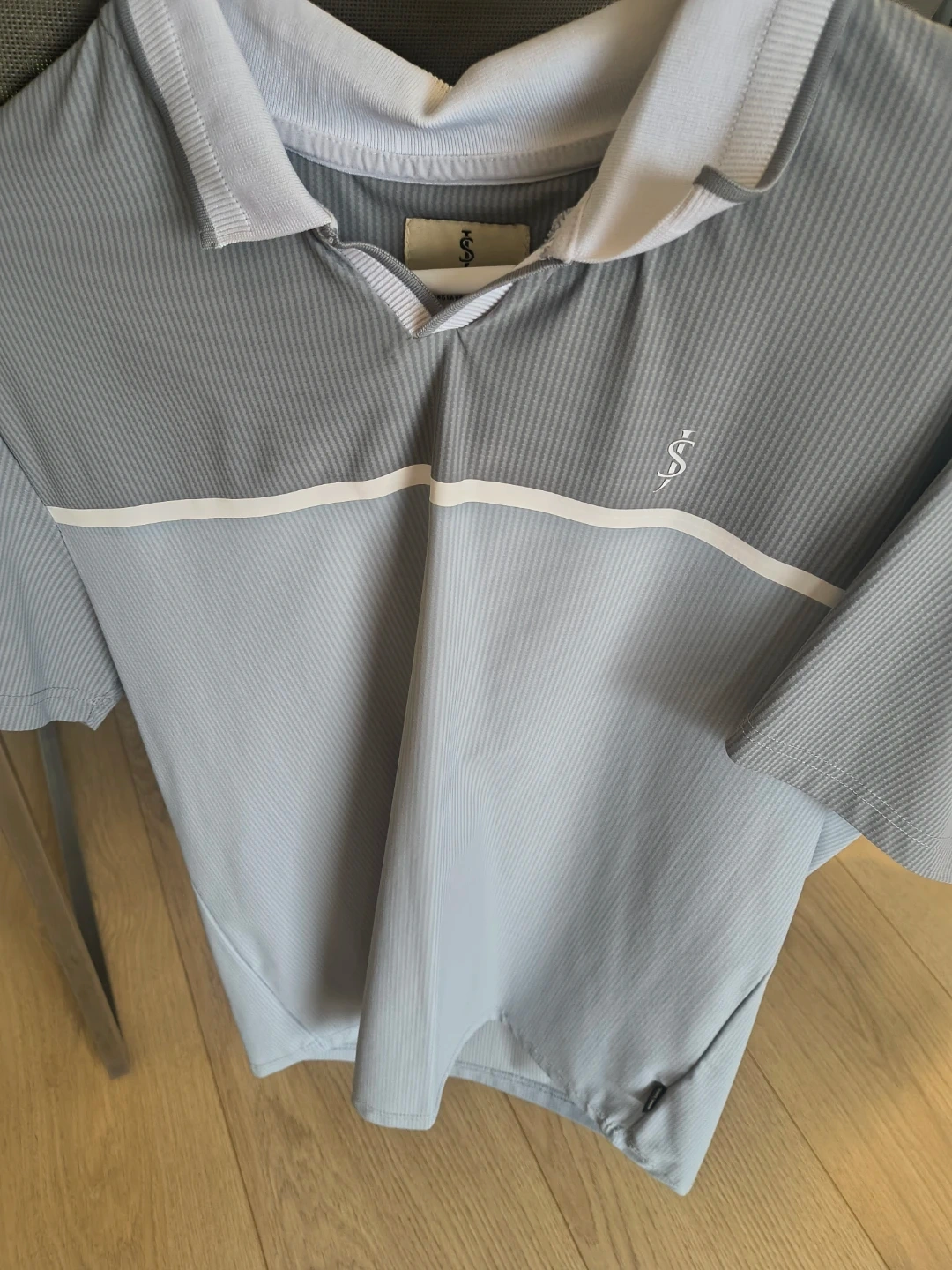 This is a gray polo shirt with a striped pattern. It features a white stripe across the chest. It has a comfortable collar and short sleeves.