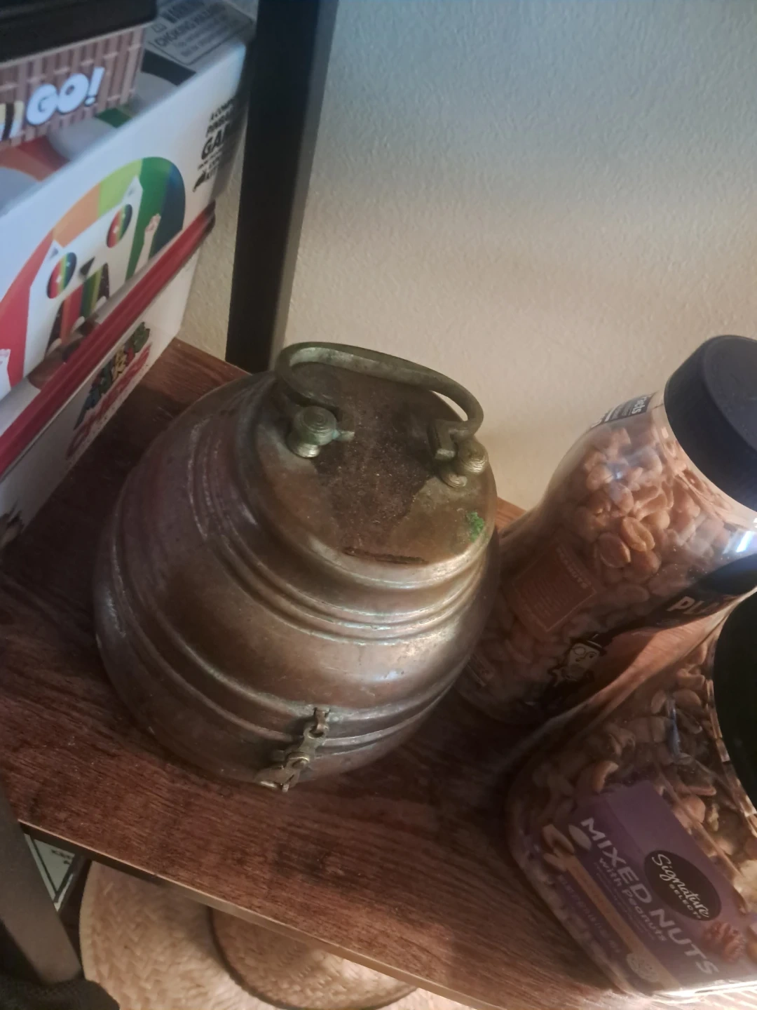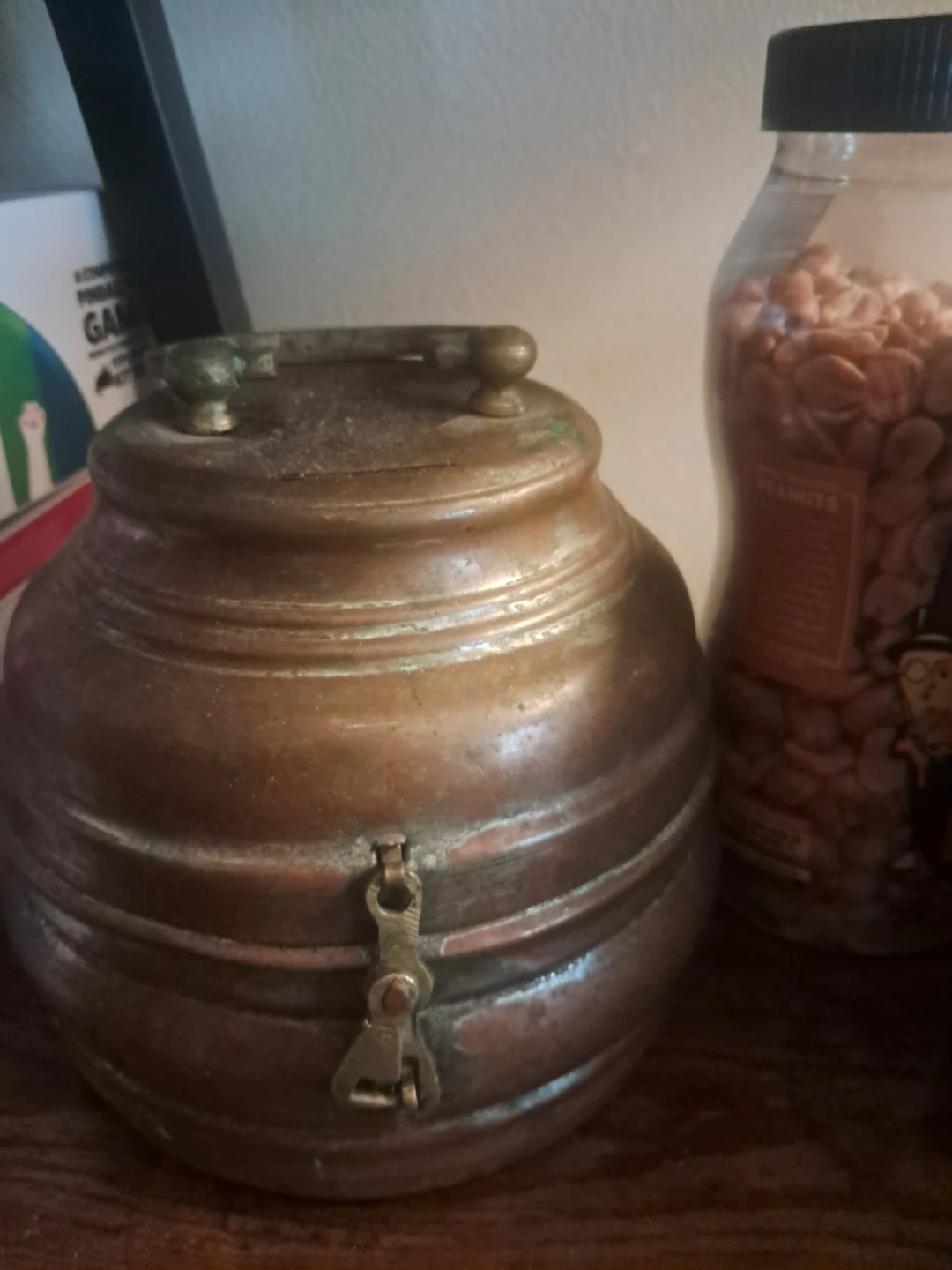 This is a vintage copper container with a hinged lid and latch closure. It has a distinct round, ribbed design and a sturdy top handle. Great for storing small trinkets or decorative items!
