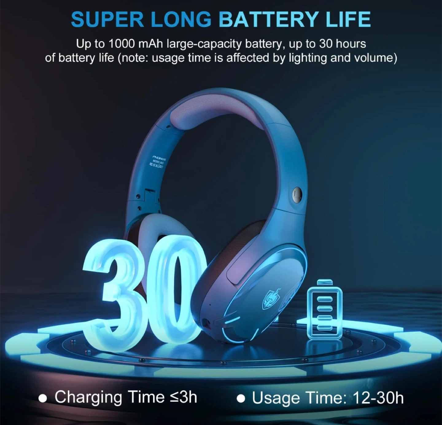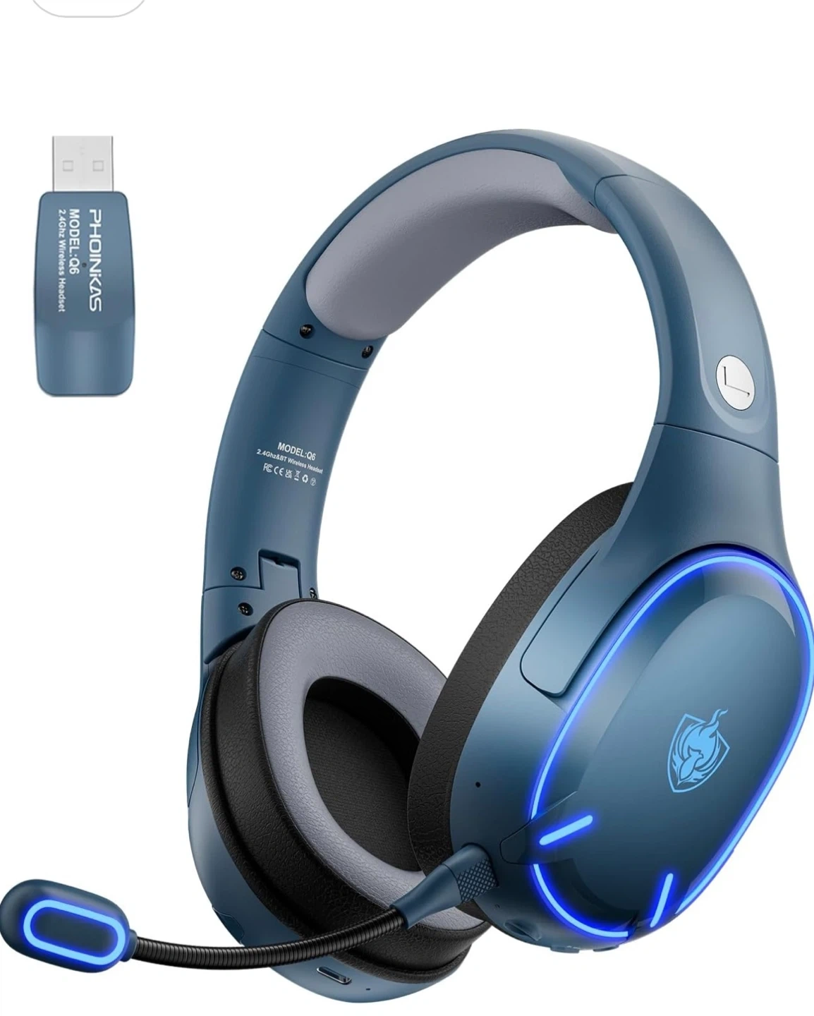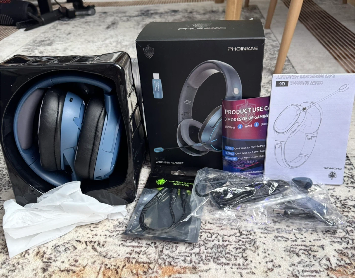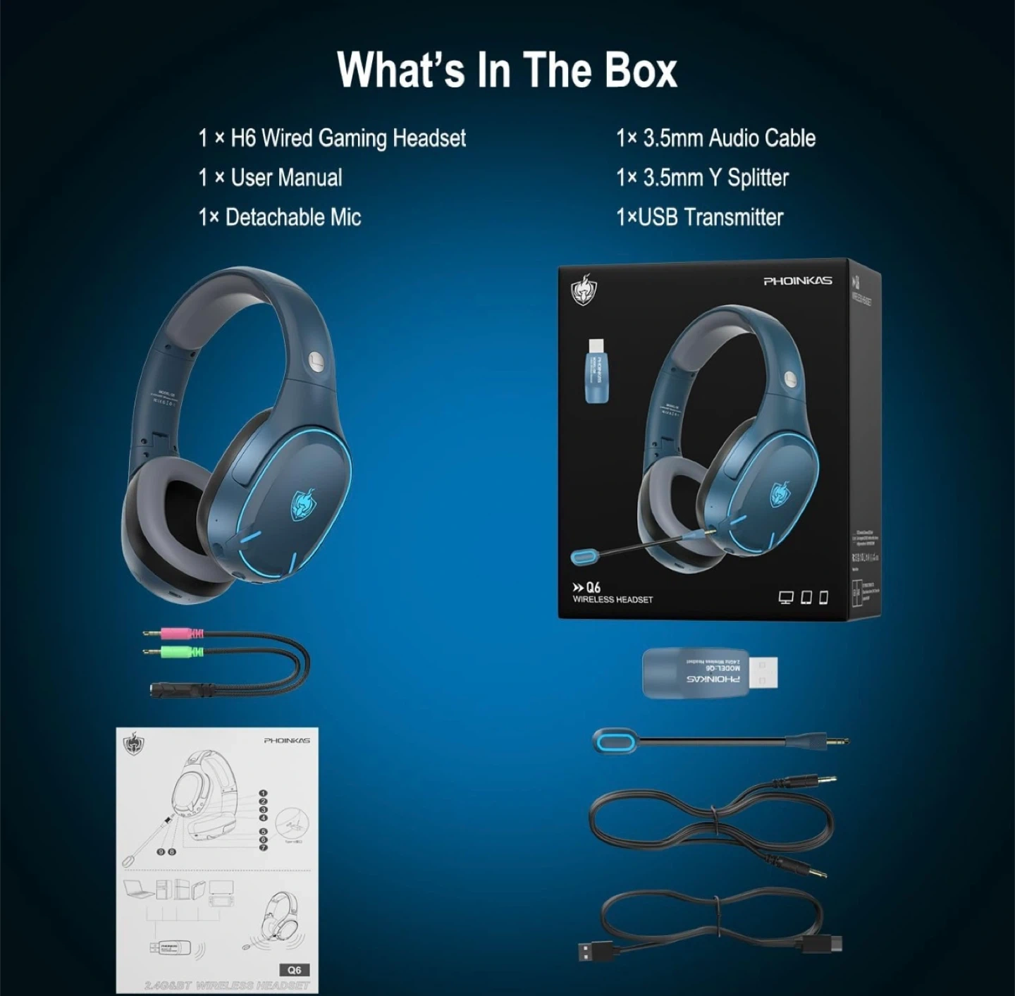 PHOINKAS Q6 wireless gaming headset. Comes with USB transmitter, audio cable, and Y splitter. Features detachable microphone and comfortable protein earmuffs for long gaming sessions. Up to 30 hours of usage time on a single charge.