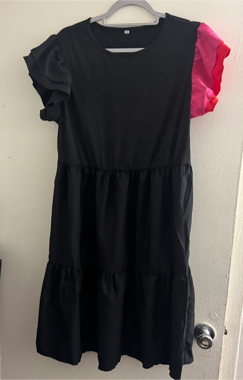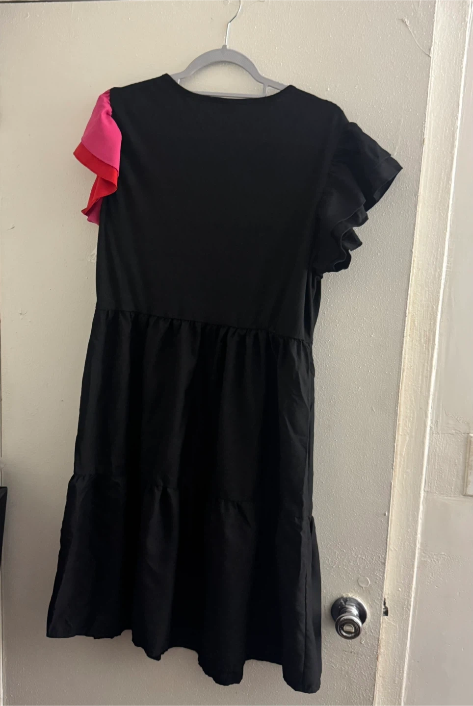 This black tiered dress features ruffled short sleeves and contrasting pink and red accents on one shoulder. It has a comfortable, flowy fit with a gathered waist. Size is medium.