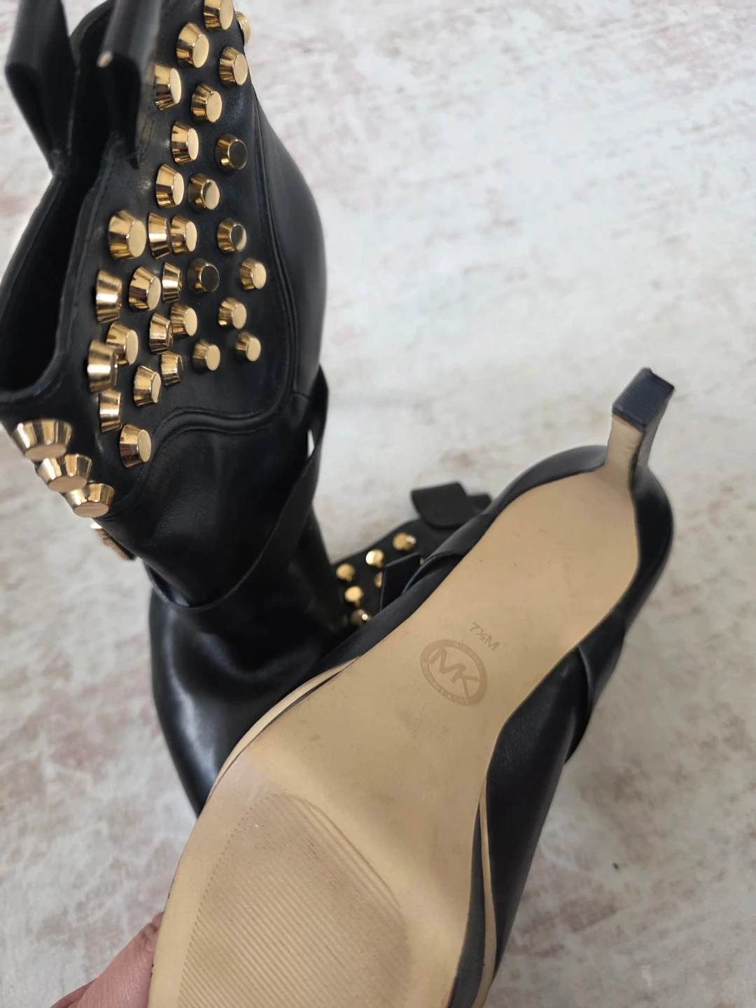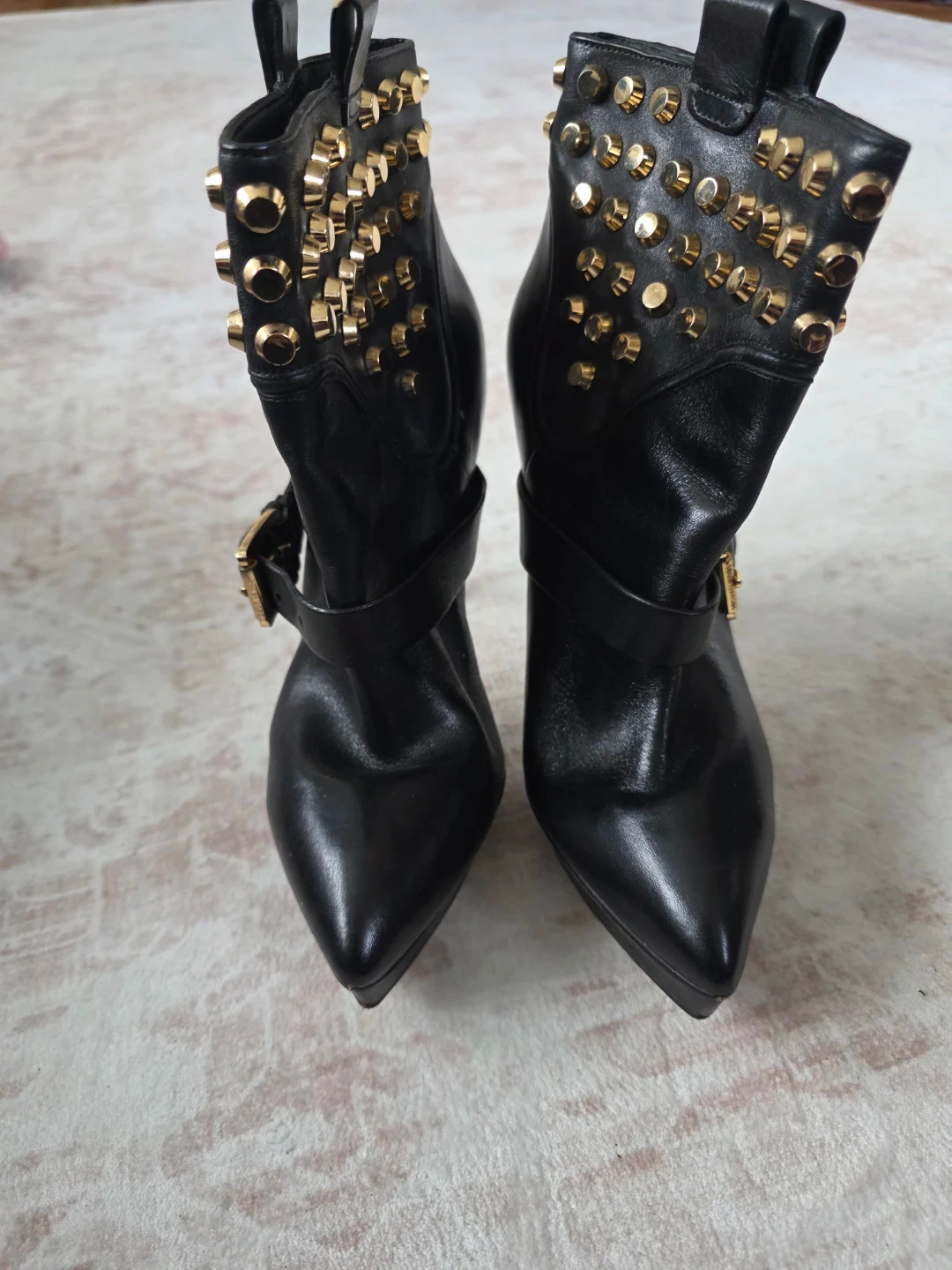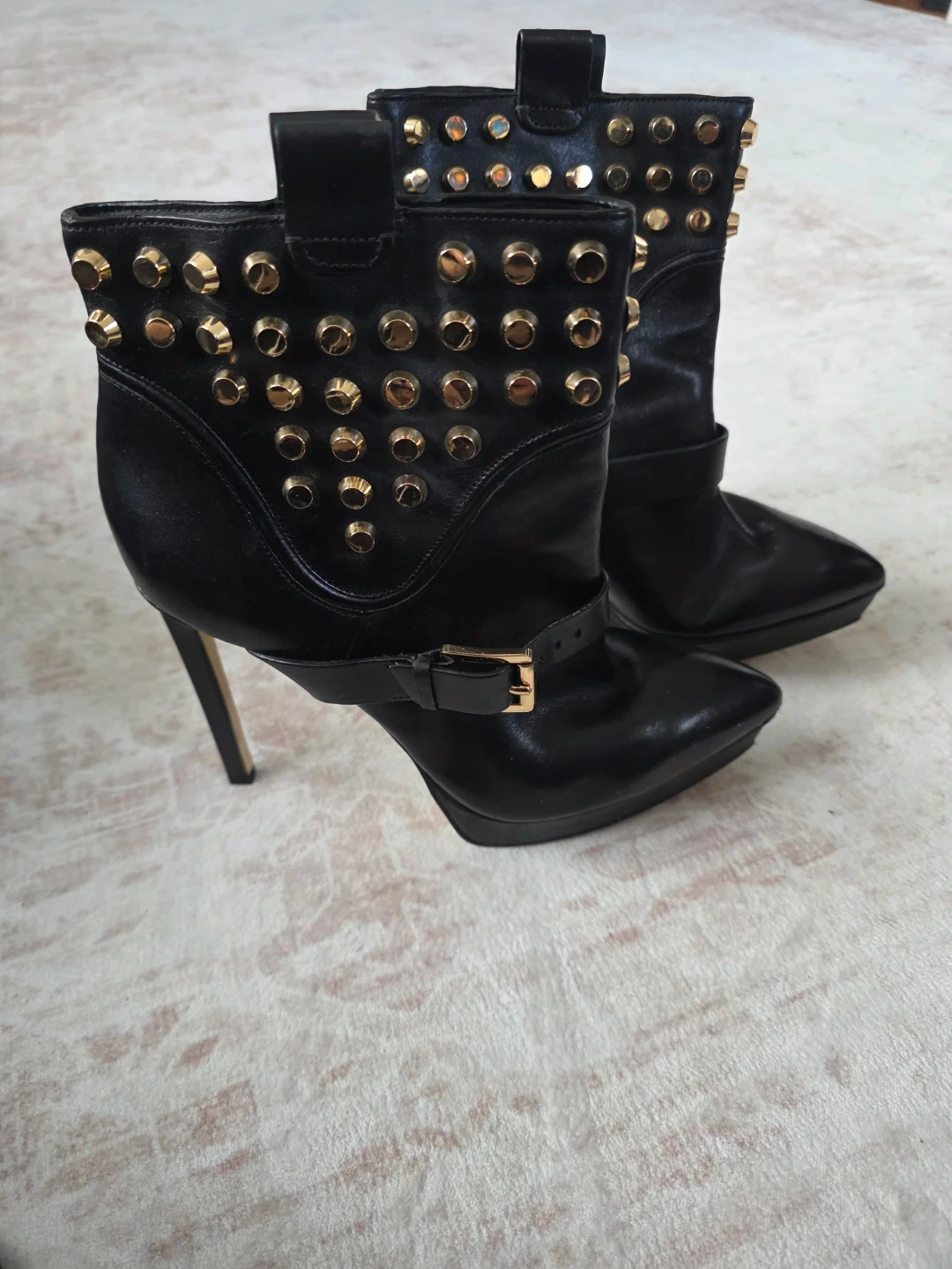Black leather ankle boots with gold-tone stud details and buckle straps. Heel height is approximately 4 inches. Size 7.5M.