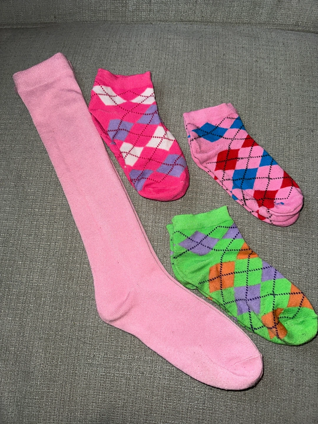 Giving away a Four pairs of socks are included. One pair is a solid pink knee-high sock. The other three pairs are ankle socks featuring argyle patterns in pink, green, and blue colorways. They're made of a soft fabric blend. Smoke free home. Cash /pick up only. 🙏🏽